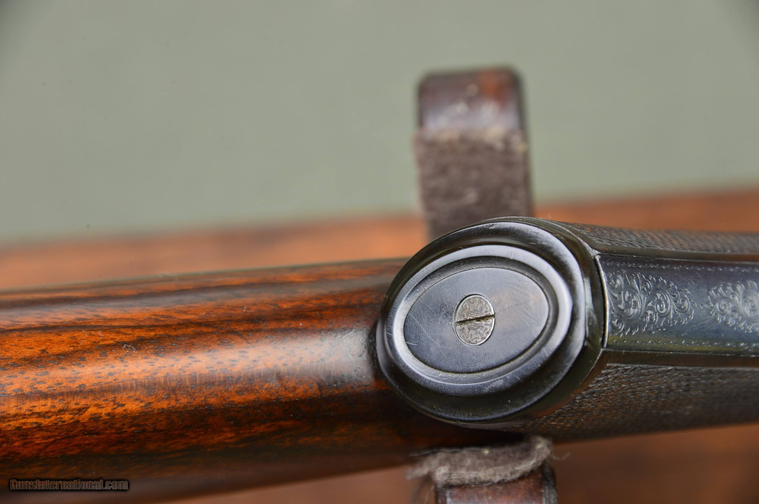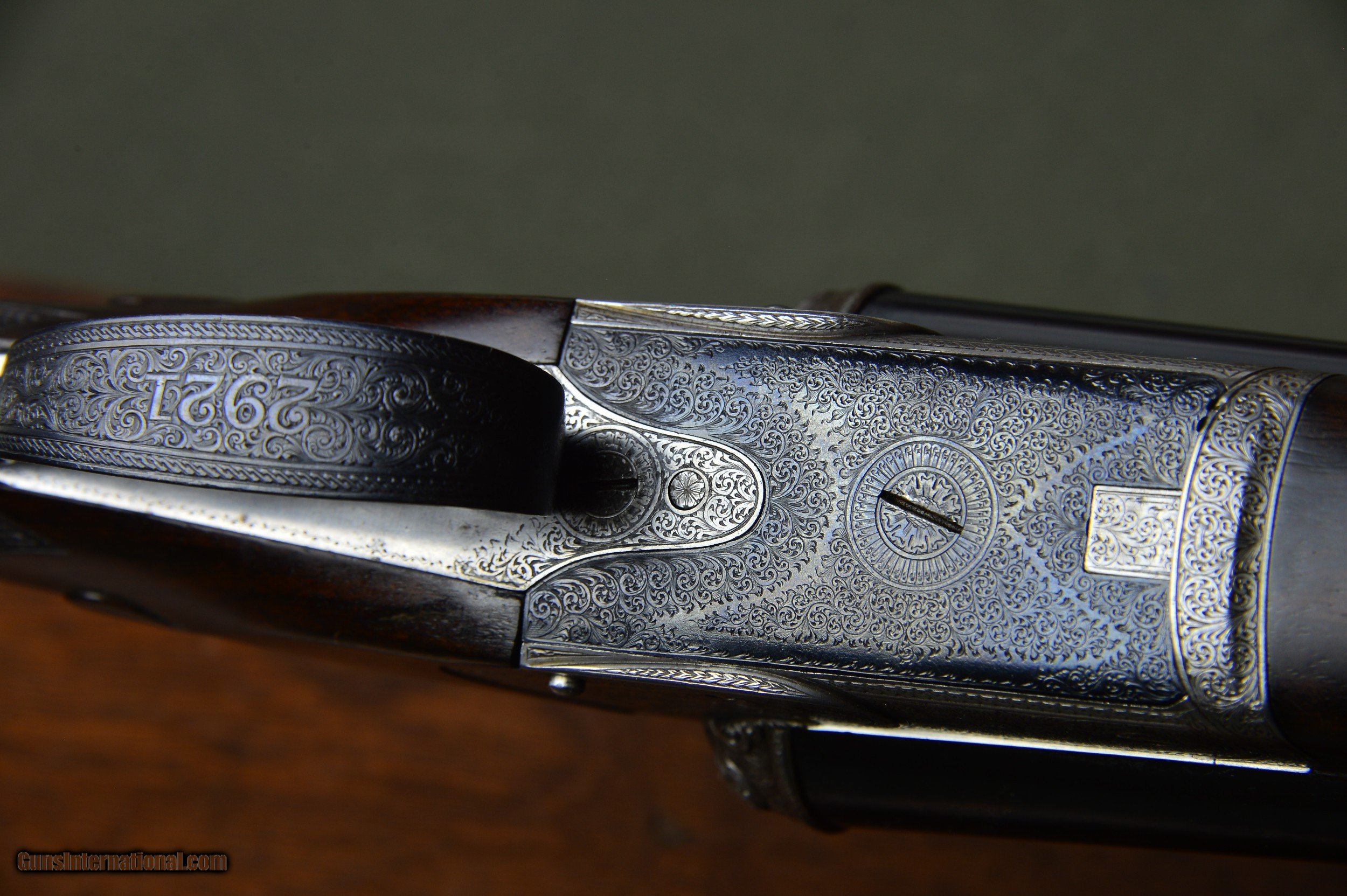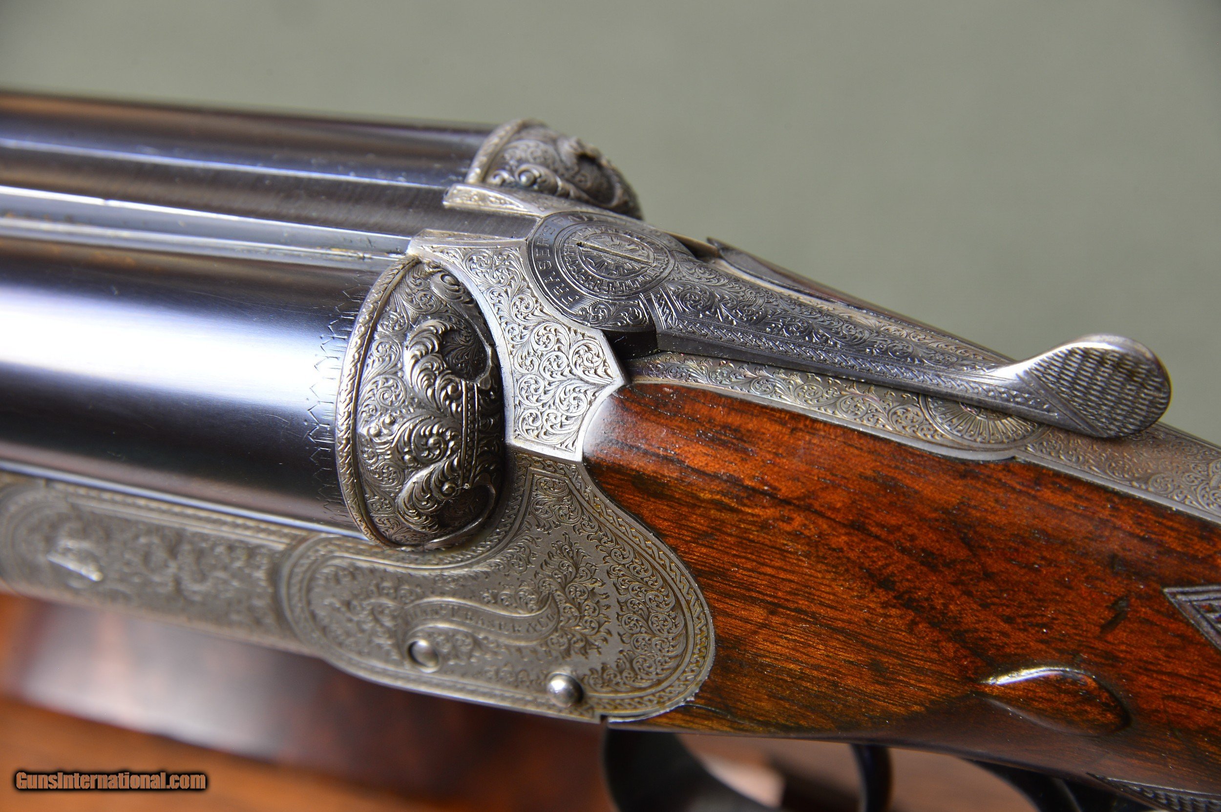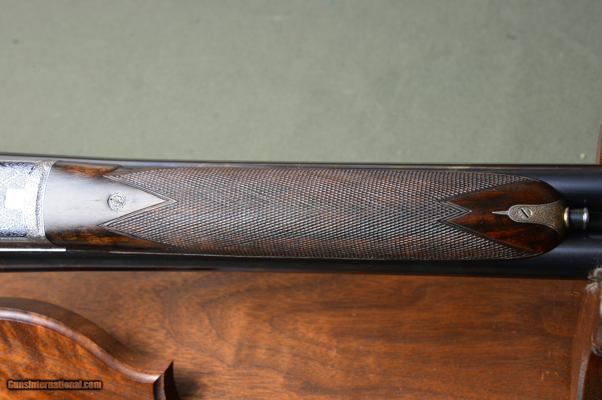 Description: *** SOLD *** Daniel Fraser & Son of Edinburgh are best known for their much sought-after rifles. However, few are aware that Fraser made a small number of unique and beautifully engraved boxlock shotguns of their own design. And here is a prime example. One of the most striking features of these special guns is their profuse and exquisite engraving. Full coverage of the action body and fantastically carved fences set this gun apart from any other. No. 2921 was manufactured in Scotland circa 1903 and has intercepting sears, gold washed internals, double triggers, auto ejectors, manual safety, and disc set strikers. It weighs 6lb 14oz. *** The original 30” chopper lump nitro steel barrels were London proofed in 2009 for 2-3/4” shotshells. The bores are shiny and the bluing is in excellent condition. The barrels are topped by a raised solid concave hand filed rib. The rib is inscribed “Dan’l Fraser & Co. Gun & Rifle Manufacturers 4 Leith St Terrace Edinburgh”. The right barrel is bored 0.729 with a constriction of 0.07 for Light Improved Cylinder choke. Minimum wall thickness is 0.027. The left barrel is also bored 0.727 and has a constriction of 0.015 for Light Modified choke. Minimum wall thickness is 0.026. *** The pistol grip stock and splinter forearm are made of highly figured French walnut. The checkering is crisp. Stock dimensions are 15-1/8” including a 3/4" leather recoil pad by 1-1/2” by 2-1/4”. Cast off for the righthand shot. *** Shooters and collectors of Scottish shotguns will understand that this is a rare opportunity to purchase one of these rare Frasers. This great handling double is a joy to shoot and to behold. Move quickly before it gets away. *** I am an FFL and will need a signed copy of your dealer’s FFL. Buyer is responsible for all shipping, insurance, and any other related charges. I give a 3-day non-firing inspection period which begins when the gun is delivered to purchaser’s FFL dealer or directly to the purchaser if the gun is classified as an Antique. Will only accept returns at buyer’s expense. SOLD |