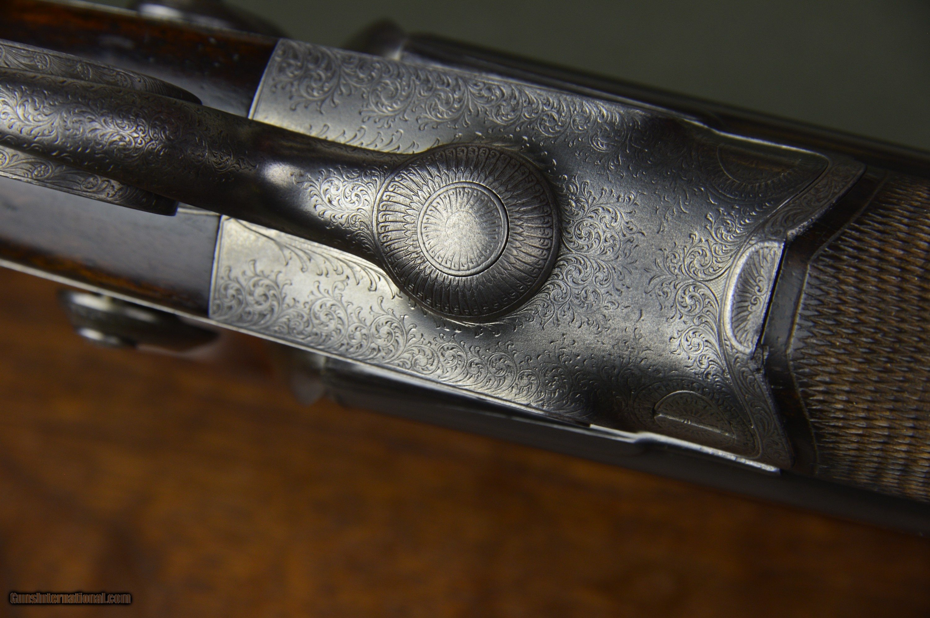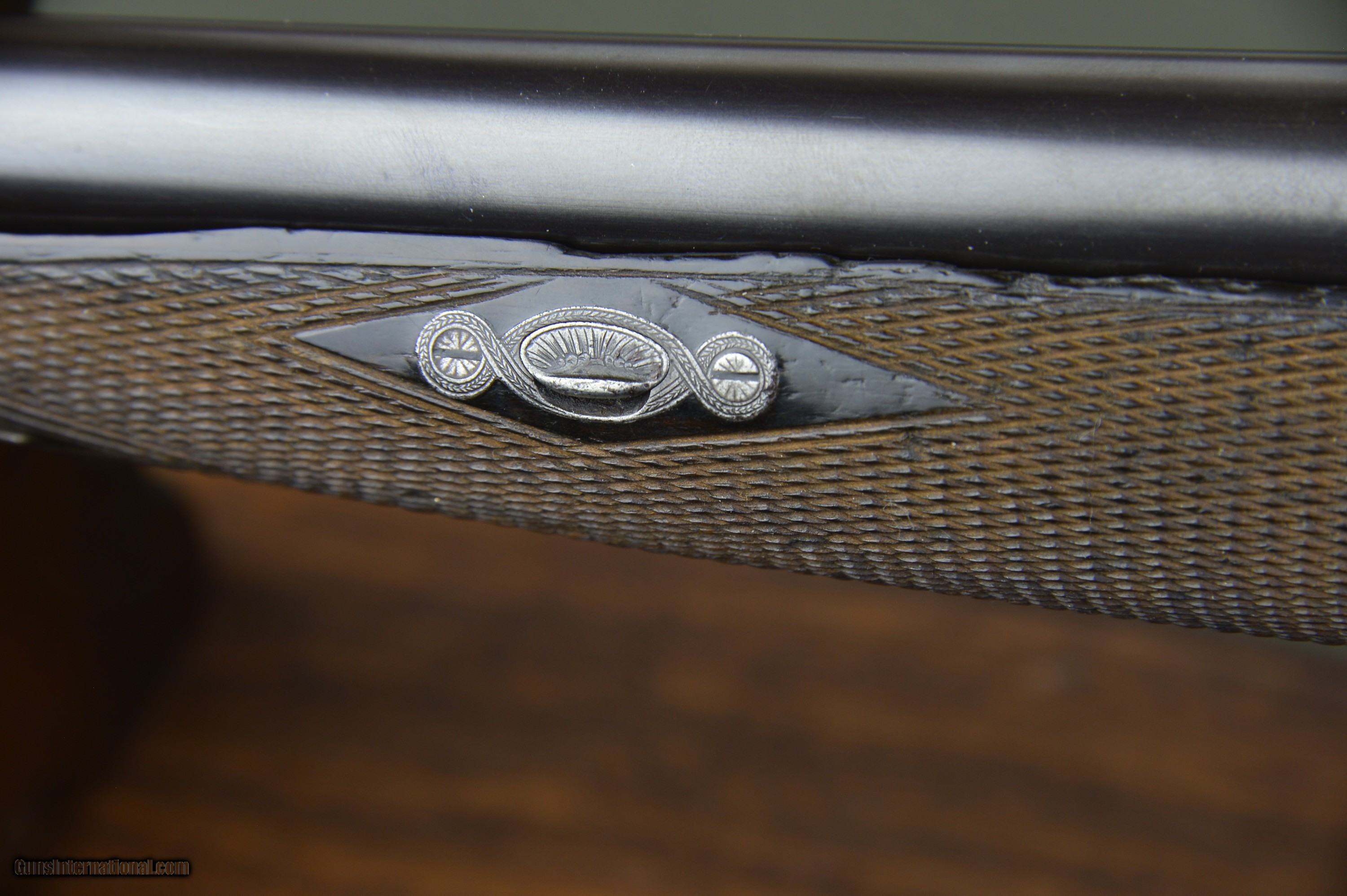 Description: Handsome John Dickson & Son 12 bore hammergun with rare grip safety and Jones rotary lever opening. Bluing is in very good condition and the stock and forearm have been refinished recently. Dolphin high non-rebounding hammers, extractors, and weighs 6lb 7oz.. According to the Dickson records number 2836 was delivered on June 6, 1868 to a Dr. Douglas. It has a gold stock oval with the word "Forward" on it signifying Clan Douglas whose motto was "Jamais arriere" "Forward, Never Behind". Great handling hammergun. *** The 28” nitro steel barrels were sleeved, are tight on face, and are in great condition. They are chambered for 2-1/2” shotshells and are topped by a raised, solid concave rib. The rib is inscribed “John Dickson & Son. 63 Princes Street. Edinburgh”. The right barrel is bored 0.728 with a constriction of 0.013 for Improved Cylinder choke. Minimum wall thickness is 0.033. The left barrel is also bored 0.728 and has a constriction of 0.030 for Full choke. Minimum wall thickness is 0.031. The bores are shiny and the bluing is in great condition but there are a few minor scrapes from normal usage. *** The stock and forearm are made of nicely figured straight grain French walnut. They have recently refinished in a satin finish. Checkering is crisp. The forearm has an engraved wedge style fastener and the stock is finished off with a thin checkered horn buttplate. Both have a few handling marks and the right side of the forearm wood shows some damage where the wood meets the sides of the barrel that can be easily and inexpensively repaired. Stock dimensions are 14-1/4” including the thin horn buttplate by 1-5/8” by 2-3/8”. Slightly cast off for the righthand shot. *** This Dickson is a very handsome and sleek bar action hammergun that has recently been refurbished. Like most of the hammerguns of this era it is very svelte and handles quite well. Great bird or clays gun. *** Please note that the photographs are part of the description. Not for sale where prohibited by state or local laws. Buyer is responsible for all shipping, insurance, and any other related charges. I give a 3-day non-firing inspection period which begins when it arrives at the buyer’s FFL or specified address if the gun is classified as an Antique. Returns at buyer’s expense. SOLD Antique: Yes |