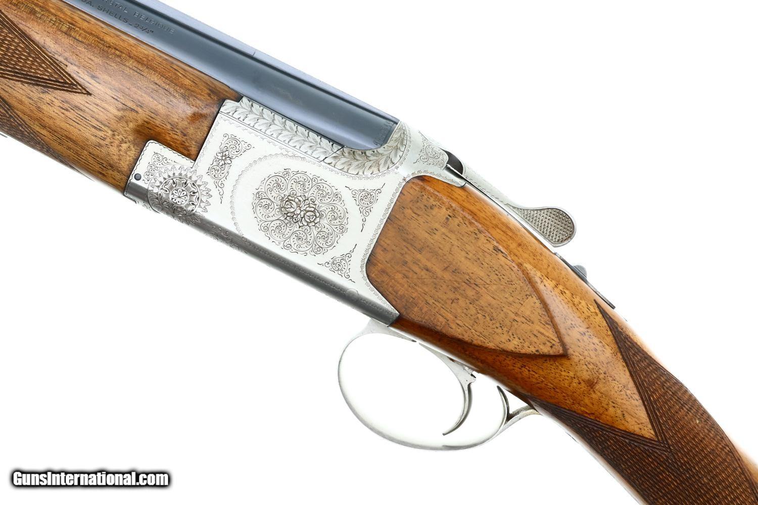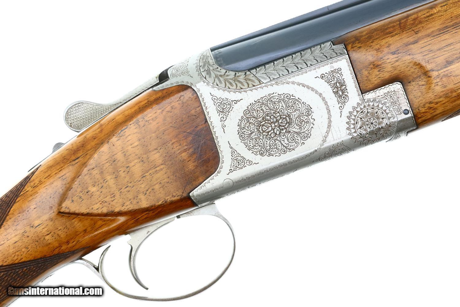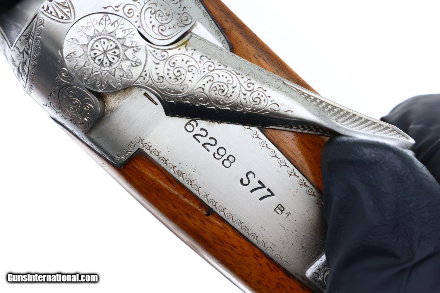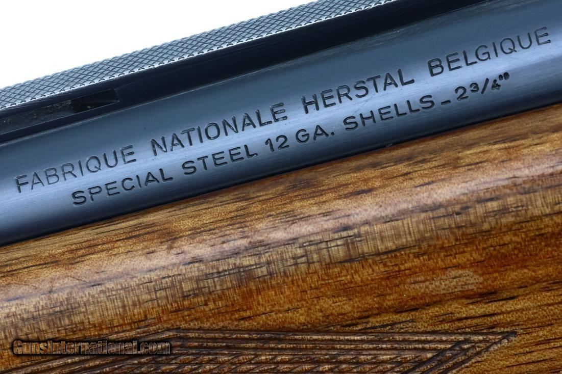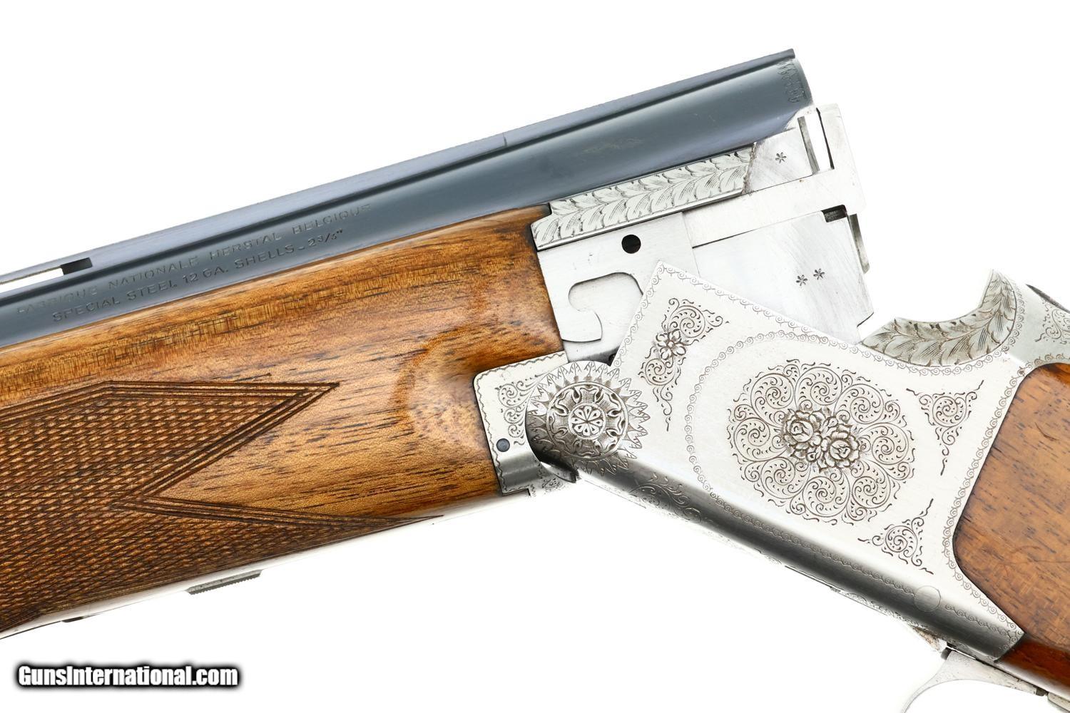 Fabrique Nationale B25 12 gauge Superposed Shotgun with 2 3/4" chambers, 27.5" barrels choked M/F, automatic ejectors, single selective trigger, made 1977. Blued Special Steel barrels with a single bead sight on knurled vent rib, standard markings, light engraving at the breech, chokes marked "**"/"*" (modified/full), and 2 3/4 inch chambers with ejectors. Coin finished action with the B1 pattern engraving centered around floral rosettes surrounded by tight scrolls. Single selective trigger with gold inlaid "S", "O", and "U" indicators. Fitted with checkered Schnabel forend having engraved latch and a straight grip "perch belly" buttstock with a factory buttplate. Includes a quick-detach sling, retaining stud on buttstock, canvas/leather sling, and a pair of snap caps. Stock measurements: 1 9/16 inch drop at comb; 2 5/16 inch drop at heel; 14 1/4 inch length of pull. Weight 6 lbs. 14 oz.