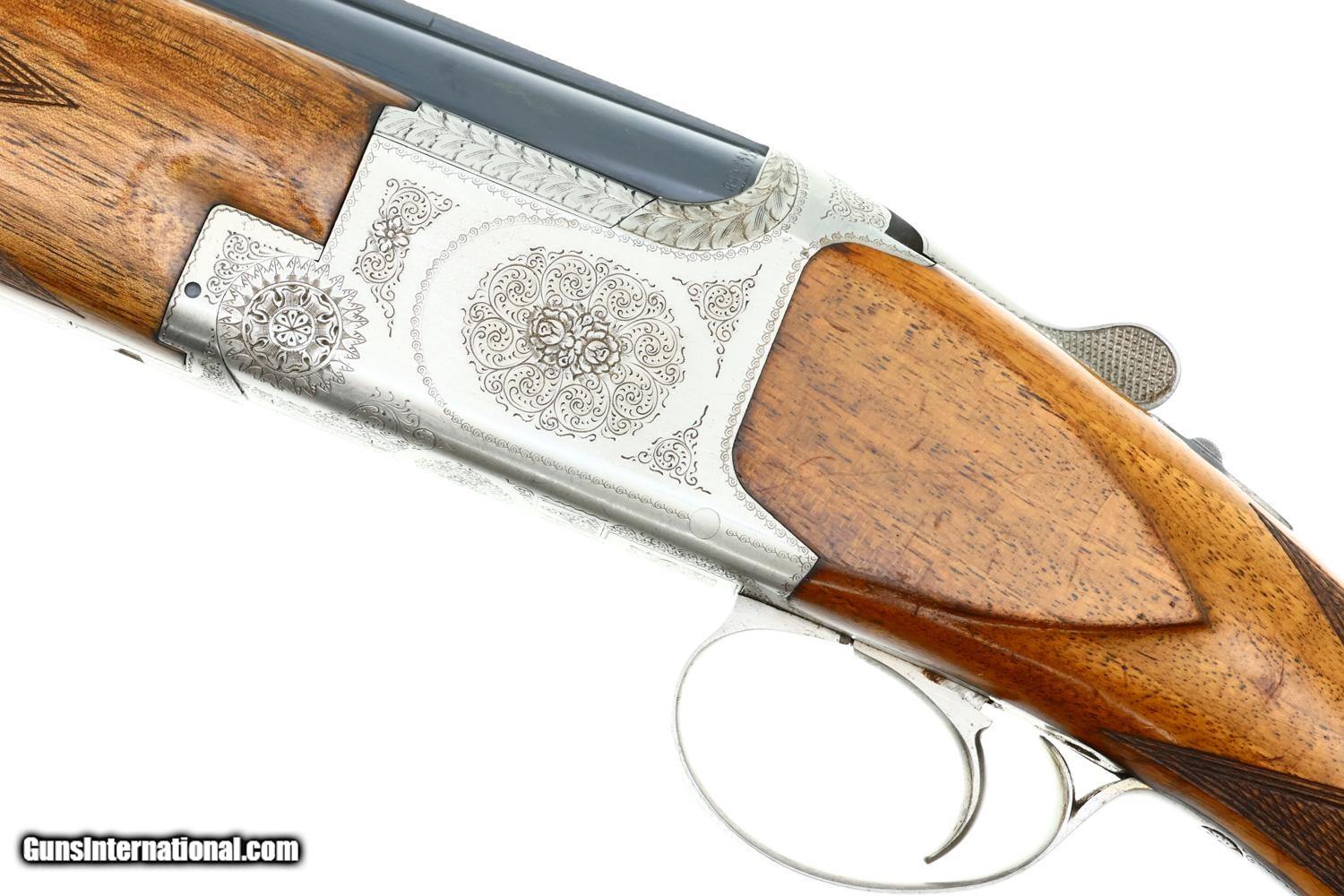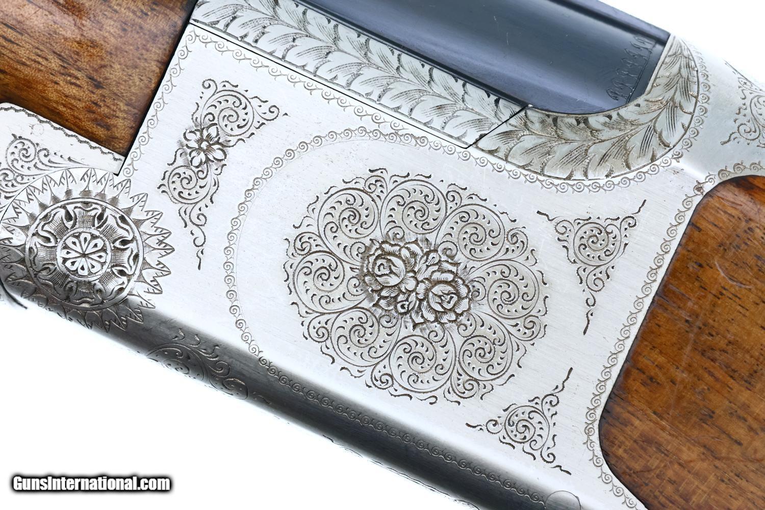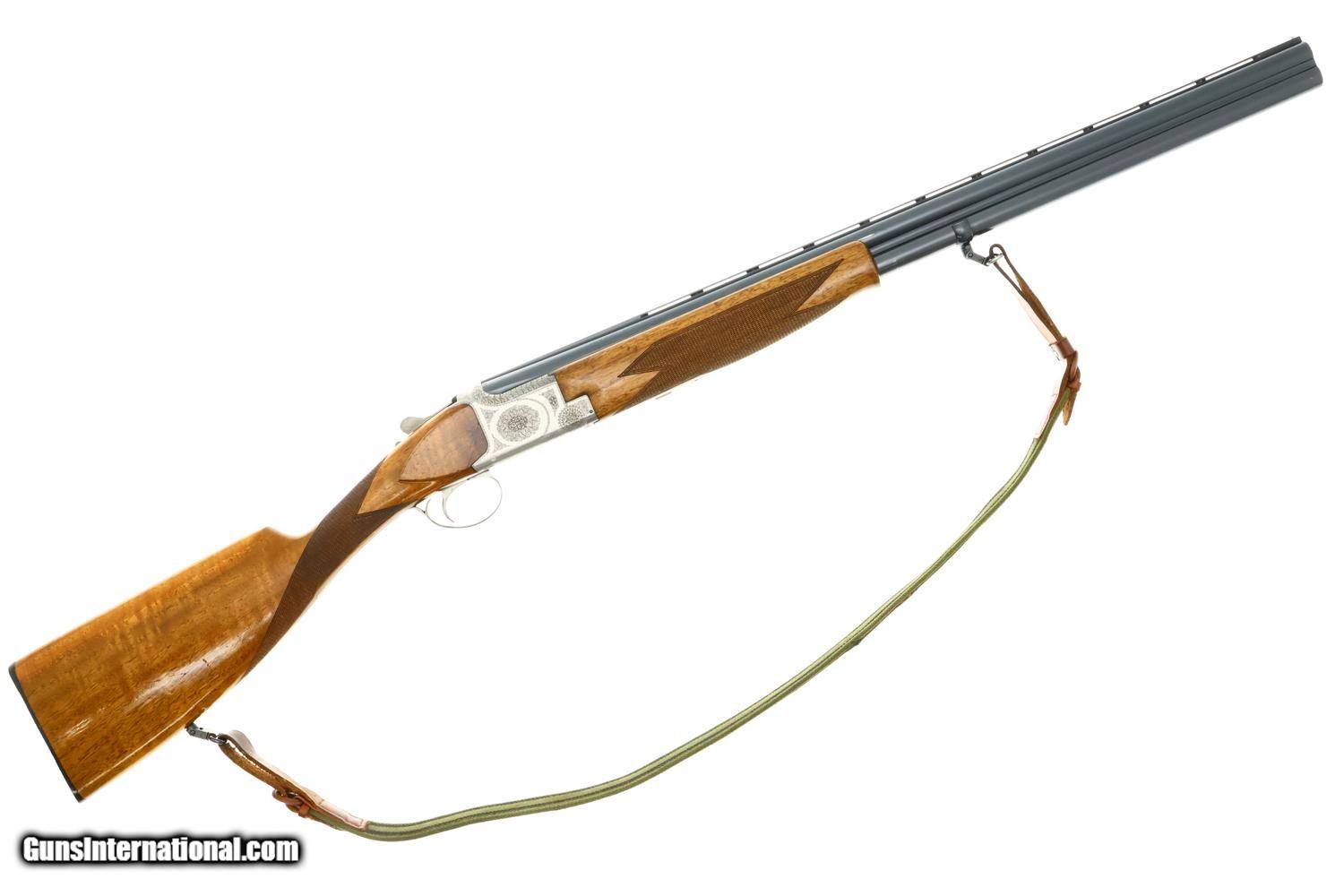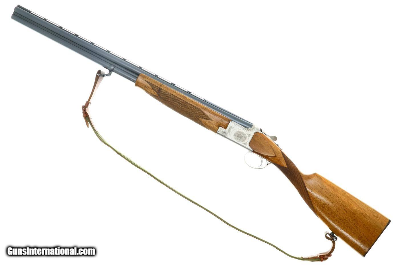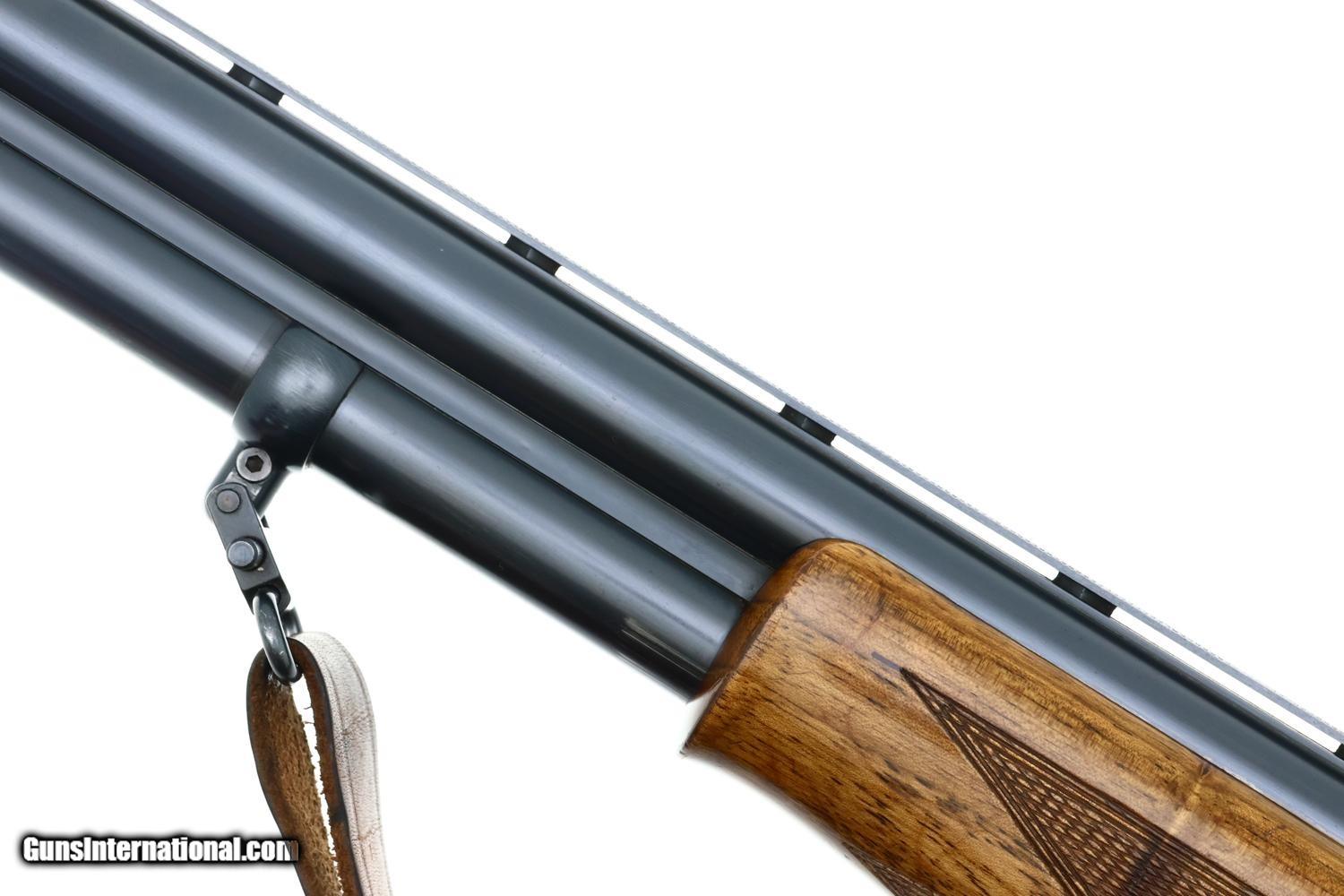 Fabrique Nationale B25 12 gauge Superposed Shotgun with 2 3/4" chambers, 27.5" barrels choked M/F, automatic ejectors, single selective trigger, made 1977. Blued Special Steel barrels with a single bead sight on knurled vent rib, standard markings, light engraving at the breech, chokes marked "**"/"*" (modified/full), and 2 3/4 inch chambers with ejectors. Coin finished action with the B1 pattern engraving centered around floral rosettes surrounded by tight scrolls. Single selective trigger with gold inlaid "S", "O", and "U" indicators. Fitted with checkered Schnabel forend having engraved latch and a straight grip "perch belly" buttstock with a factory buttplate. Includes a quick-detach sling, retaining stud on buttstock, canvas/leather sling, and a pair of snap caps. Stock measurements: 1 9/16 inch drop at comb; 2 5/16 inch drop at heel; 14 1/4 inch length of pull. Weight 6 lbs. 14 oz.