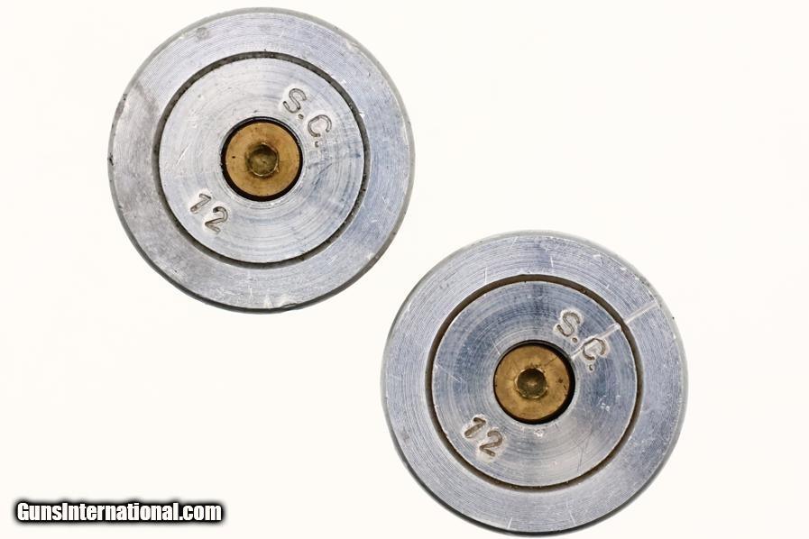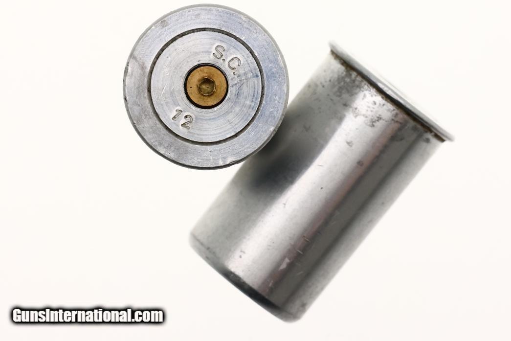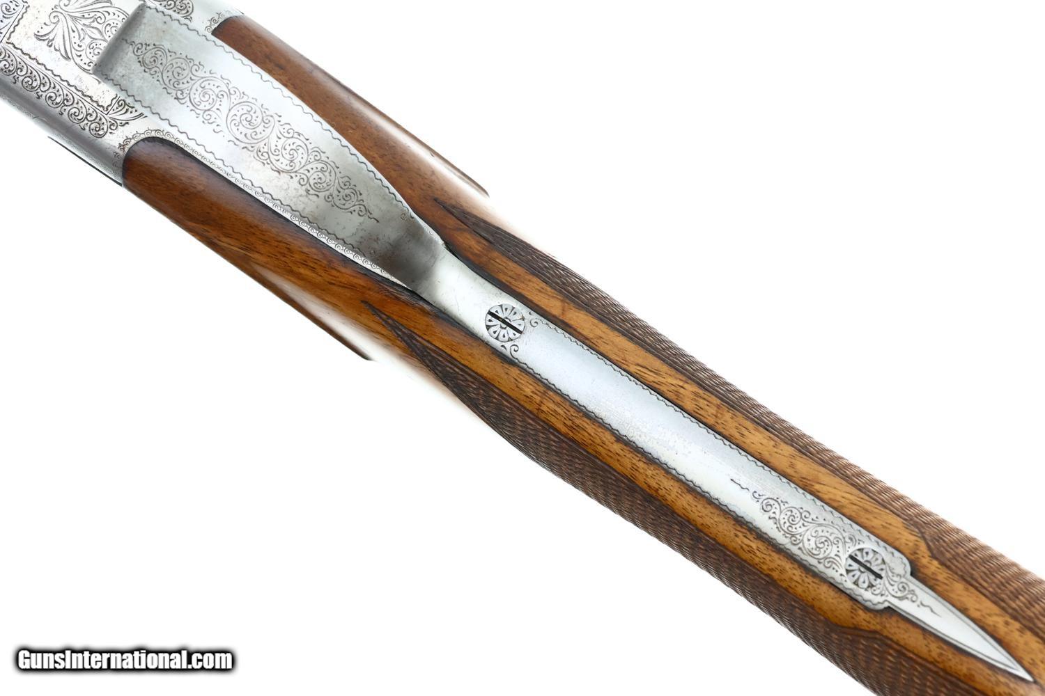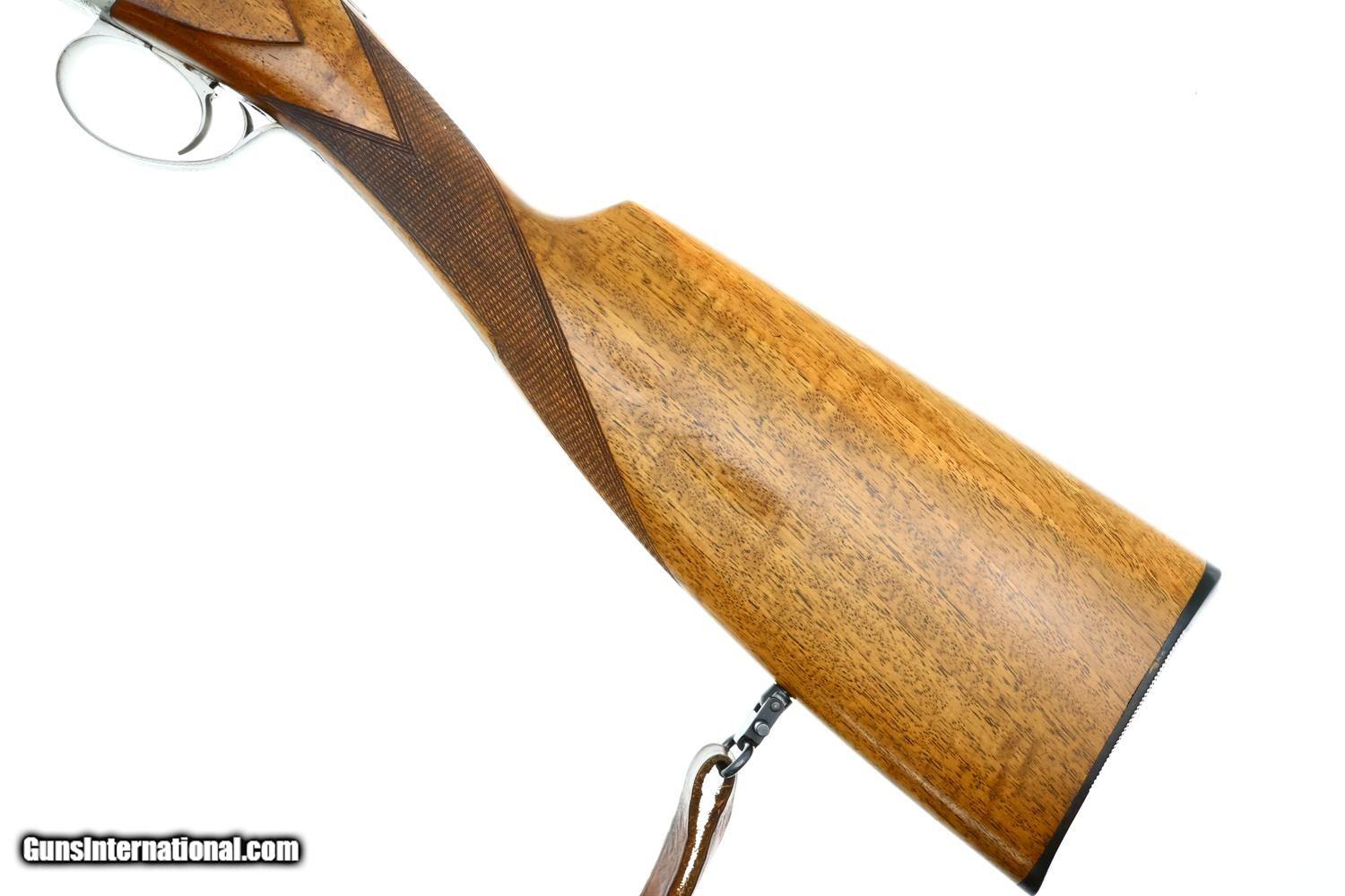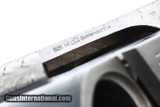 Description: Synopsis: Attractive, Factory Engraved Fabrique Nationale B25 12 gauge Superposed Shotgun F/M with Coin Finish, B1 Pattern Rosettes, Schnabel forend and "Perch Belly" straight grip buttstock. A very high quality shotgun with just enough wear to take on your next hunt! Description: Fabrique Nationale B25 12 gauge Superposed Shotgun with 2 3/4" chambers, 27.5" barrels choked M/F, automatic ejectors, single selective trigger, made 1977. Blued Special Steel barrels with a single bead sight on knurled vent rib, standard markings, light engraving at the breech, chokes marked "**"/"*" (modified/full), and 2 3/4 inch chambers with ejectors. Coin finished action with the B1 pattern engraving centered around floral rosettes surrounded by tight scrolls. Single selective trigger with gold inlaid "S", "O", and "U" indicators. Fitted with checkered Schnabel forend having engraved latch and a straight grip "perch belly" buttstock with a factory buttplate. Includes a quick-detach sling, retaining stud on buttstock, canvas/leather sling, and a pair of snap caps. Stock measurements: 1 9/16 inch drop at comb; 2 5/16 inch drop at heel; 14 1/4 inch length of pull. Weight 6 lbs. 14 oz. Condition: Very good overall, retaining 97-98% original blue and coin finishes with light handling marks and minor spotting. Comparable condition wood with scattered handling marks, fine scratches and superficial scuffs, the buttstock with added varnish. Mirror bright bores. Correct manual mechanics. Manufacturer: FN Model: B25 12 gauge Shotgun Serial Number: 62298577 Caliber Info: 12ga Condition: VG Price: $3,995.00 Contact Seller |