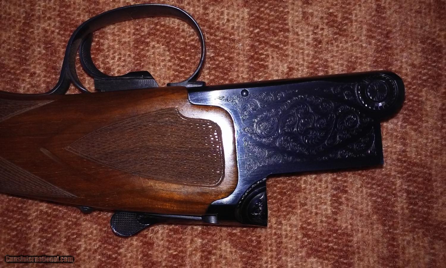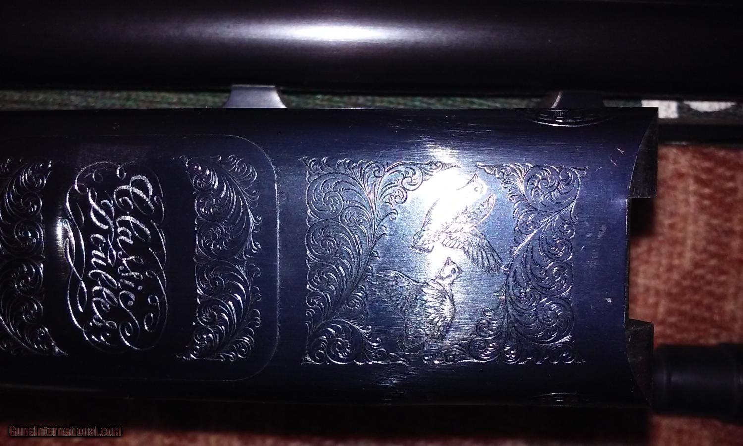 Description: Beautiful little 20 gauge 101 with 28 inch winchoked barrels. Made by classic doubles with a fully engraved receiver with to quail on the bottom. Stunning feather crotch walnut hand checkered stock with an adjustable comb. The gun comes with choke wrench, and 5 flush mount choke tubes. 2 skeet, one improve cylinder, 1 modified, and 1 full. the gun also comes with a set of 28 gauge sub gauge tubes and 410 sungauge tubes made by Briley. The sub gauge tubes are all choked skeet and skeet. It comes in and SKB skeet tube set hard case. I hate to part with this little gun but I don't shoot it enough to warrant keeping it, and I'm trying to scrape together enough money to buy a Krieghoff skeet set. All reasonable offers considered. If you have any questions please contact Brian at 541-331-2448 What's a "CLASSIC DOUBLES"? In 1987, when Olin Corp. decided to get the rest of the way out of the gun manufacturing business (after having sold the New Haven, Conn. operations to U.S. Repeating Arms), they sold their Japanese factory to a newly formed company - Classic Doubles International. This new firm continued using the same factory, machinery, people, tooling, and designs to produce their versions of the 101, mechanically near identical, but cosmetically different. Most mechanical parts of the C.D. are identical and interchangeable with the Winchester. Quality and workmanship levels are essentially the same. Due to lack of sufficient sales volume to support the operations, they went bankrupt after about 2 years. Due to limited production of Classic Doubles guns, they are becoming as sought after as the Winchester versions (some variations even more so!). SOLD |