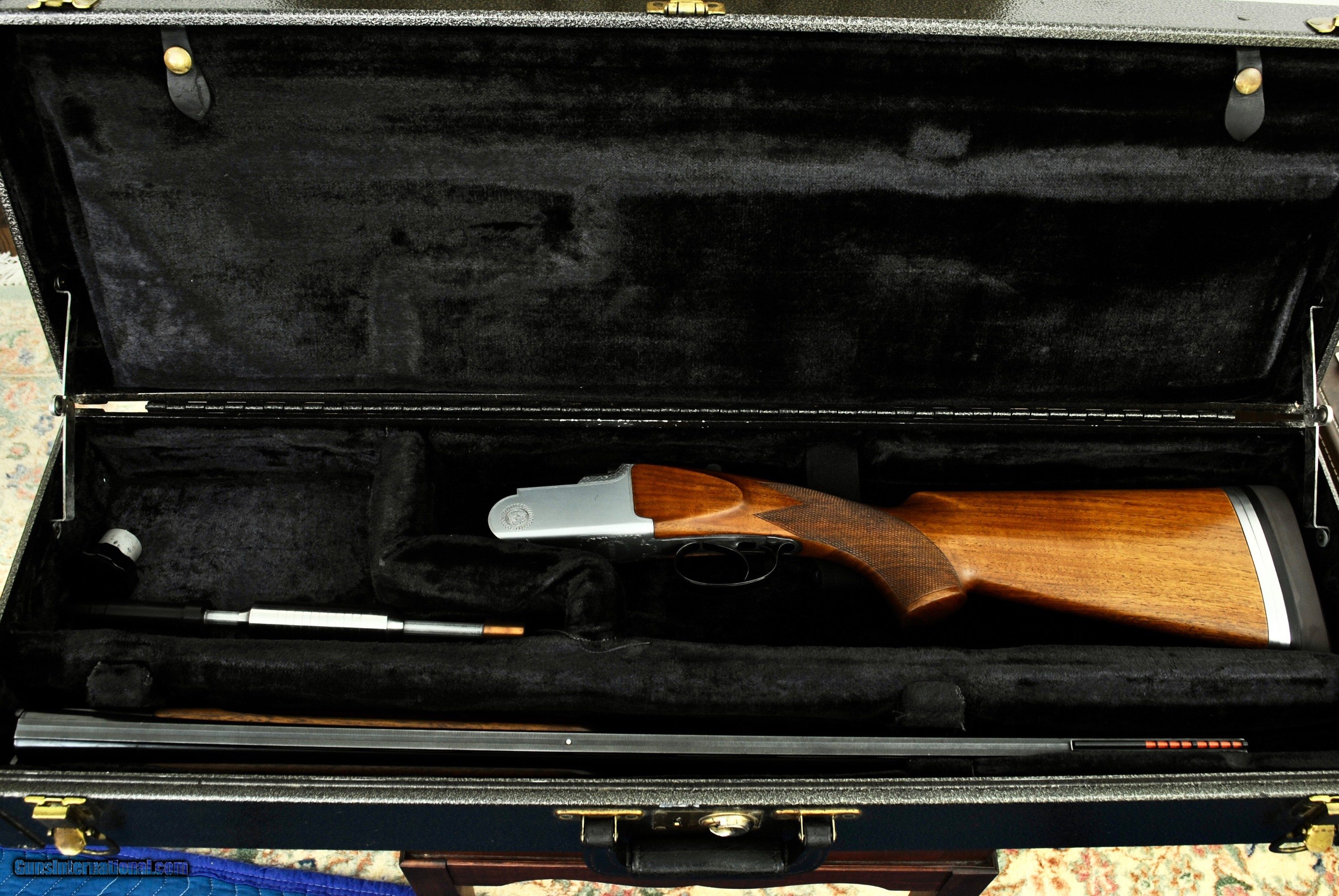 Description: Rottweil Model 72 - 4 gauge Skeet set with removable trigger group. Gun is Italian made 12 gauge with Kolar Skeet Tubes in 20, 28 and 410 gauge. The 20 and 28 gauge tubes are fixed choked while the 20 gauge have removable choke tubes with a total of 6 tubes provided. The 12 gauge have fixed Skeet chokes. Metal travel case with plush interior. Barrel insert knocker and choke wrench are provided. Barrels are 26 5/8". Weight of the gun is 8 LBS without the tubes. The various tube sets add the following weights. 410 Bore - 14 5/8 OZ. 28 Gauge - 1 LB 2 OZ. 20 Gauge - 14 5/8 OZ. LOP is 14 1/16" with a 4 way adjustable pad and brown KickEEZ pad. Drop at comb - 1 1/2". Drop at heel - 2 1/6". A couple small corrosion marks on the bottom of the barrel are hardly noticeable (see last photo). Shipping is $100. This is a great quality, removable trigger 4 gauge gun that is super affordable. SOLD Shotgun Gauge: 12 Gauge, 20 Gauge, 28 Gauge, .410 Gauge |