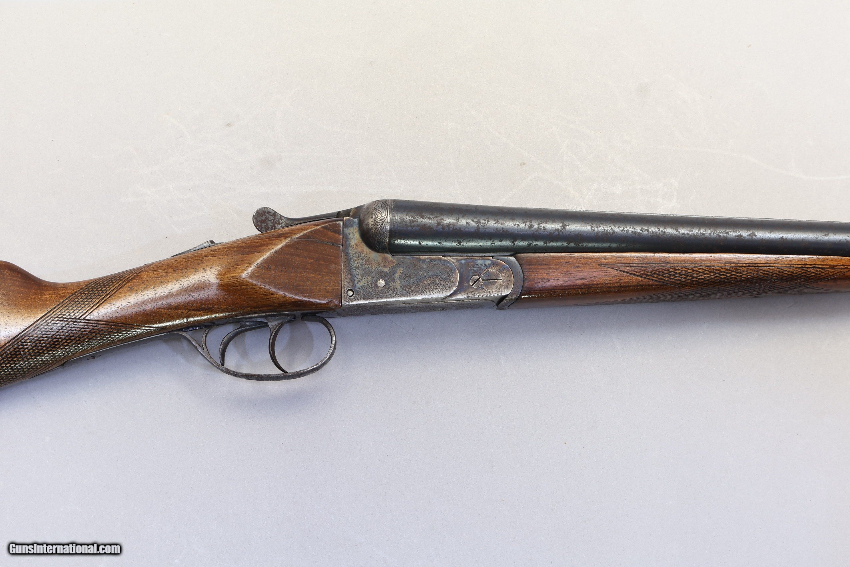 Description: 2 3/4" Chambers | Fixed Full & IM The Boxlock Side by Side in 12 Ga is a Spanish-made shotgun known for its straightforward build and reliable performance. It uses a double-trigger setup with a solid rib and smoothbore barrels, paired with a wooden Straight English stock for a classic feel. This example was known as The Hudson, a Spanish boxlock retailed by Elderkin & Son in the late 1960s. It has seen a fair amount of use, with corrosion visible along much of the barrels but no pitting found. The wood shows an amber-gold tone, the receiver keeps much of its bluing with small scroll engraving, and the butt stock retains sharp checkering.