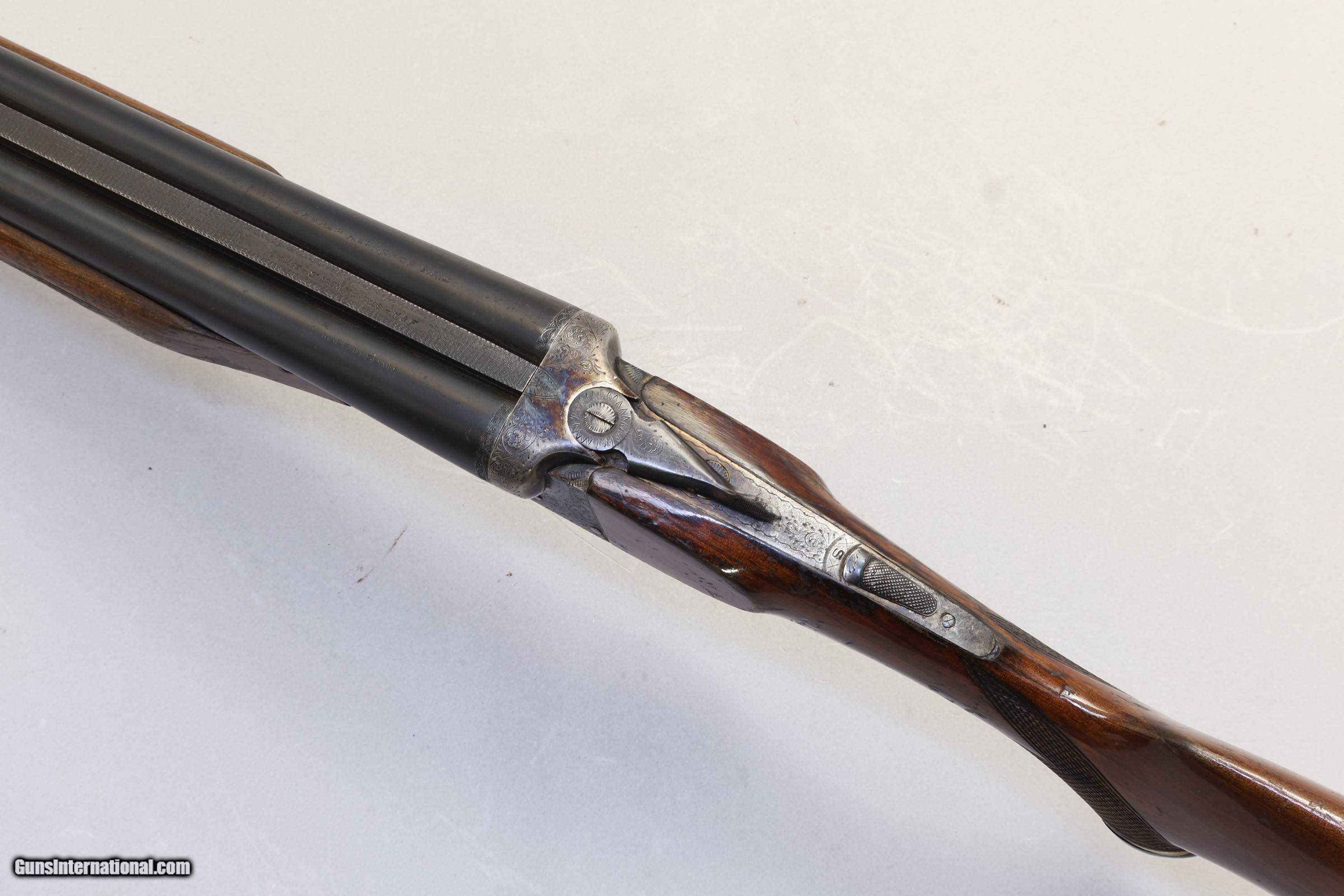 Description: 3" Chambers | Fixed Mod & Full | Good Condition The Magnum Side by Side in 12 Ga is a solid Spanish-made shotgun known for dependable performance and clean handling. It uses a smoothbore 30" barrel setup with a sturdy action and traditional double triggers. This example has been well used but remains in good working order. The wood shows some knocks, and the beavertail fore-end has light varnish wear, but these are cosmetic only. The barrels have minor surface corrosion, while the bluing is still well maintained. The receiver has detailed floral and scroll engraving with strong color hardening. The action locks up tight and operates as it should.