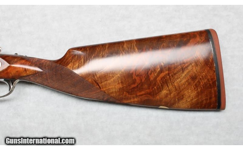 Description: Armas Berezi Side by Side in 12 Gauge. This is one of a highly finished true pair of Armas Berezi shotguns. The other shotgun in this pair is SKU 3470758. This is a game gun with case. The barrels are 27 3/4-inches and are chambered for 3-inch shells. The Serial Number is 22-03-02-99. Matted flat top rib w/ white front bead, gold inlaid "2" & gold inlaid "ARMAS BEREZI EIBAR". Sm. ring of engraving near breech end. Barrels of chopper lump construction w/ S# & proof info on polished flats w/ self-opening system ahead of forend latch. Slim beavertail forend checkered in point pattern w/ floral & scroll engraved irons has Anson type pushbutton release w/ gold inlaid "2" towards tip. Full sidelock action w/ full coverage engraving. Lg. pheasants on left lock plate in farm & mountain scene. Bottom of action w/ lg. portrait of dog w/ fallen woodcock in his mouth & full coverage scroll engraving. Right lock plate w/ burst of quail in farm scene & engraver's signature "Pedro Mari Arreitunandia" towards bottom. Gun made w/ double triggers (front articulated), auto ejectors, auto safety & self-opening system. Bbl. bolsters w/ side clips are full coverage rose & scroll engraved as is top lever w/ gold inlaid "2" at center. Top tang in near full coverage scroll engraving w/ relief "S" in front of scroll engraved safety slide. Rolled edge trigger guard is full coverage engraved w/ rose & scroll pattern. Nicely figured perch belly walnut buttstock checkered in point pattern thought the wrist w/ sm. brass shield toward toe and terminates w/ a thin red Old English brand pad. DAC: 1 1/2". DAH: 2 1/4". LOP: 14 1/2". Right: Bore diameter: .728. Restriction: .019. Minimum wall thickness: .035. Left: Bore diameter: .728. Restriction: Minimum wall thickness: .034. Weight: 7 lbs. 13 oz. UNATTACHED ACCESSORIES: housed in their original brown leather case w/ maker's trade label at top of outside & inside. The case has brass furniture & green felt interior. CONDITION: excellent, showing limited field use & retains nearly all original finish to both wood & metal surfaces w/ the exception of a few light scratches on the left side of the butt towards pad. Bores bright & shiny. Mechanics are crisp. Pedro Mari Arreitunandia was well known as perhaps the foremost gun engraver in Spain in the late 20th & early 21st centuries having passed in 2010. His works will only become more & more sought after over time. 12 Gauge SOLD Chambers: 3 Inches Metal Condition: Excellent Wood Condition: Excellent Bore Condition: Bright Triggers: Double triggers Stock Dimensions: DAC: 1 1/2". DAH: 2 1/4". LOP: 14 1/2 Fore End: Finely checkered walnut Butt Pad: Rubber pad Chokes: Mod/Full Item Location: La Vista, NE |