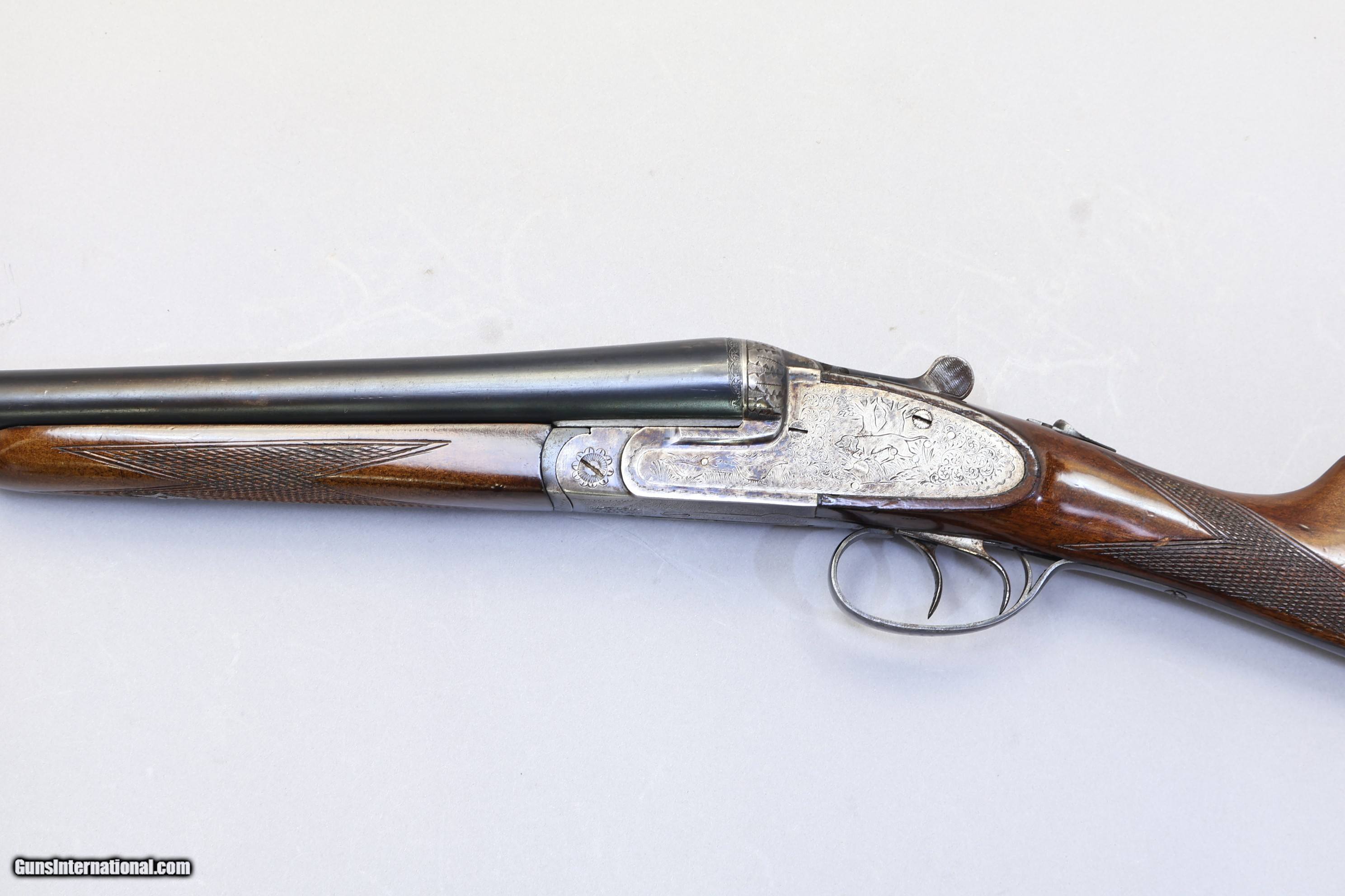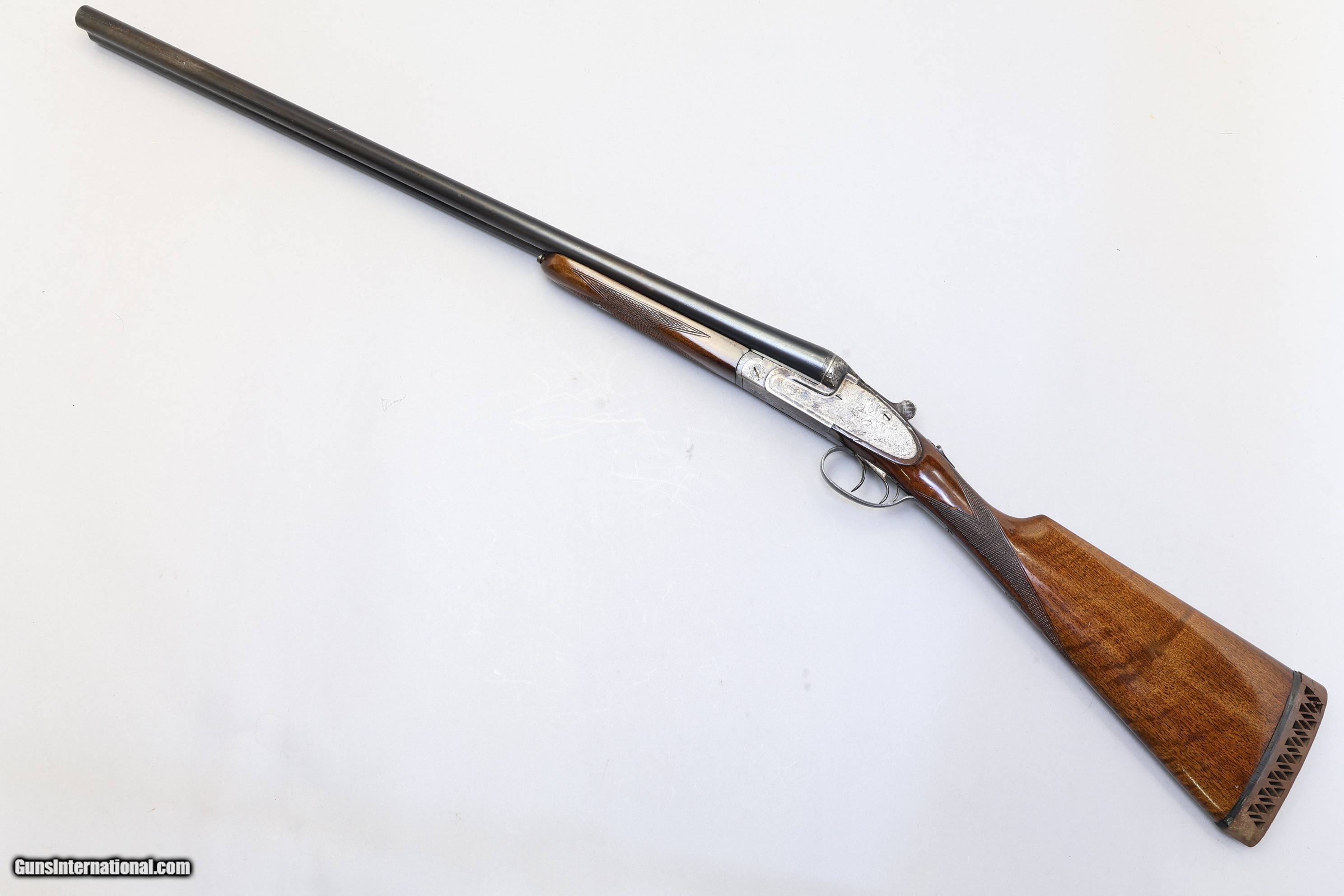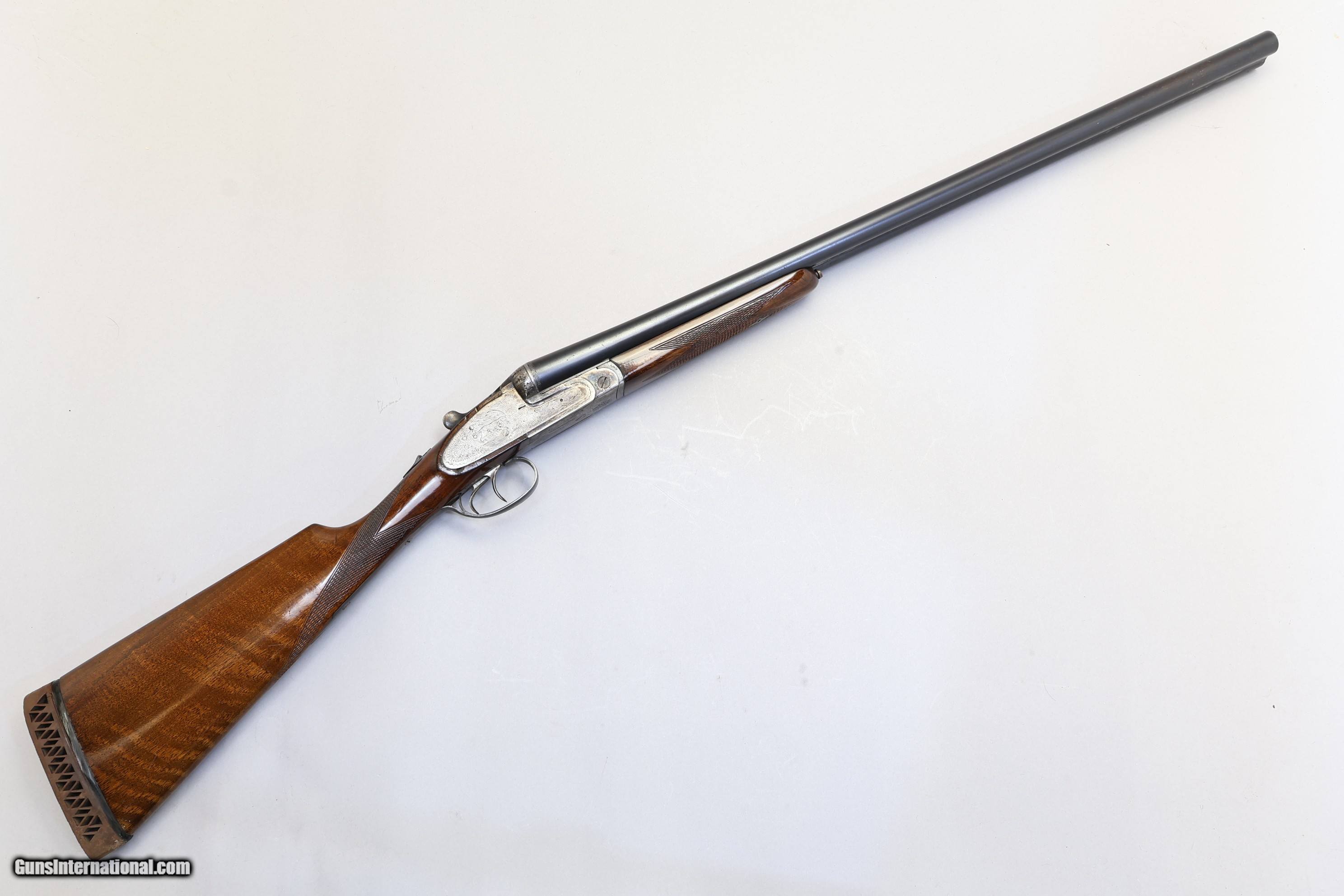 Description: Armas Eibar Bisonte Sidelock Side by Side, 12 Ga, 27 3/4" Barrels Armas Eibar Bisonte Sidelock Side by Side in 12 Ga, a Spanish-made sidelock field gun known for responsive handling and classic craftsmanship. It pairs traditional double triggers with extractors and a straight English stock for lively, sure-shouldered performance in the field. Overall condition is fair to good. The deep-brown wood shows honest handling with checkering in pretty good shape, and the color case-hardening on the sidelock receiver remains in spots but is largely worn. Engraving is especially appealing, with a working dog and game scenes on each side and floral and scroll work on the underside. The barrels measure 27 3/4" with a solid rib tapered 8 mm to 4 1/2 mm and a brass bead; bluing is mostly intact with some corrosive surface marks but no pitting. Chambers are 2 3/4" with fixed chokes, left Full and right Full. Cast is neutral with a straight English stock; LOP 14 3/4", LOP to wood 13 1/8", DAC 1 3/4", and DAH 2 7/8". Overall length is 44 9/10" and weight is 7 1/10 lbs. Dating to 1983 in Spain, this example has a nice, smooth break action and is chambered in 12 Ga.
