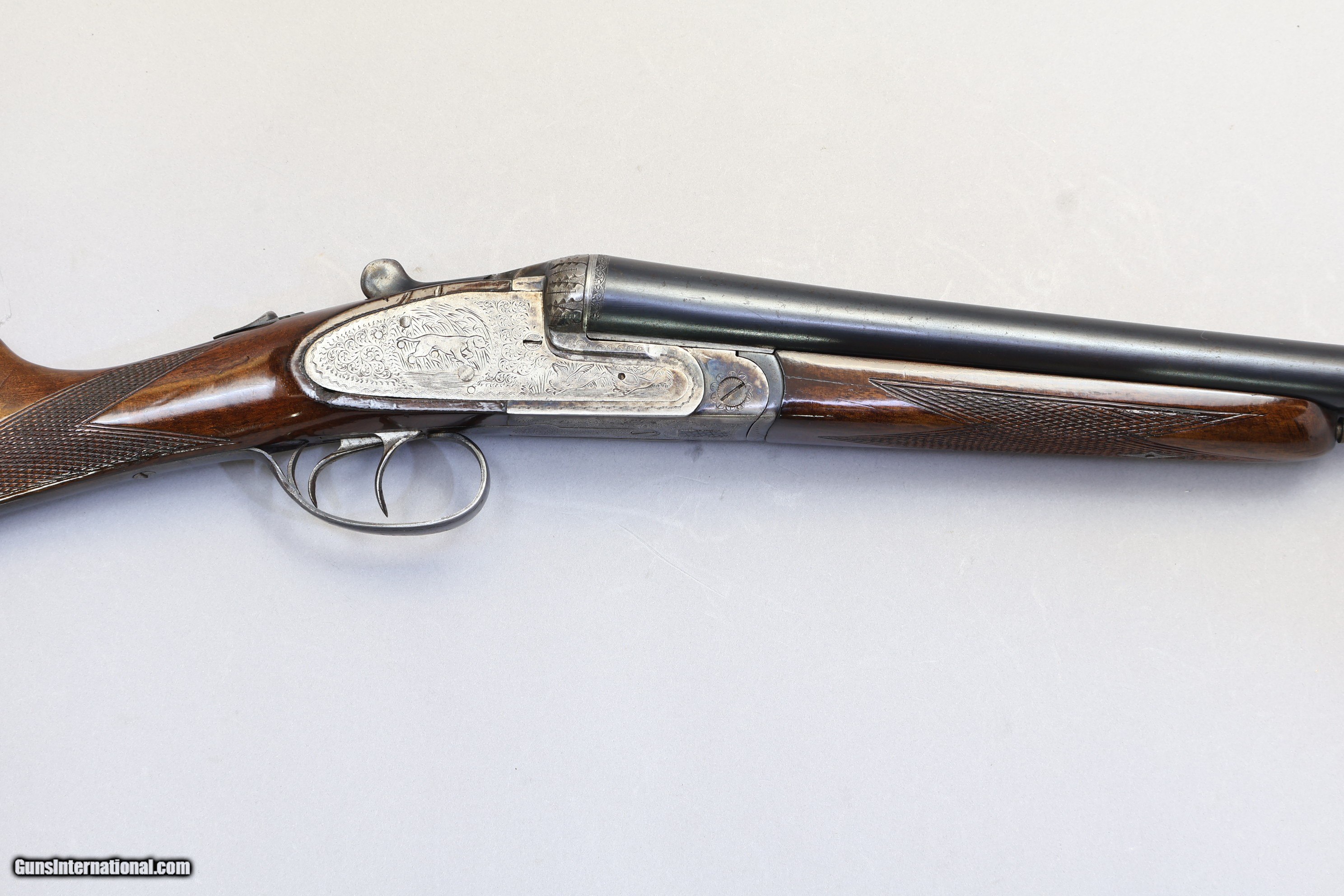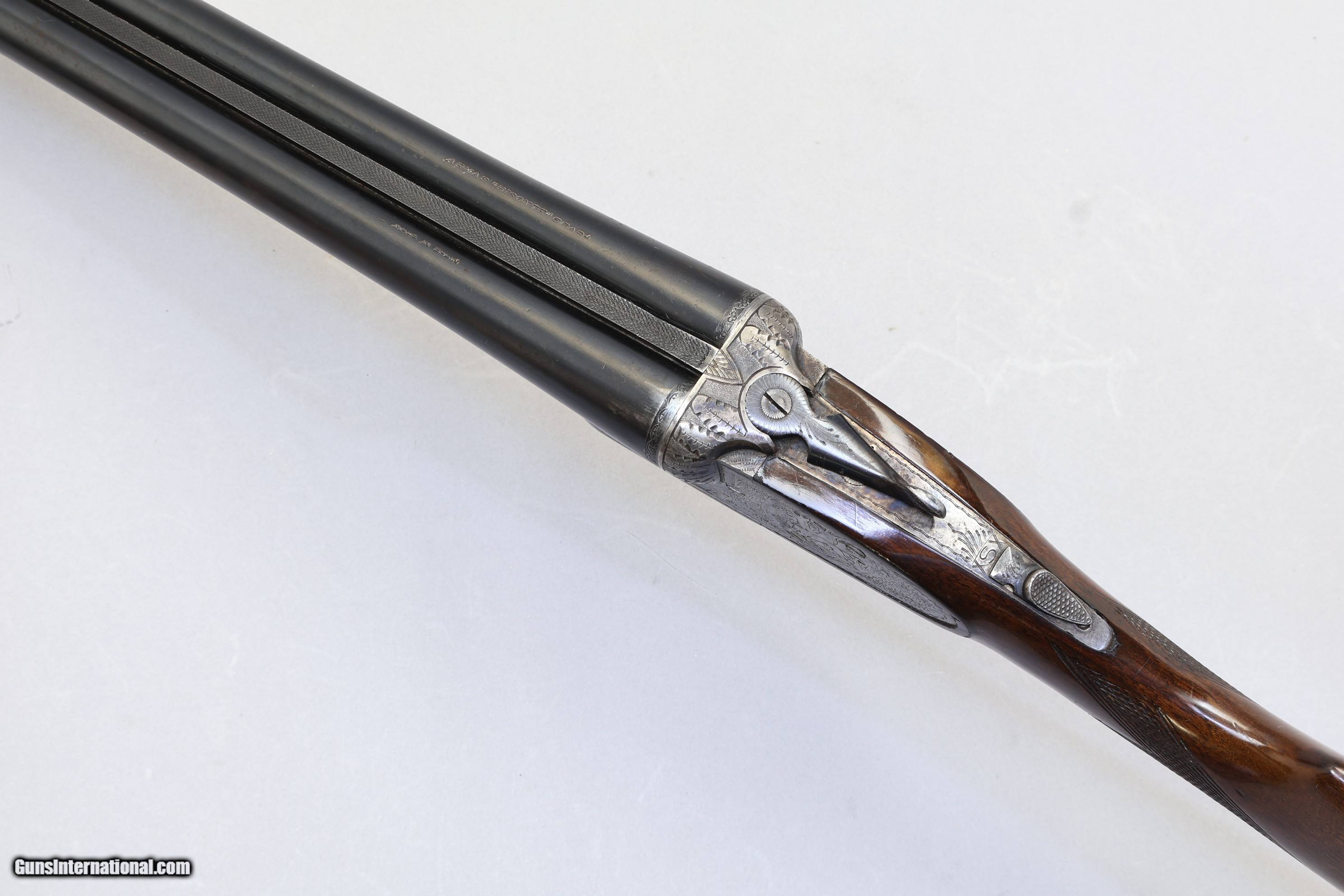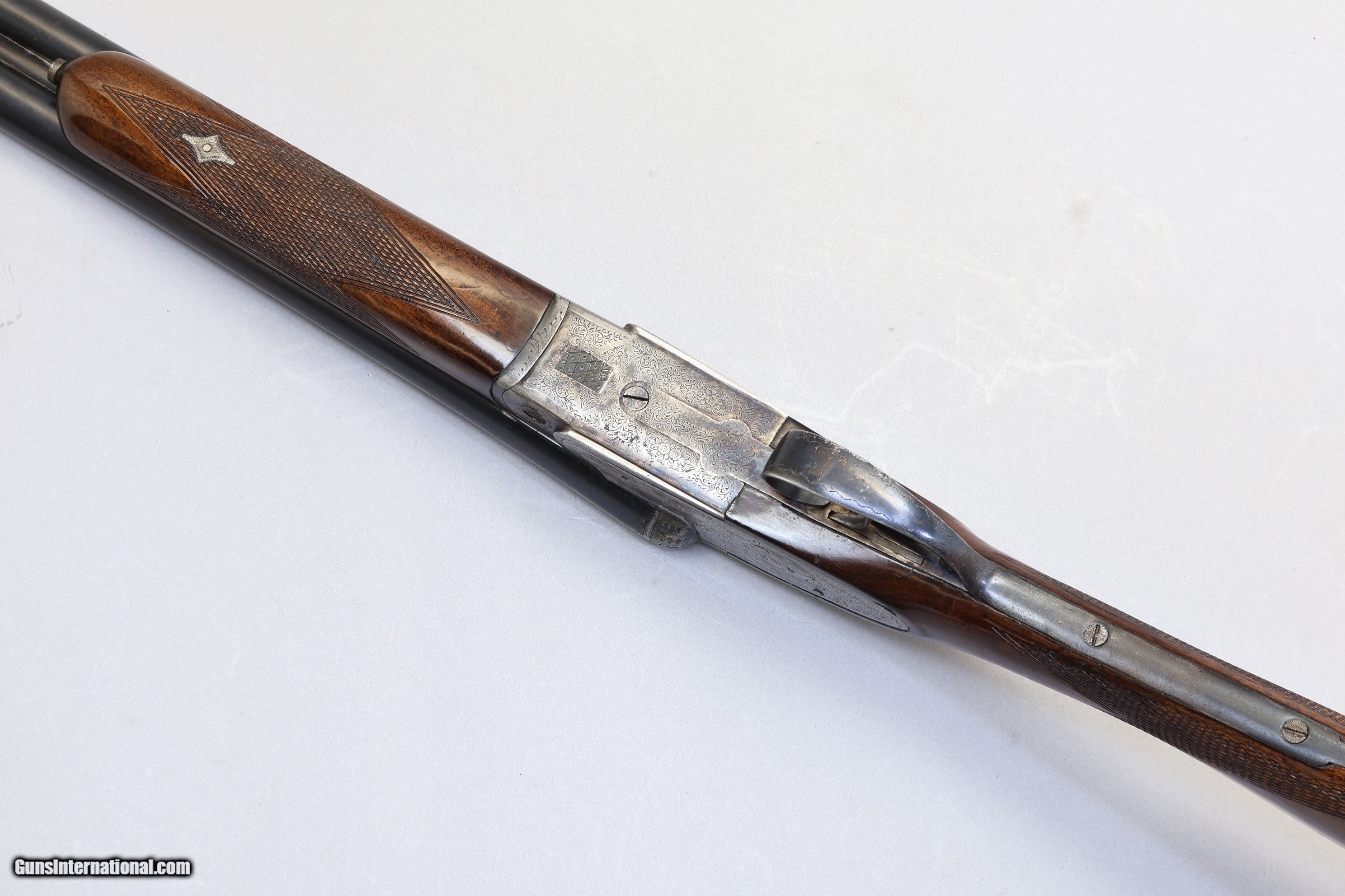 Description: Armas Eibar Bisonte Sidelock Side by Side, 12 Ga, 27 3/4" Barrels Armas Eibar Bisonte Sidelock Side by Side in 12 Ga, a Spanish-made sidelock field gun known for responsive handling and classic craftsmanship. It pairs traditional double triggers with extractors and a straight English stock for lively, sure-shouldered performance in the field. Overall condition is fair to good. The deep-brown wood shows honest handling with checkering in pretty good shape, and the color case-hardening on the sidelock receiver remains in spots but is largely worn. Engraving is especially appealing, with a working dog and game scenes on each side and floral and scroll work on the underside. The barrels measure 27 3/4" with a solid rib tapered 8 mm to 4 1/2 mm and a brass bead; bluing is mostly intact with some corrosive surface marks but no pitting. Chambers are 2 3/4" with fixed chokes, left Full and right Full. Cast is neutral with a straight English stock; LOP 14 3/4", LOP to wood 13 1/8", DAC 1 3/4", and DAH 2 7/8". Overall length is 44 9/10" and weight is 7 1/10 lbs. Dating to 1983 in Spain, this example has a nice, smooth break action and is chambered in 12 Ga.