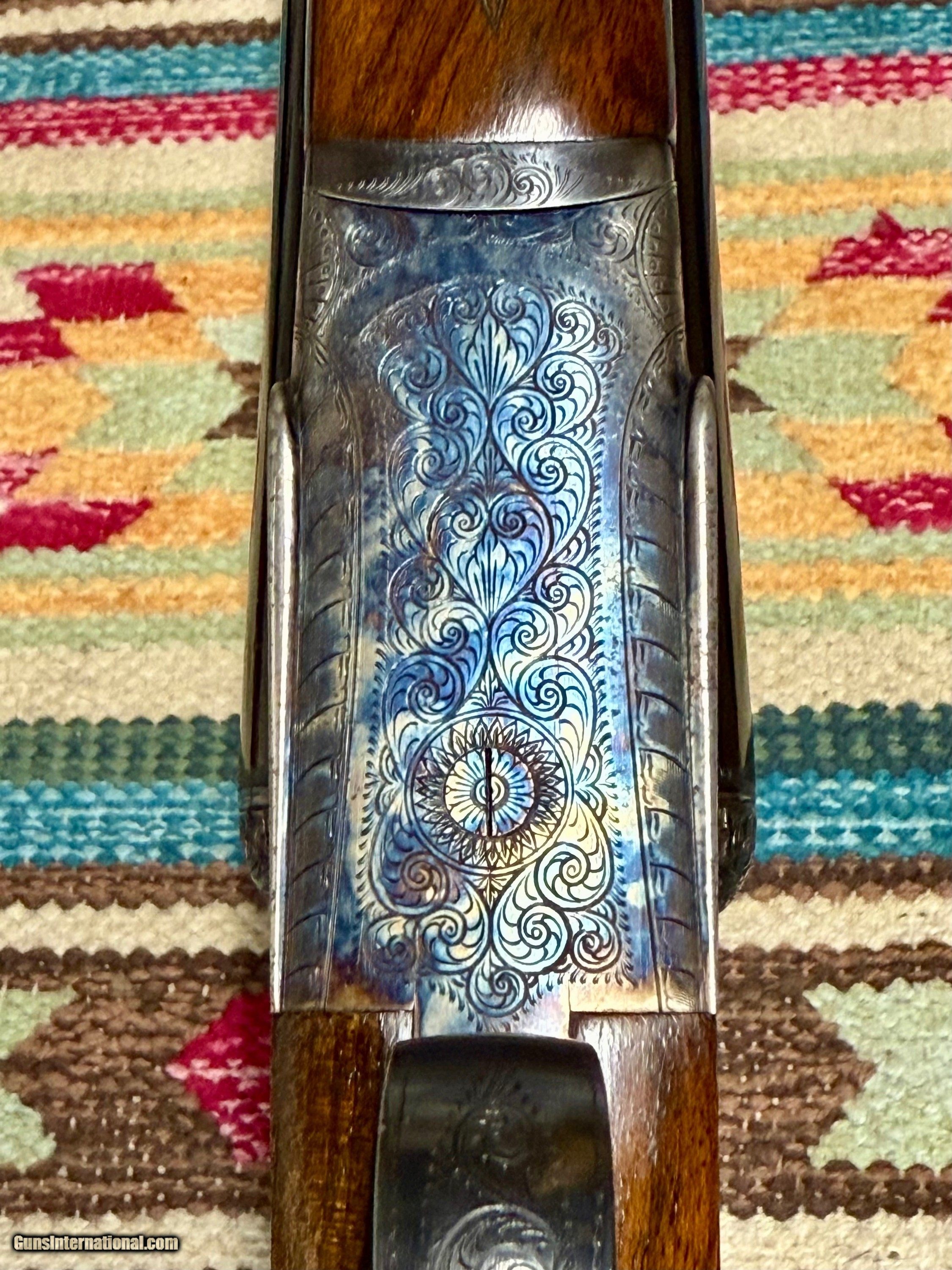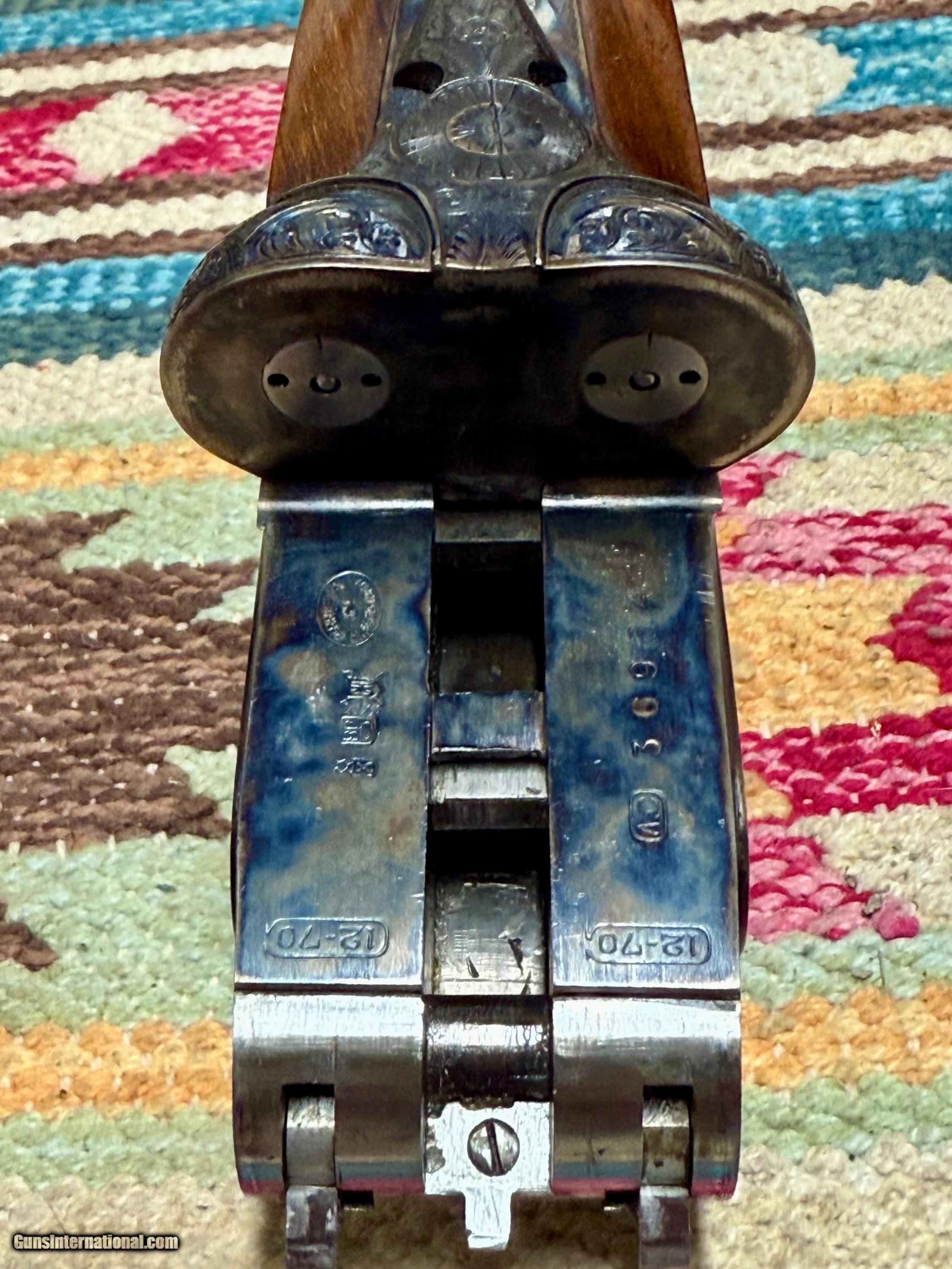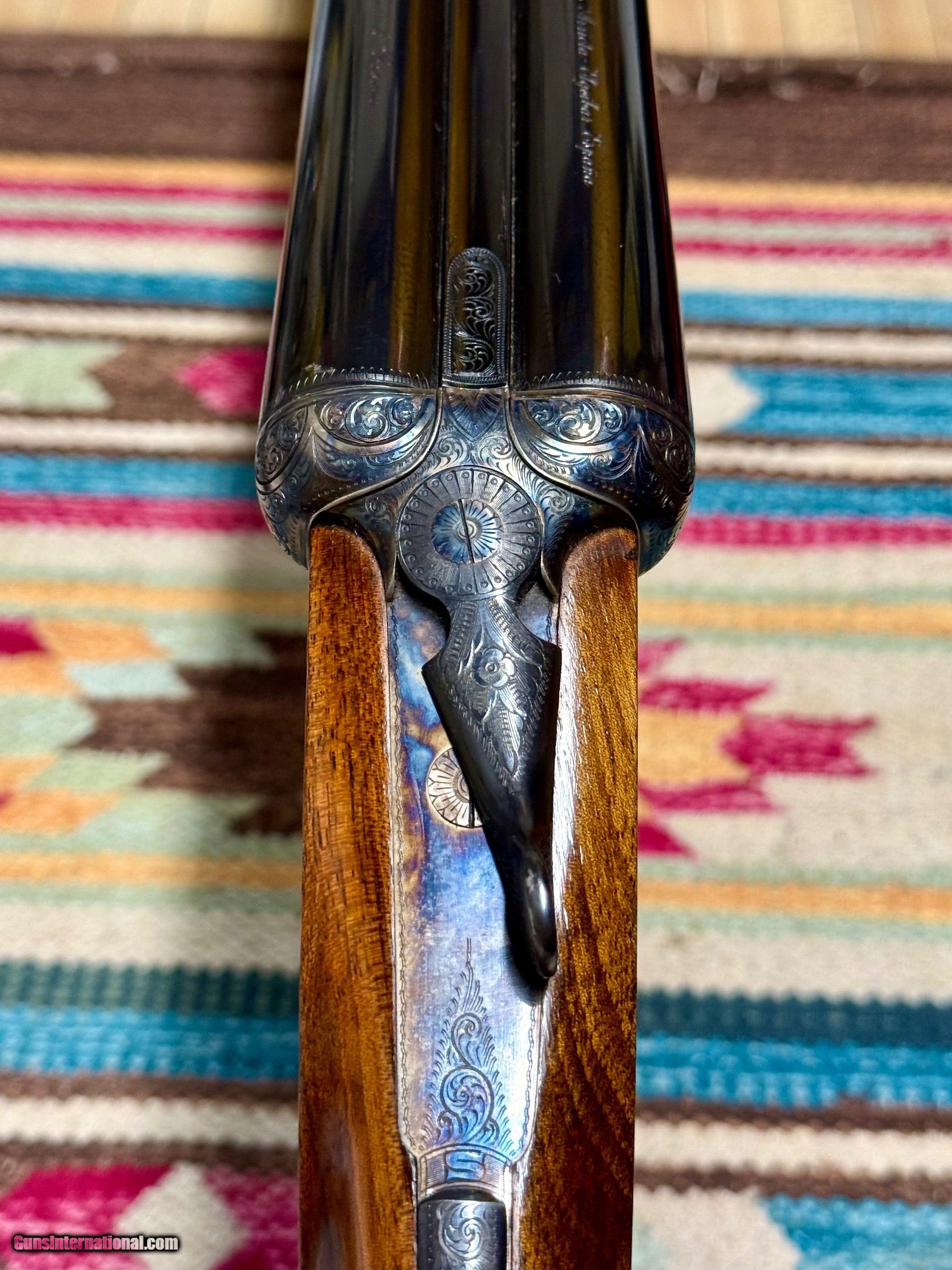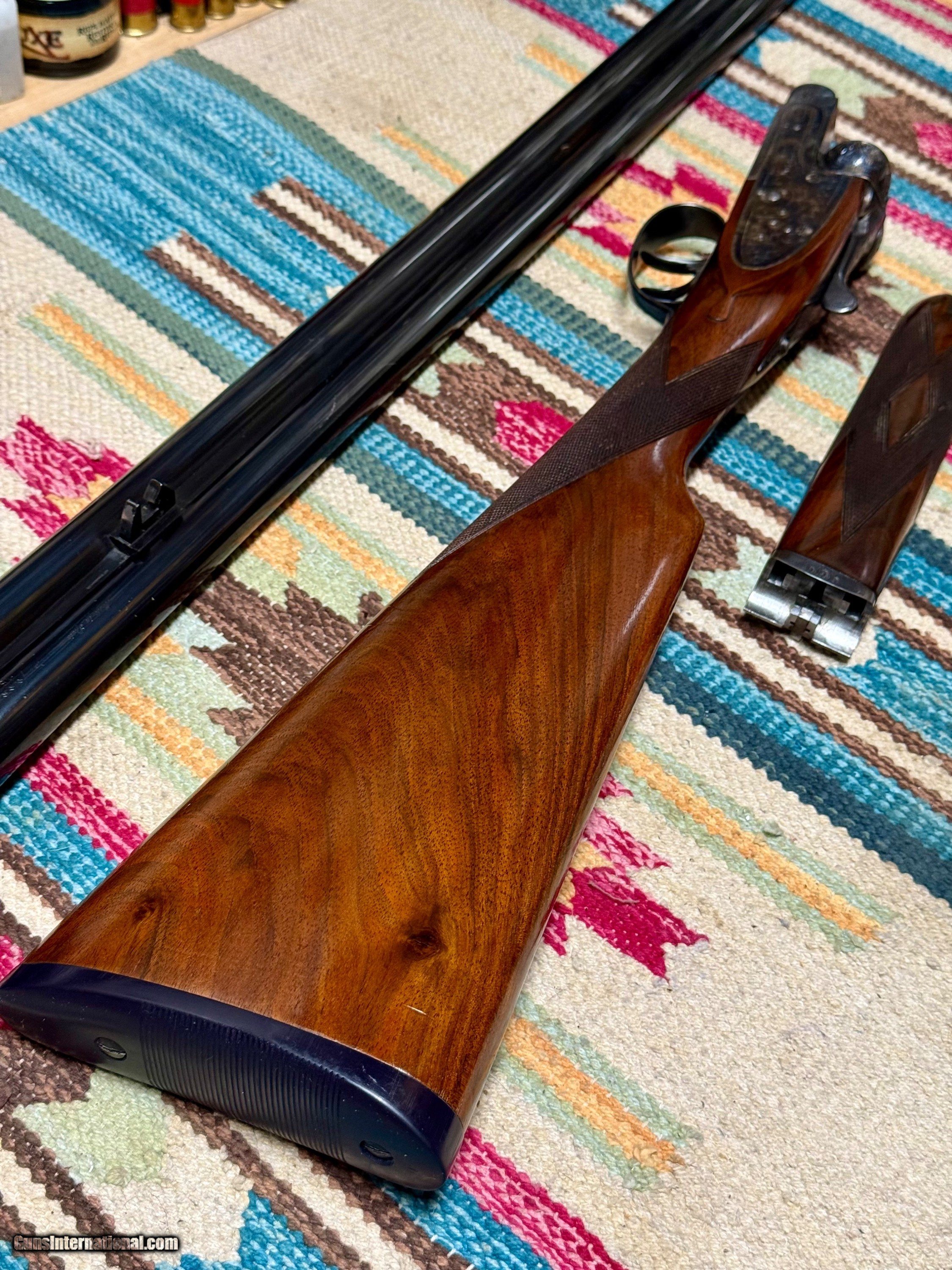Description: Arrieta 12 gauge sidelock built in 1991 by one of Spain’s better gunmakers. This gun was a Gunmark import, Crown model similar to the 557. The gun is in excellent condition, double triggers, automatic safety, ejectors, 27" barrels choked IC, M. Features articulated front trigger, gas escape ports, bushed firing pins, vacant gold oval and screws are in excellent condition. Lock up is tight and barrels ring like church bells. Wood is in good condition with some handling marks from normal use, no cracks or chips. Straight grip stock and splinter forend, checkering is fine and crisp. European walnut with nice figure. 15 1/4” x 1 1/2" x 2 1/8” slight cast off for RH shooter. Receiver is in very good condition, excellent engraving, bright case colors with few handling marks from normal use. Barrels show a few handling marks, blue is excellent and bores are clean and bright. Gun comes with a leather take down case and briley snap caps as shown. Excellent double from one of Spain’s best gunmakers. $2250 Shotgun Gauge: 12 Gauge Manufacturer: Arrieta Model: Sidelock Ejector Barrel Length: 27” Chambers: 2 3/4” Ejectors: Yes Condition: Very Good Metal Condition: Very Good Wood Condition: Very Good Bore Condition: Bright Barrel Type: SxS Action: Sidelock Triggers: Double Stock: Straight Stock Dimensions: 15 1/4” x 1 1/2” x 2 1/8 Stock Cast: Slight Cast Off Fore End: Splinter Butt Pad: Grooved Plate LOP: 15 1/4” Weight: 6 3/4 lbs Manufacture Date: 1991 Choke Left: M Choke Right: IC Extras: Case, Snap Caps Case: Leather Takedown Price: $2,250.00 Contact Seller |
