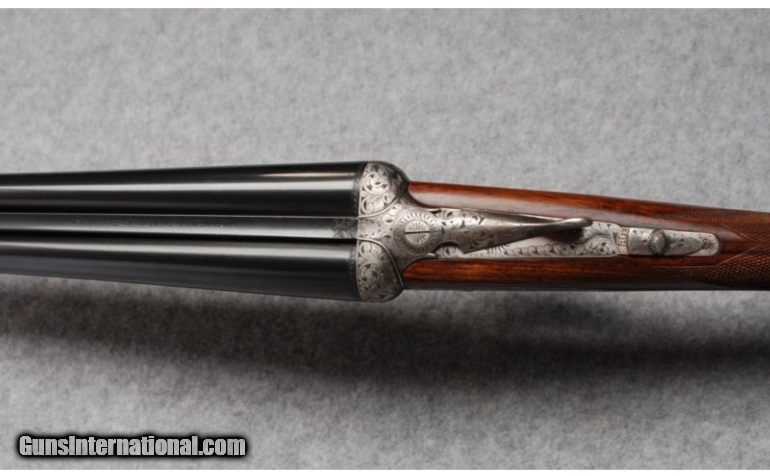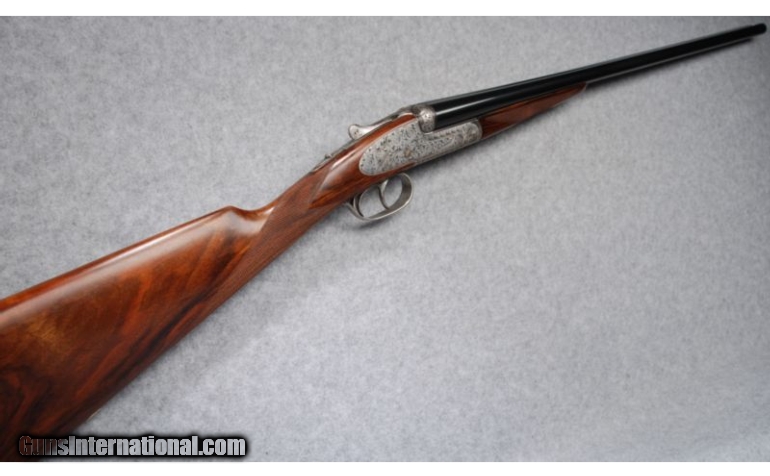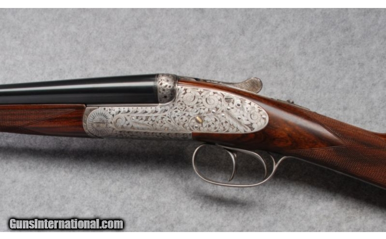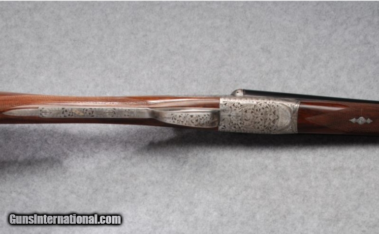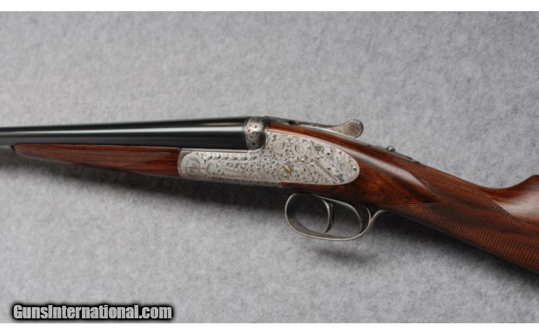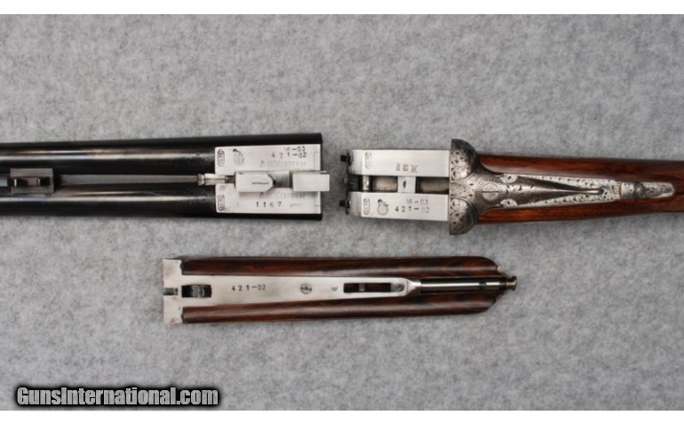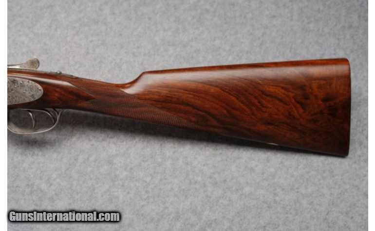 Description: This gun is in excellent overall condition witha tight lock-up and mirror bright bores. Bore dimensions are: Left - .619" diameter, .030" wall thickness with .010" restriction; Right - .620" diameter, .034" wall thickness with .007" restriction. Action engraved and signed "Txitxi" by the engraver. SOLD Manufacturer: Circa; 2002 Caliber Info: 20 Gauge Chambers: 2-3/4" - Ejectors Metal Condition: Barrel bluing shows some light wear and scratches from contact with the forend. Round bar, coin-finished receiver and triggerguard carry bold foliate engraving with the engraver's mark, "Txitxi" on the triggerplate. Minimal finish oxidation is visible o Wood Condition: Aside from a few very light handling marks on the butt near the heel, the wood looks nearly perfect. Bore Condition: Bright bores Barrels: 28" Chopper lump barrels with concave game rib Triggers: Double triggers Stock: Straight grip, fineline checkered European walnut Stock Dimensions: LOP: 15", DAC: 2-5/16", DAH: 1-1/2 Fore End: Splinter-type, fineline checkered European walnut with Anson release Butt Pad: Cut-checkered buttstock Weight: 6-1/2 lbs. Sights: Single metal bead Chokes: Fixed chokes; Modified & Full Extras: Original corrugated shipping container, no papers. Item Location: Hamburg, PA |