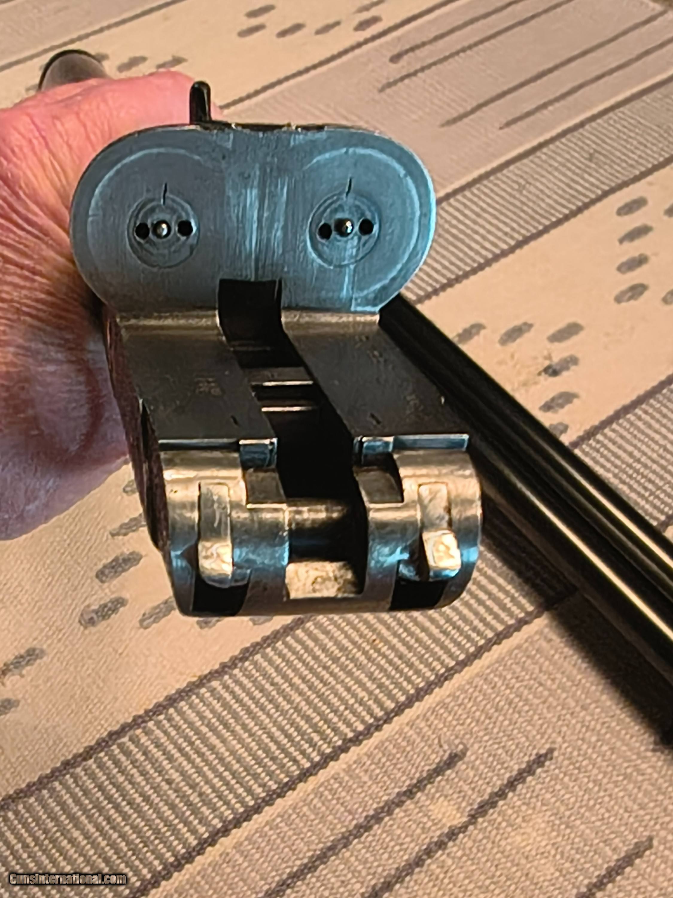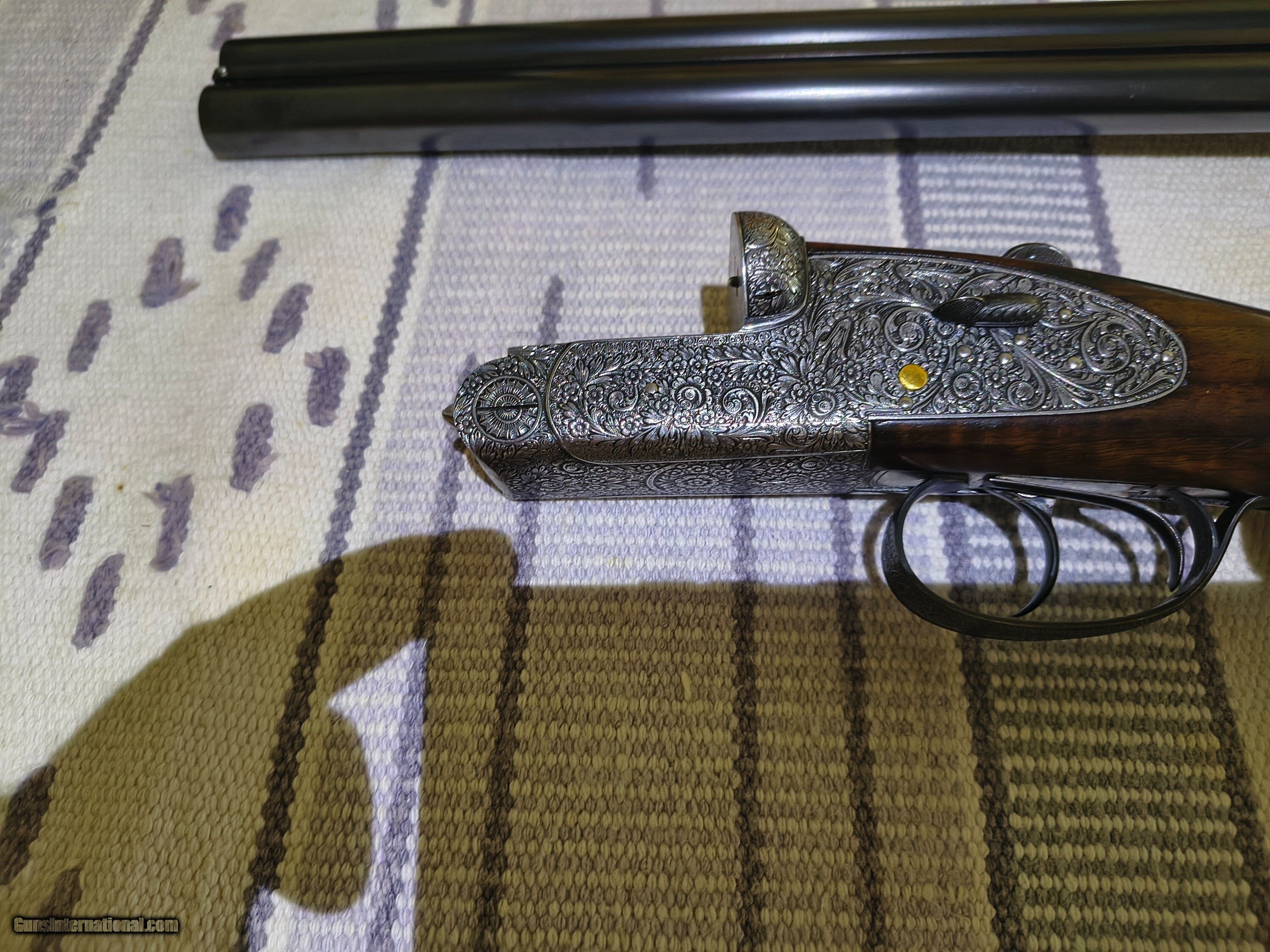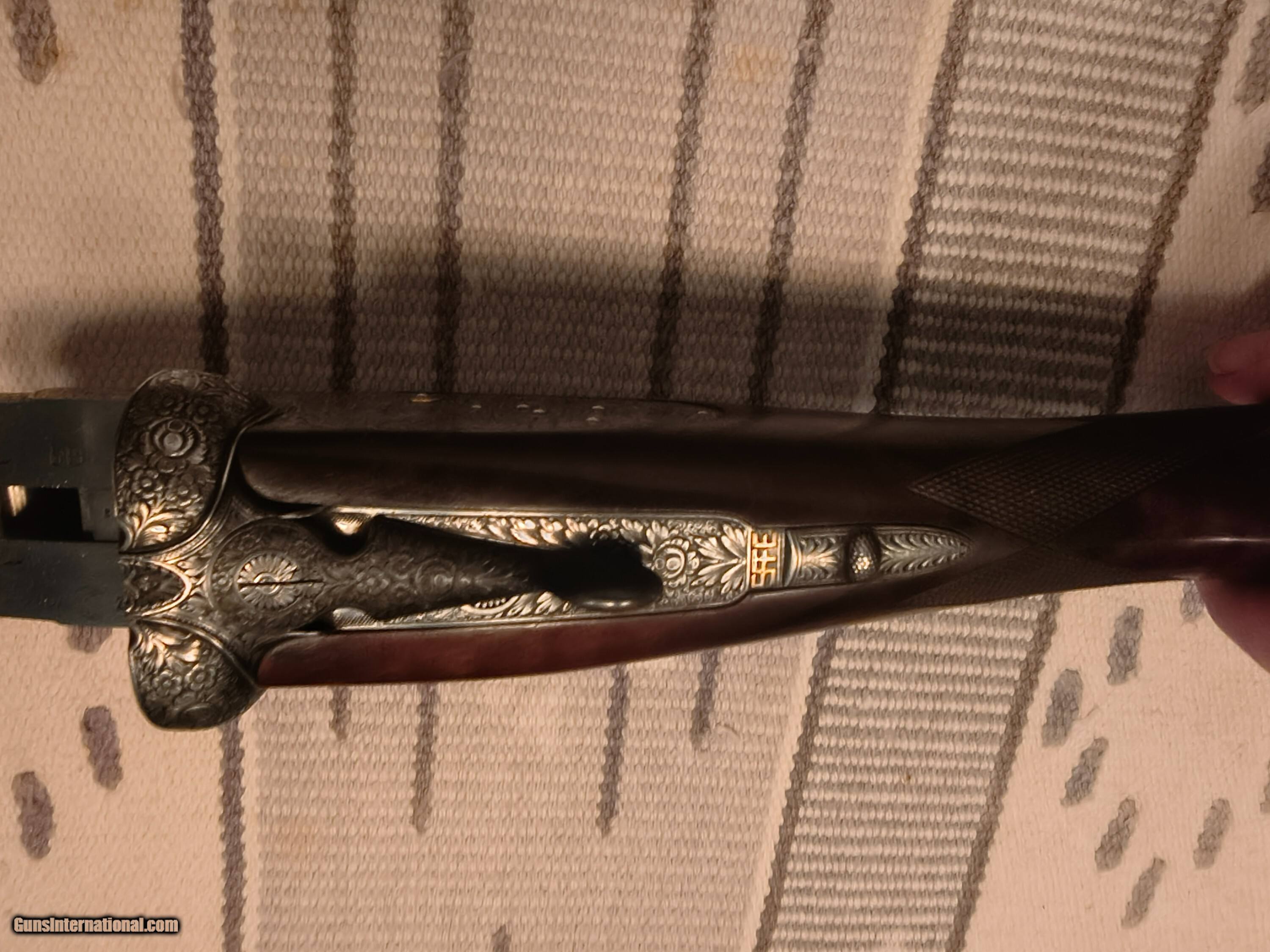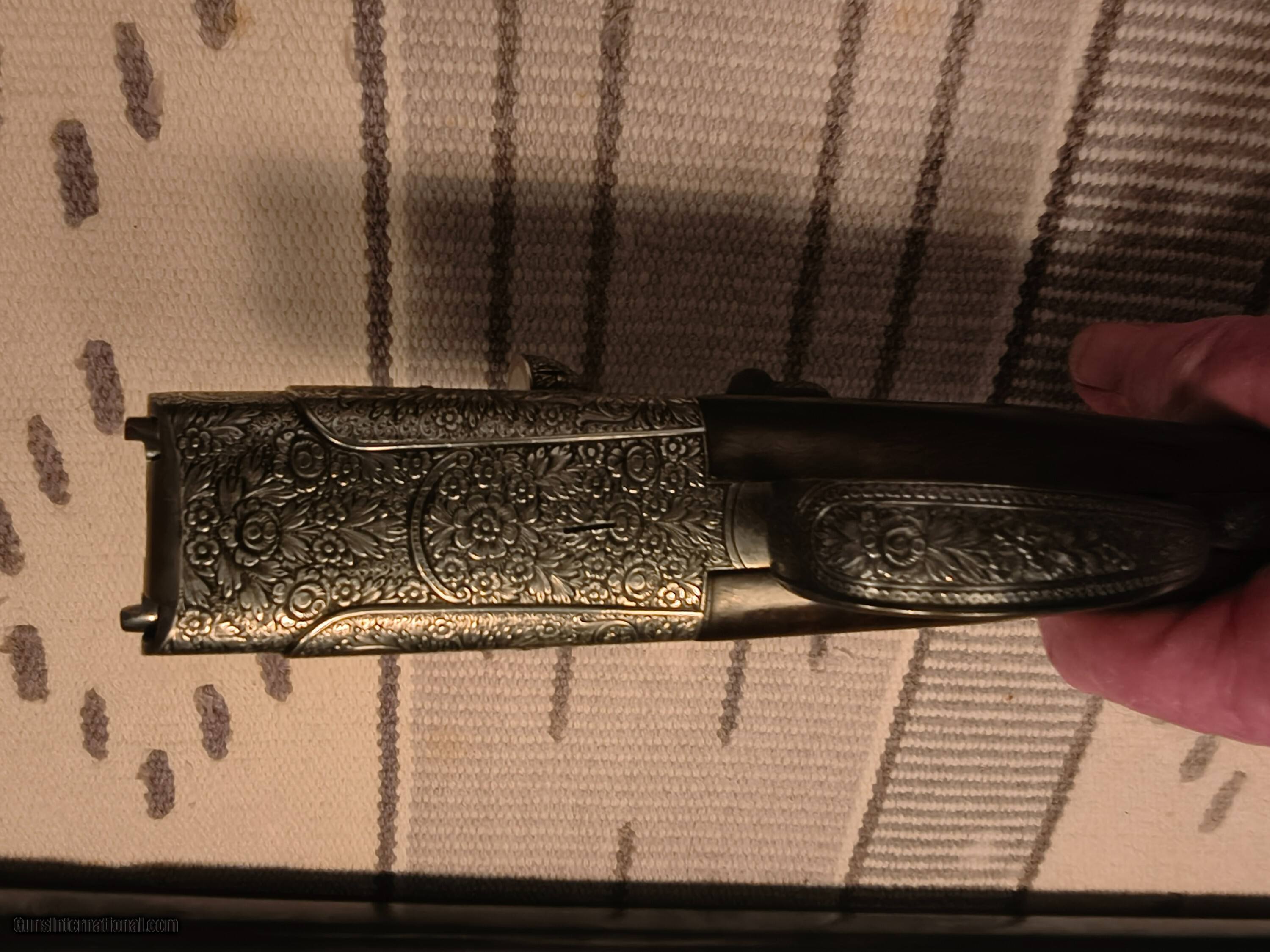 Description: This was the Very Best Union Armera had to offer in 1982 as Mr Jose Luis Usobiaga stated in our email conversation this was what a Royal model of today only with a Special Engraving on a Round Action and only a very few were handcrafted so the elaboration was discontinued in 1990. All best gun features H&H Self Opening auto safety rolled edge trigger articulating front trigger bushed disc strikers gold plated internals rounded action best quality hand engraving along with fiddle back European walnut with best quality leather covered pad. Barrels are chopper lump with smooth concave tapered rib 27 1/8 " length bores are both.724 chokes R. 005 L. .019 barrel weight 1.350 kg. Cased in a earlier Spanish leather case . First One I have ever owned or seen for that matter. !!! CALL FOR PRICING !!! . Shotgun Gauge: 12 Gauge Manufacturer: Union Armera / Grulla Model: # 1 Serial Number: 286xx Barrel Length: 27 1/8 Bore Info: .0724 Both Chambers: 2 3/4 Ejectors: Yes Condition: Excellent Metal Condition: Excellent Wood Condition: 97% Bore Condition: Excellent Barrel Type: Chopper Lump Action: Hand Detachable Sidelock Triggers: Double Stock: English Grip Stock Dimensions: 1 3/8" x 2" x 15 Stock Cast: 1/4 heel 1/4 toe Fore End: Small Splinter Butt Pad: Best Quality Leather Covered LOP: 15 Rib: Taper smooth concave Finish: Original Weight: 6 lbs 14 oz Sights: Single metal front Manufacture Date: 1982 Chokes: Fixed Choke Left: .019 / Mod Choke Right: .005 / Skeet Engraving: Yes Best Quality Case: Yes Price: POR Contact Seller |