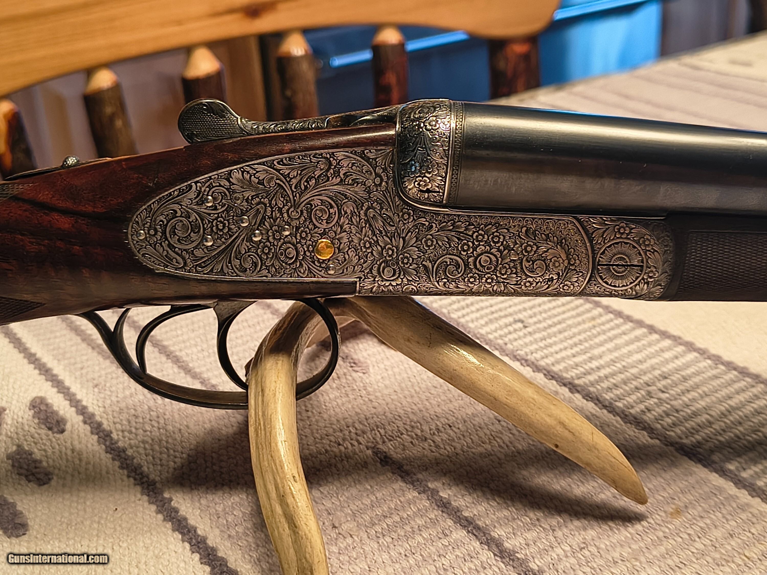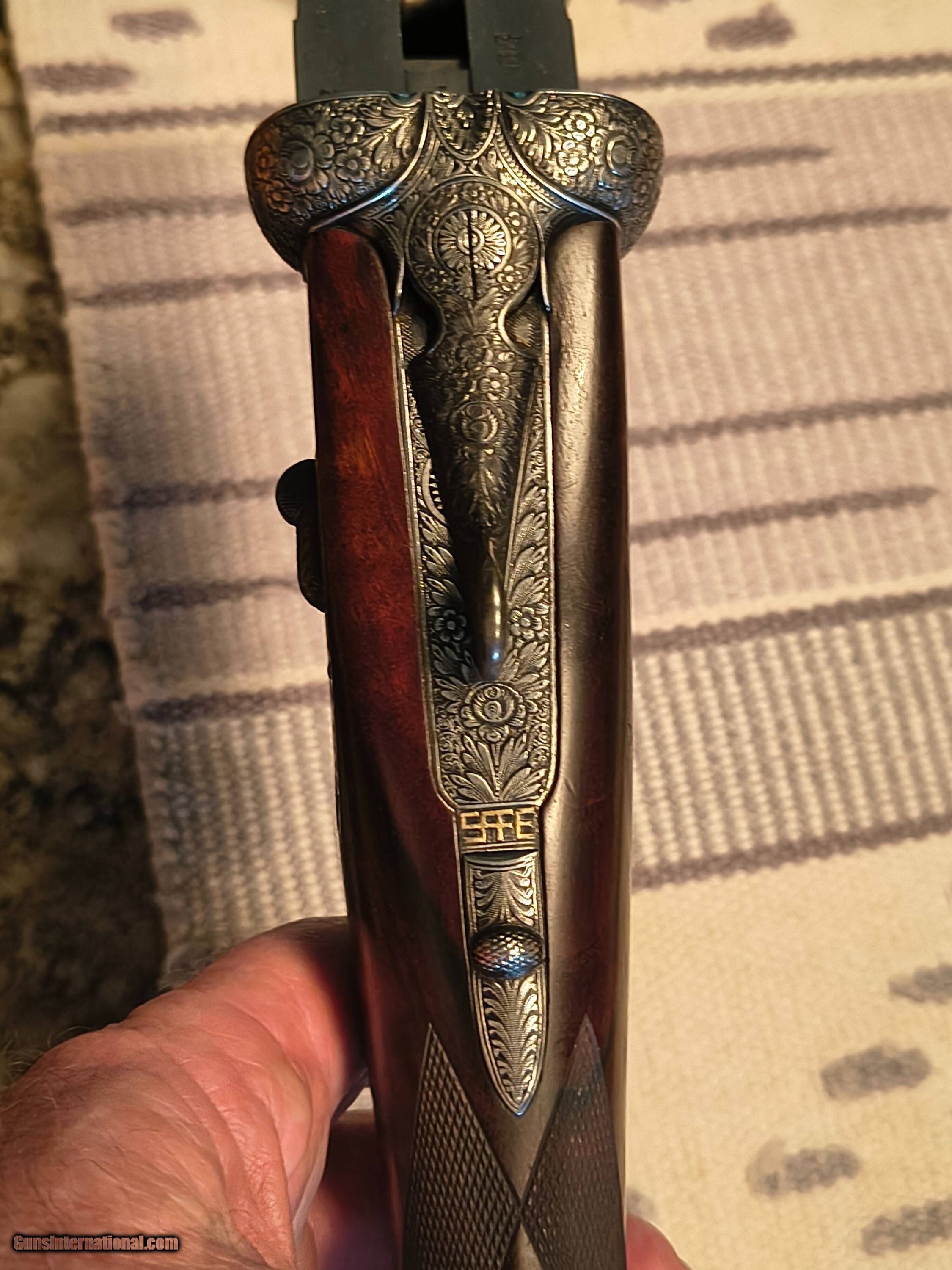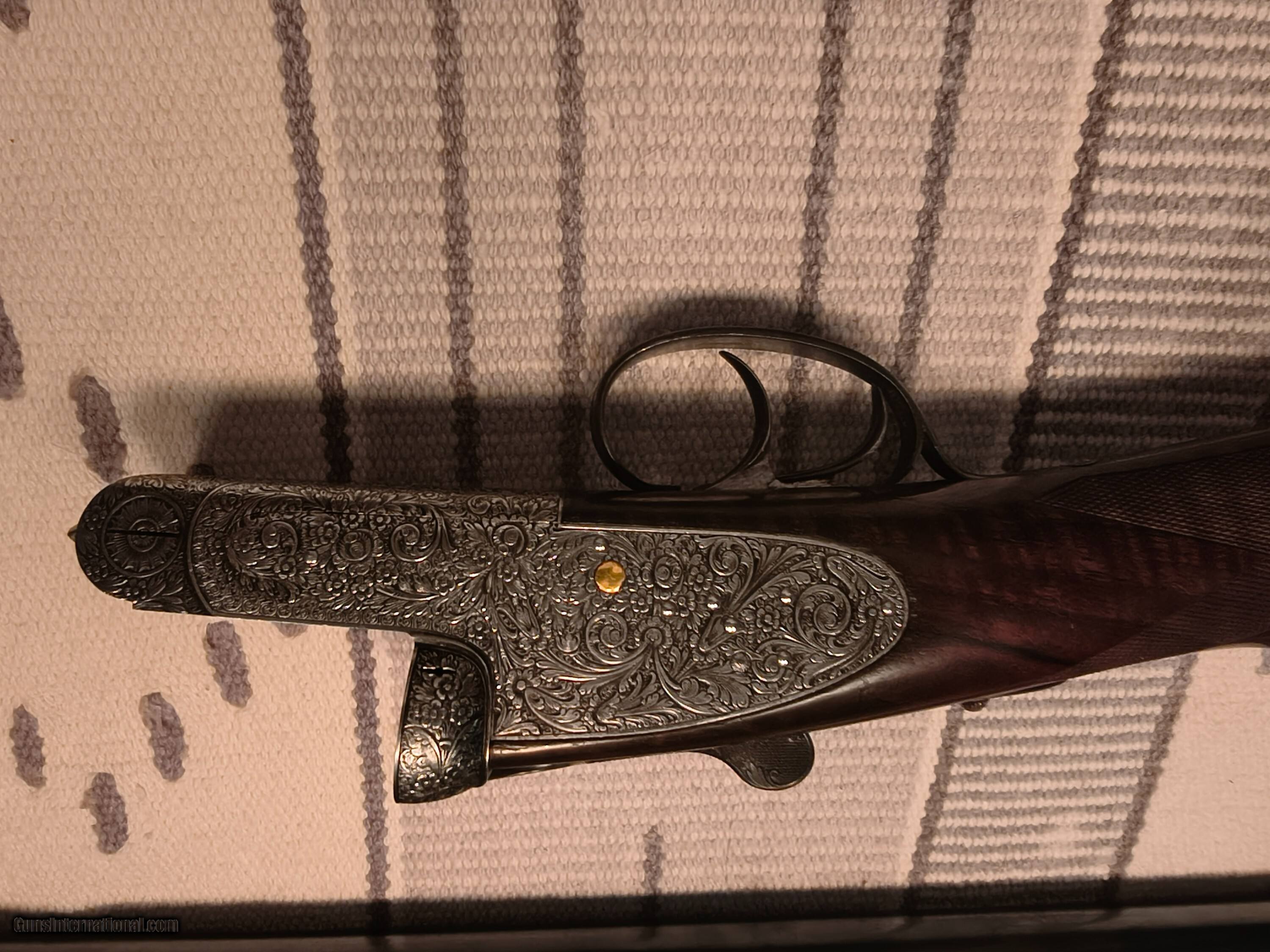 Description: This was the Very Best Union Armera had to offer in 1982 as Mr Jose Luis Usobiaga stated in our email conversation this was what a Royal model of today only with a Special Engraving on a Round Action and only a very few were handcrafted so the elaboration was discontinued in 1990. All best gun features H&H Self Opening auto safety rolled edge trigger articulating front trigger bushed disc strikers gold plated internals rounded action best quality hand engraving along with fiddle back European walnut with best quality leather covered pad. Barrels are chopper lump with smooth concave tapered rib 27 1/8 " length bores are both.724 chokes R. 005 L. .019 barrel weight 1.350 kg. Cased in a earlier Spanish leather case . First One I have ever owned or seen for that matter. !!! CALL FOR PRICING !!! . Shotgun Gauge: 12 Gauge Manufacturer: Union Armera / Grulla Model: # 1 Serial Number: 286xx Barrel Length: 27 1/8 Bore Info: .0724 Both Chambers: 2 3/4 Ejectors: Yes Condition: Excellent Metal Condition: Excellent Wood Condition: 97% Bore Condition: Excellent Barrel Type: Chopper Lump Action: Hand Detachable Sidelock Triggers: Double Stock: English Grip Stock Dimensions: 1 3/8" x 2" x 15 Stock Cast: 1/4 heel 1/4 toe Fore End: Small Splinter Butt Pad: Best Quality Leather Covered LOP: 15 Rib: Taper smooth concave Finish: Original Weight: 6 lbs 14 oz Sights: Single metal front Manufacture Date: 1982 Chokes: Fixed Choke Left: .019 / Mod Choke Right: .005 / Skeet Engraving: Yes Best Quality Case: Yes Price: POR Contact Seller |
