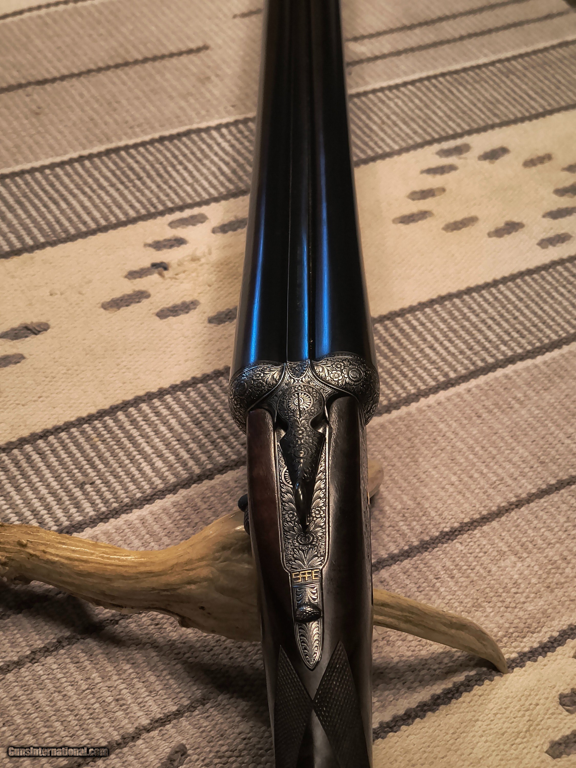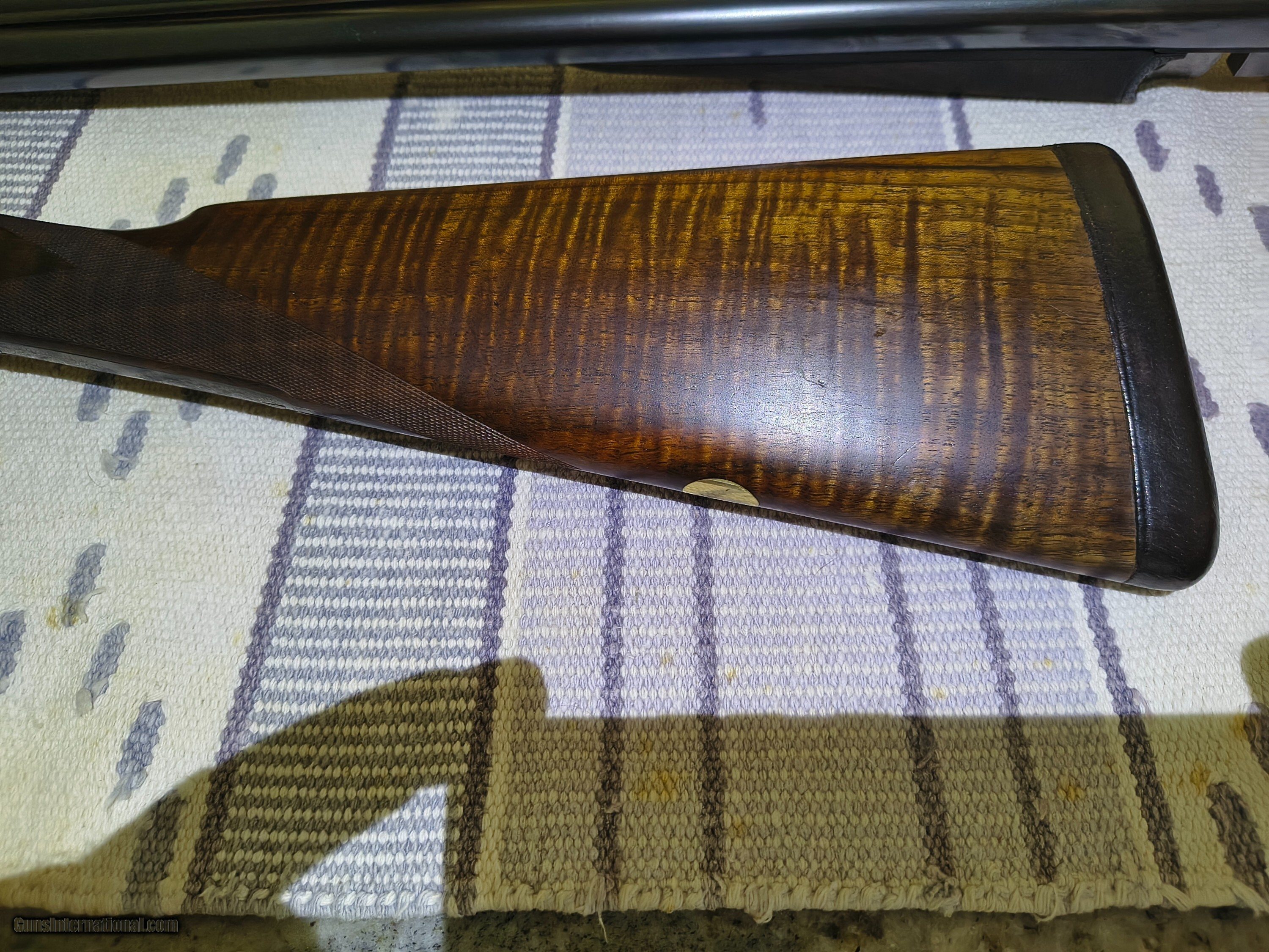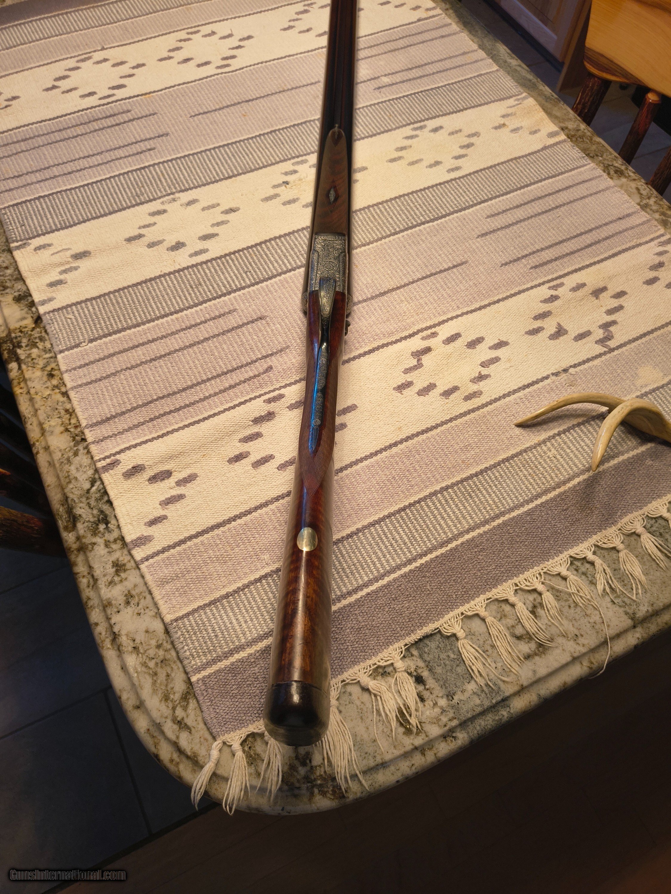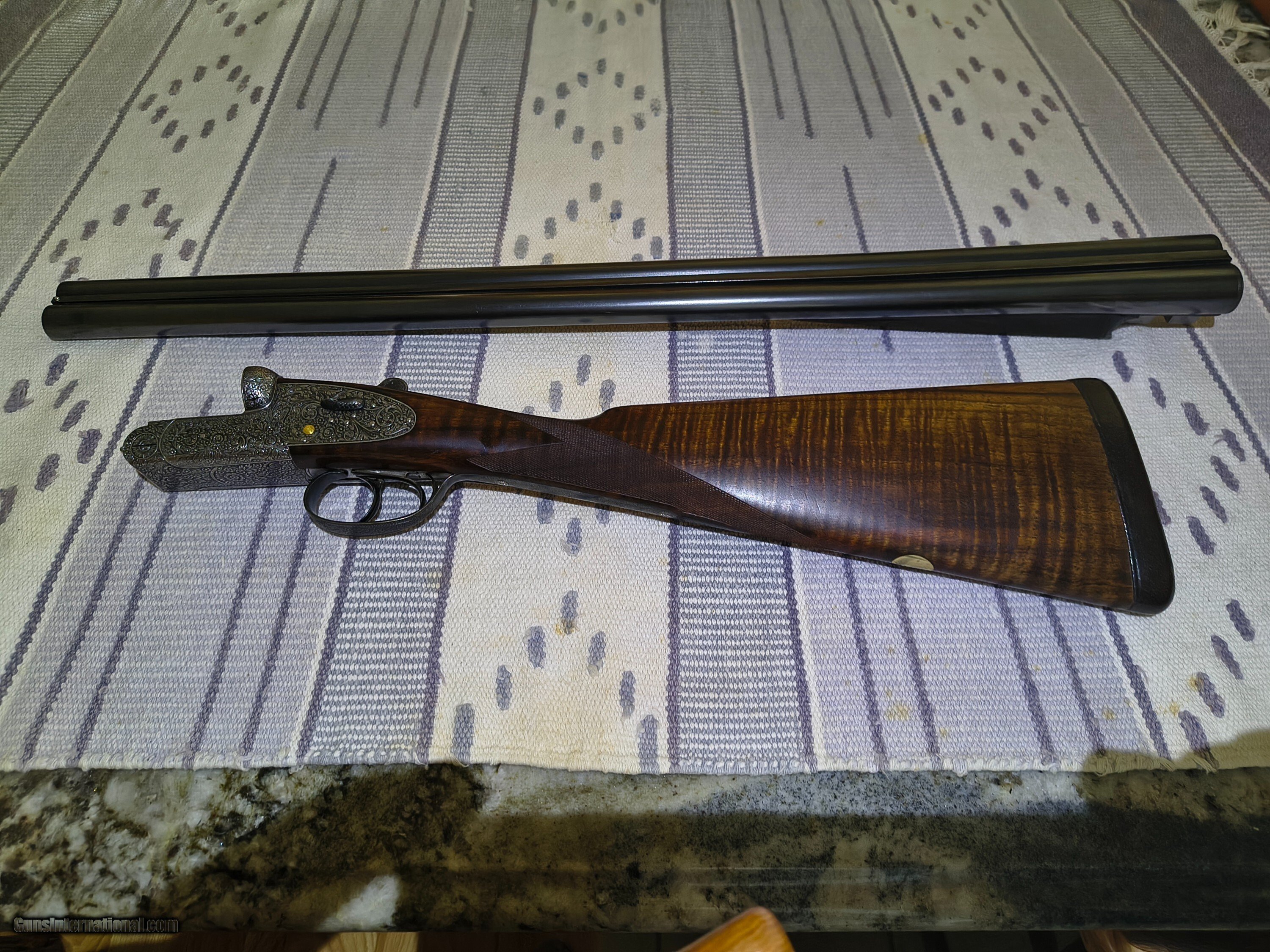 Description: This was the Very Best Union Armera had to offer in 1982 as Mr Jose Luis Usobiaga stated in our email conversation this was what a Royal model of today only with a Special Engraving on a Round Action and only a very few were handcrafted so the elaboration was discontinued in 1990. All best gun features H&H Self Opening auto safety rolled edge trigger articulating front trigger bushed disc strikers gold plated internals rounded action best quality hand engraving along with fiddle back European walnut with best quality leather covered pad. Barrels are chopper lump with smooth concave tapered rib 27 1/8 " length bores are both.724 chokes R. 005 L. .019 barrel weight 1.350 kg. Cased in a earlier Spanish leather case . First One I have ever owned or seen for that matter. !!! CALL FOR PRICING !!! . Shotgun Gauge: 12 Gauge Manufacturer: Union Armera / Grulla Model: # 1 Serial Number: 286xx Barrel Length: 27 1/8 Bore Info: .0724 Both Chambers: 2 3/4 Ejectors: Yes Condition: Excellent Metal Condition: Excellent Wood Condition: 97% Bore Condition: Excellent Barrel Type: Chopper Lump Action: Hand Detachable Sidelock Triggers: Double Stock: English Grip Stock Dimensions: 1 3/8" x 2" x 15 Stock Cast: 1/4 heel 1/4 toe Fore End: Small Splinter Butt Pad: Best Quality Leather Covered LOP: 15 Rib: Taper smooth concave Finish: Original Weight: 6 lbs 14 oz Sights: Single metal front Manufacture Date: 1982 Chokes: Fixed Choke Left: .019 / Mod Choke Right: .005 / Skeet Engraving: Yes Best Quality Case: Yes Price: POR Contact Seller |