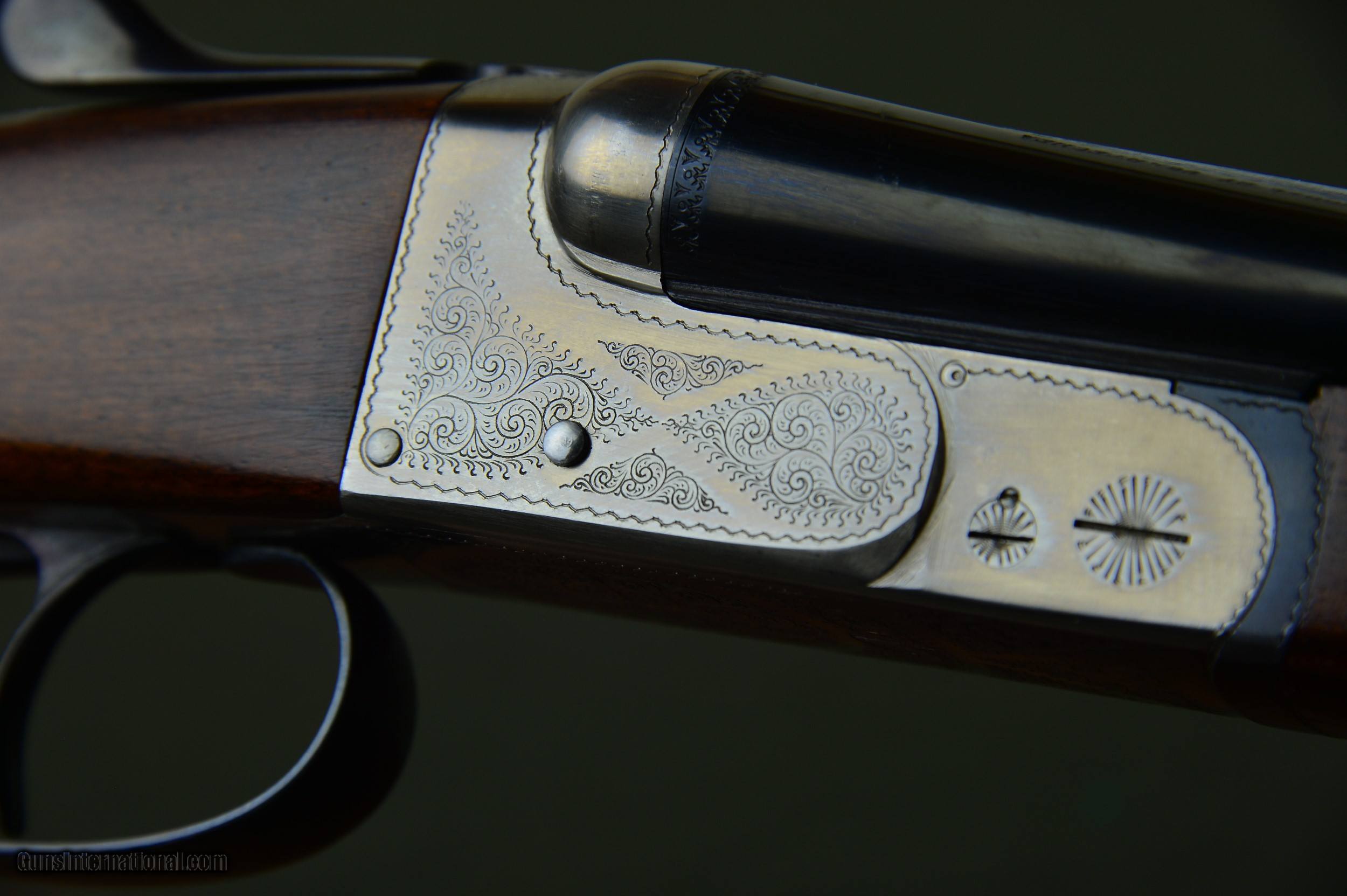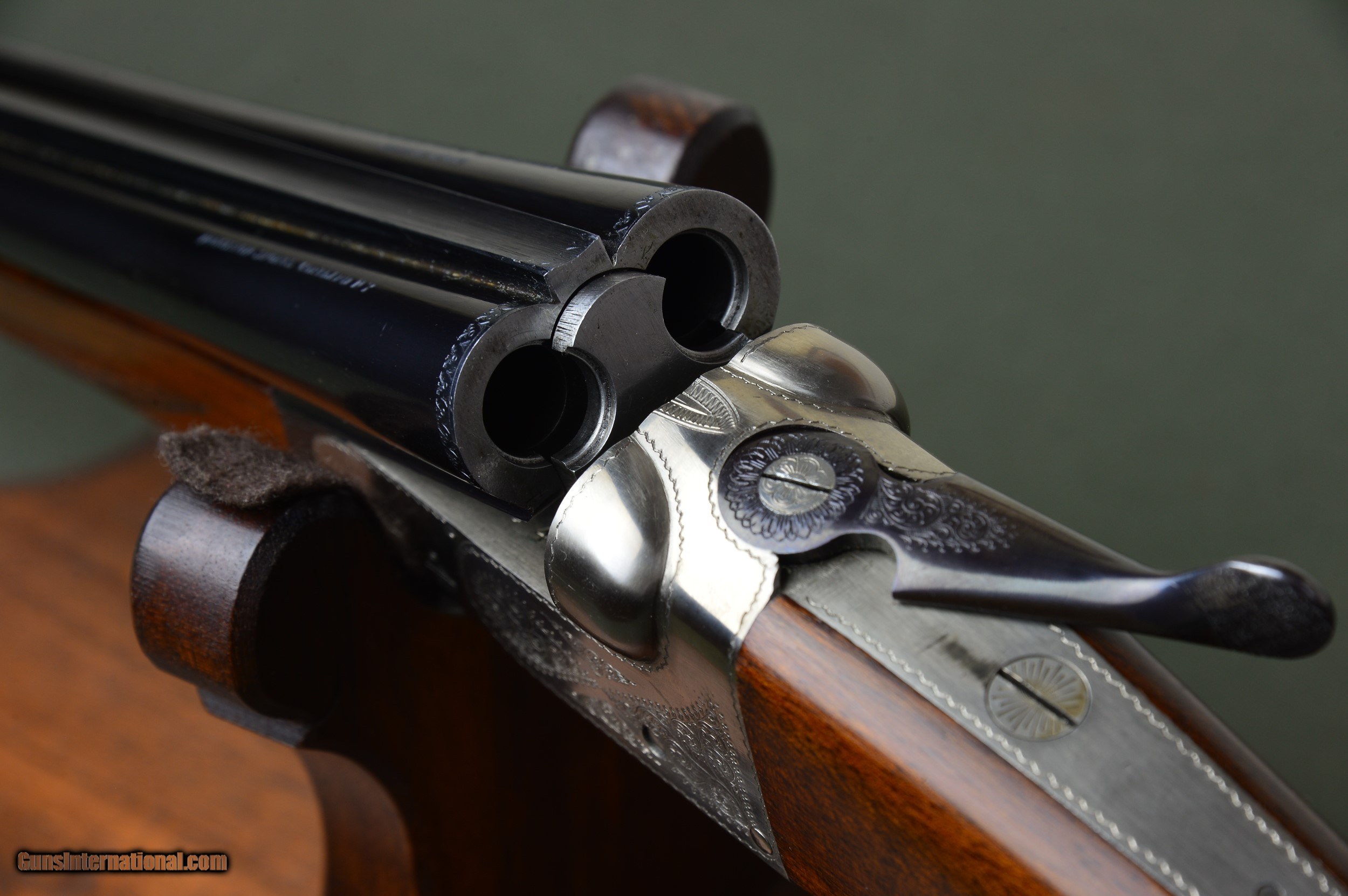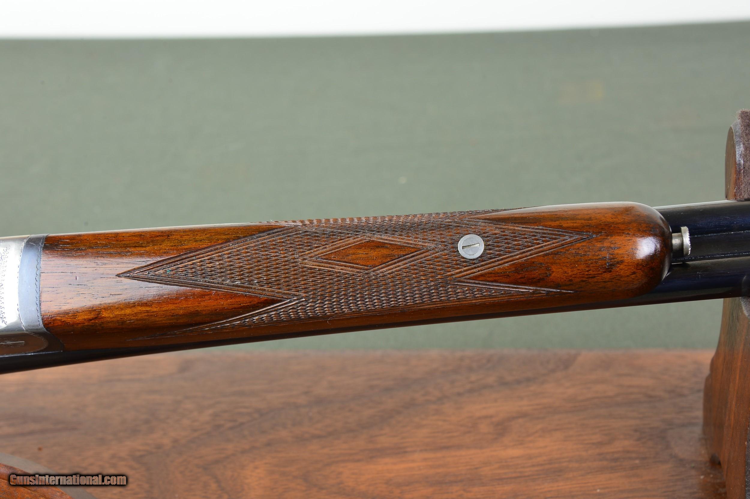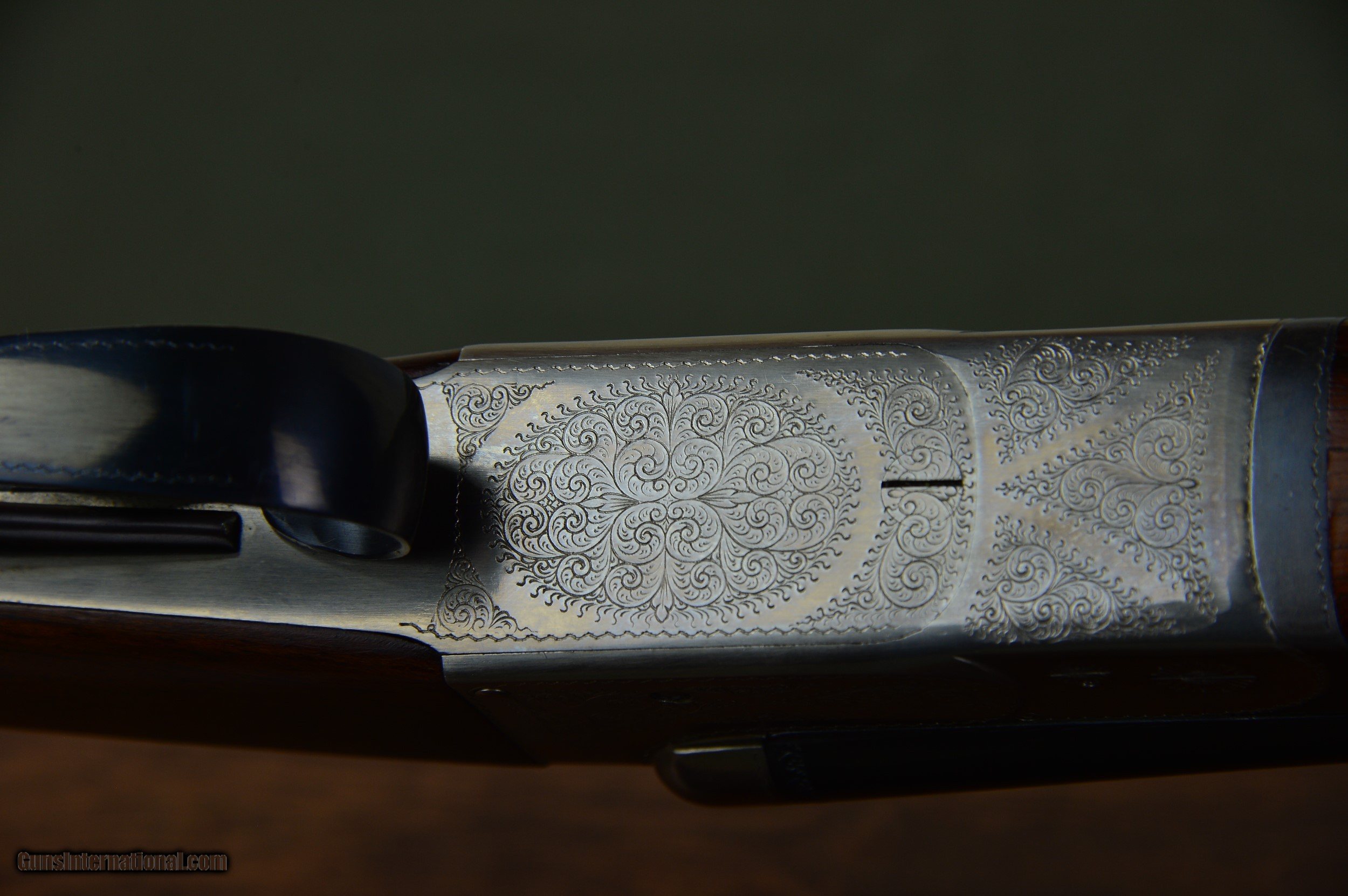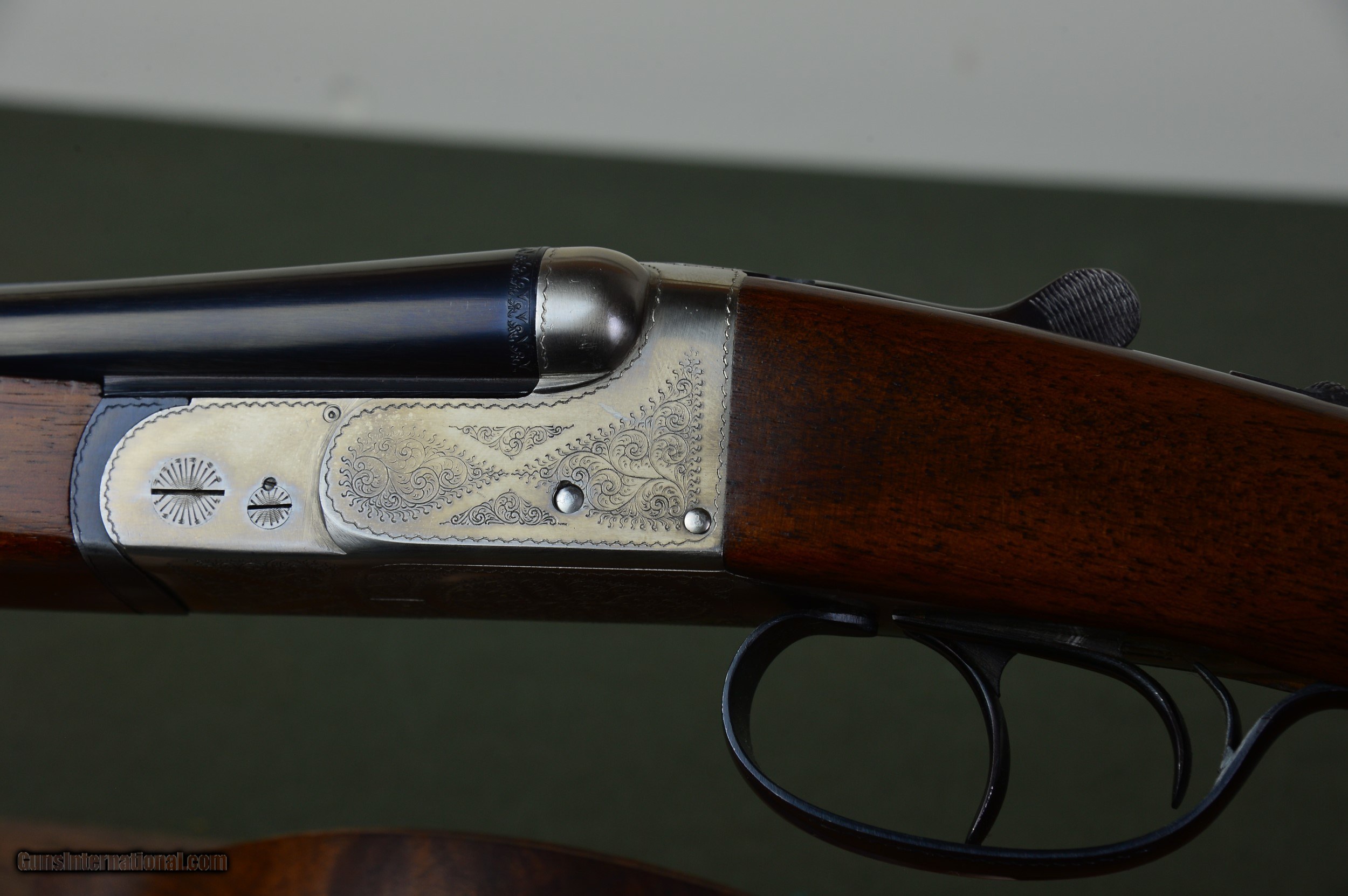 Description: *** SOLD *** Handy little Ugartechea .410 boxlock with lightly figured straight grained European walnut straight grip stock and splinter forearm. Nicely engraved frame with about 50% coverage. Has double triggers, extractors, and manual safety. Weighs 5lb 6oz so very easy to carry afield. This gun has been shot very little. *** The 26” barrels are chambered for 2-1/2” and 3” shotshells. They are topped by a raised solid concave game style rib. The chokes are Modified and Full. Bluing is excellent. *** The stock is made from lightly figured European walnut. Finish is excellent. Checkering is crisp. The stock dimensions are 14-1/2” to a checkered butt covered with a thin rubber pad by 1-3/8” by 2-1/8”. Cast off for the righthanded shooter. *** Excellent mechanical and cosmetic condition. What a great little upland gun for doves, quail, grouse and woodcock. Easy to carry all day but quick into action. Nice engraving. Won’t last long. *** I am an FFL dealer and will need a signed copy of your dealer's FFL license. Buyer is responsible for all shipping, insurance and related charges. I give a three-day non-firing inspection and will only accept returns if gun is not as described. SOLD |