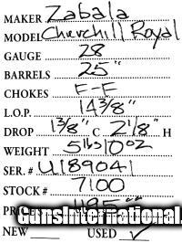 Description: Zabala Churchill Royal 28 gauge SOLD Serial Number: U189041 Barrels: 25 Stock Comb: 1 3/8 Stock Heel: 2 1/8 LOP: 14 3/8 Weight: 5lbs 10oz Chokes: F-F |