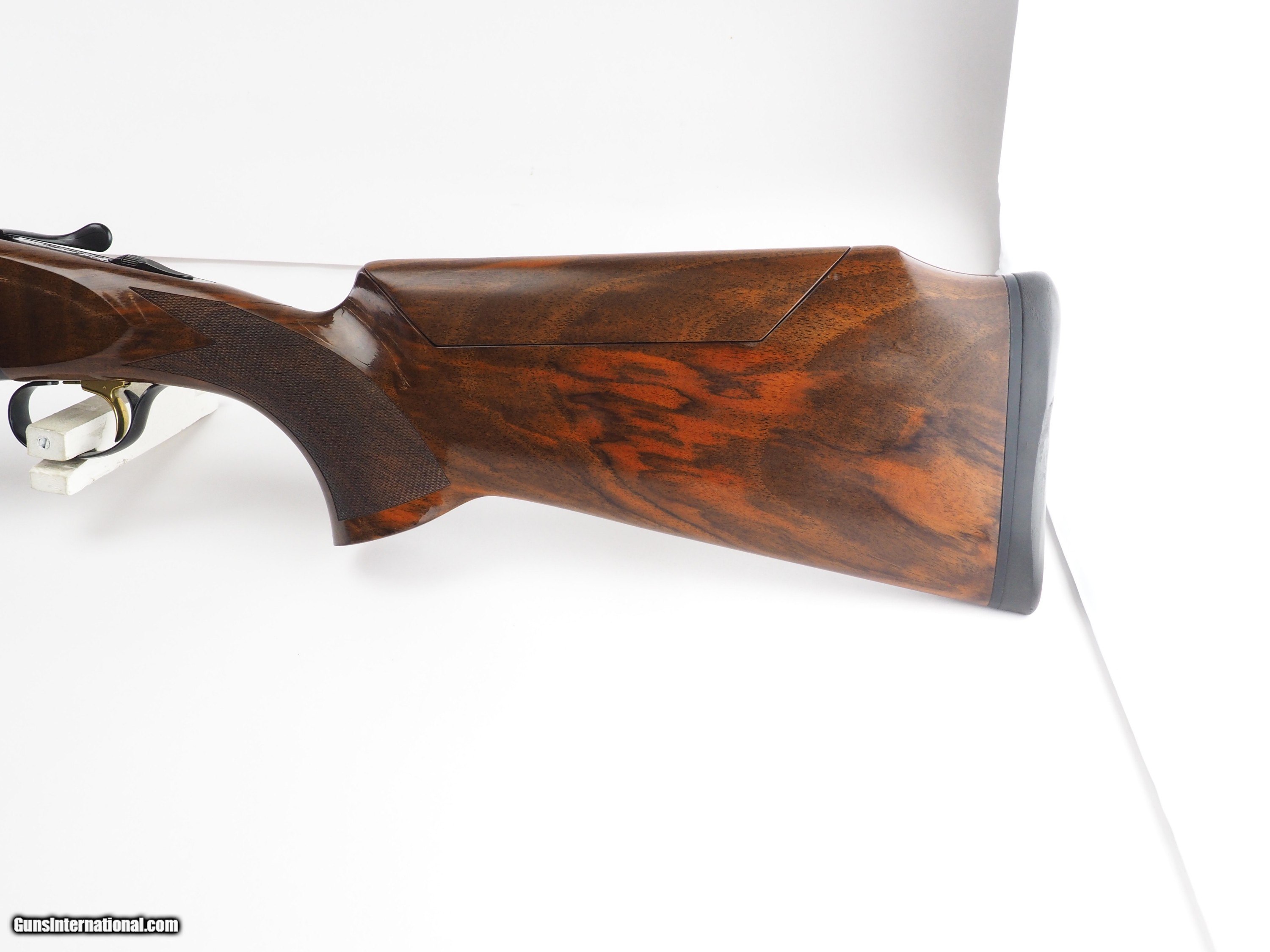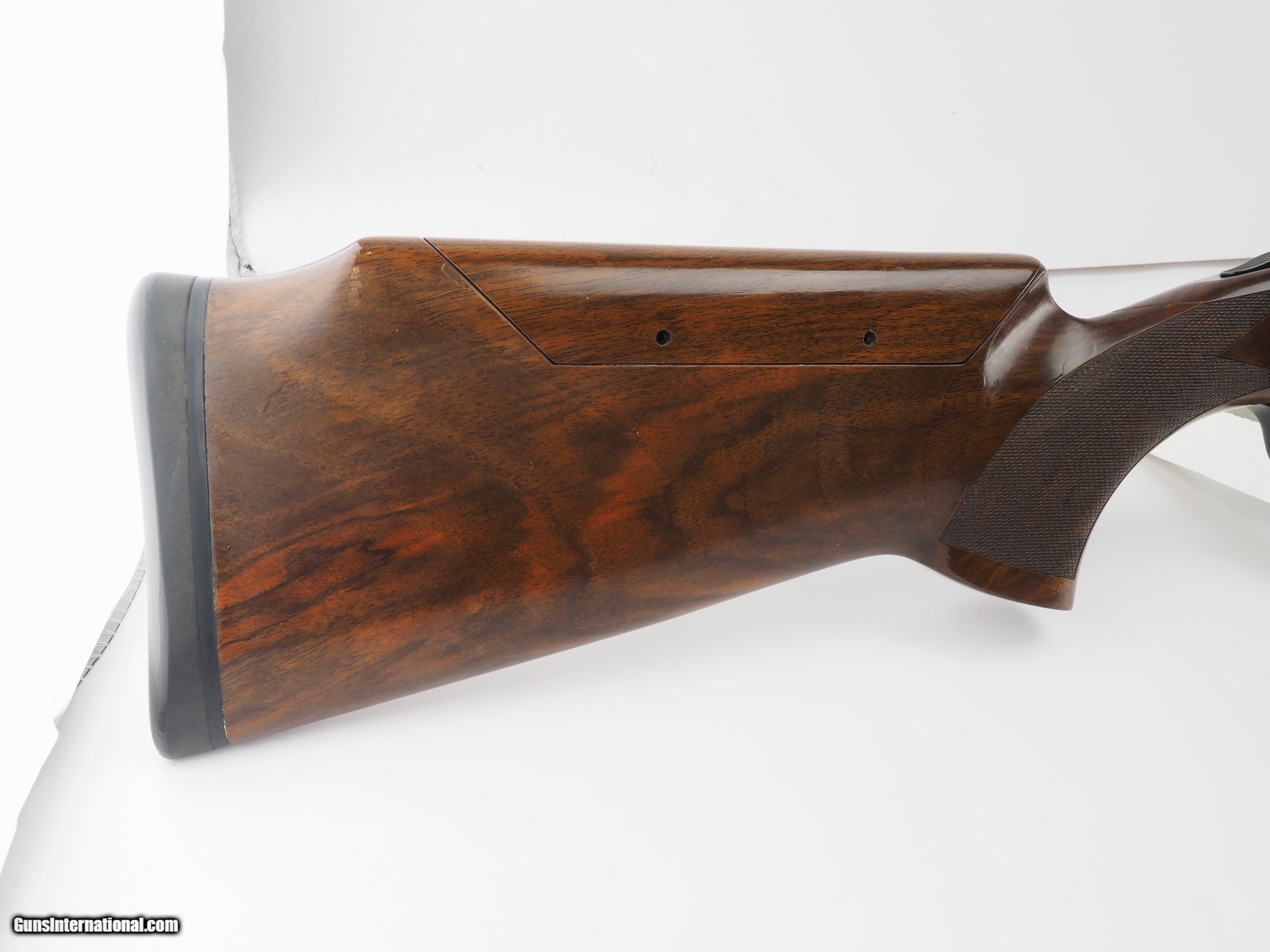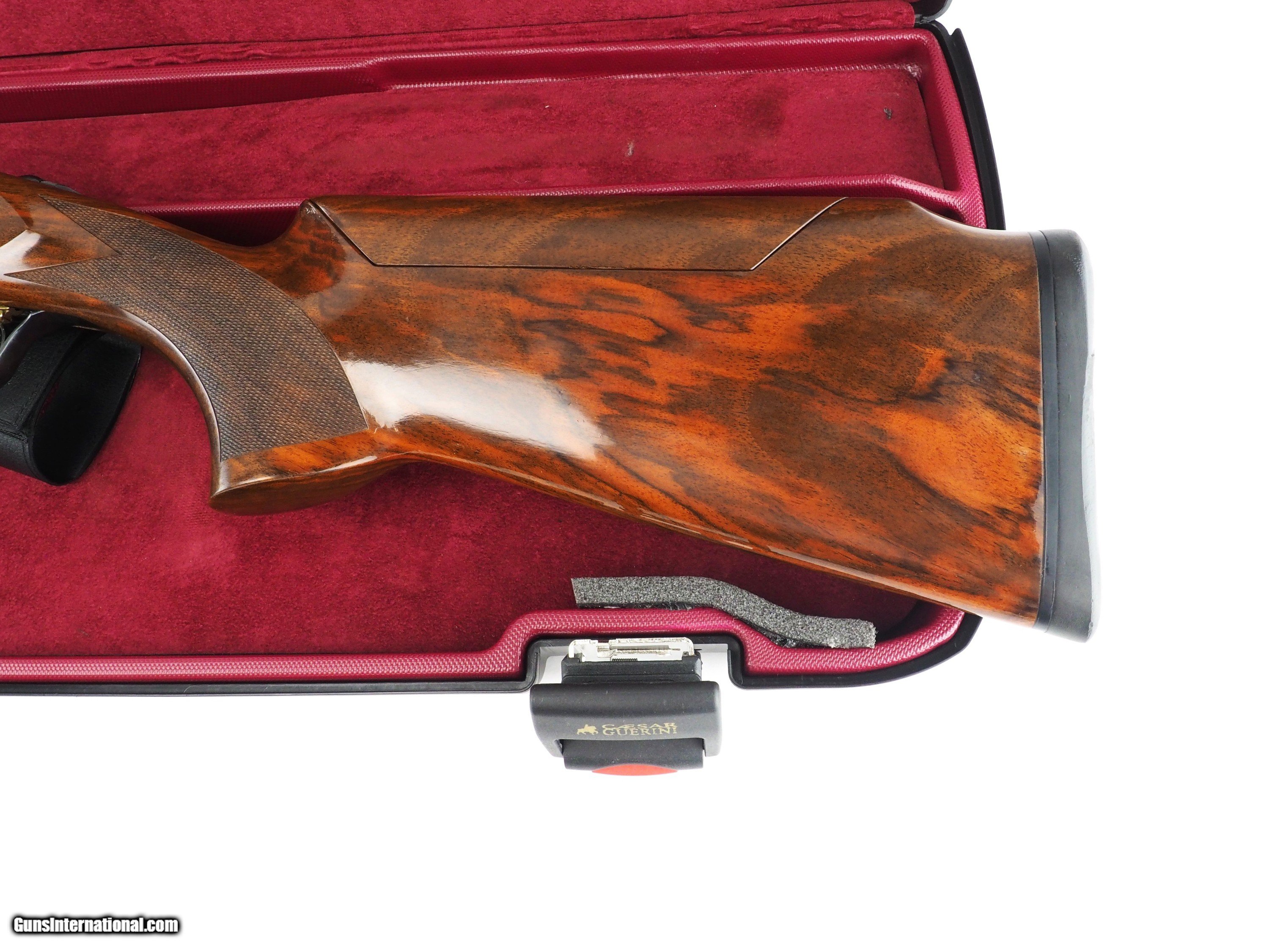 Description: 2013-production Guerini Summit Impact with 32” barrels, uncut Monte Carlo stock, factory original recoil pad, and a fresh full-service Pit Stop at Guerini USA prior to being listed for sale here. The metal finish is excellent, to include the easily-marred corners of the aluminum rib. The stock finish was enhanced by a well-meaning amateur, which frankly is still an upgrade over an 11-year-old factory oil finish! Top lever is well to the right, nearly to the edge of the wood. Barrels open smoothly with zero flop. Comes complete in factory case with chokes and accessories as listed below. Make: Caesar Guerini Model: Summit Impact Gauge: 12ga Hand: Right Barrel length: 32” LOP: 14.75” DAC: 1.57” (40mm) DAMC: 1.81” (46mm) DAH: 2.36” (60mm) Year of manufacture: 2013 [CI] Chokes: C, S, IC x2, M, LF, F Accessories: factory soft comb (shows moderate wear), stock wrench, trigger wrench, chokes, choke box, choke wrench Case: factory period-correct sporting SOLD |