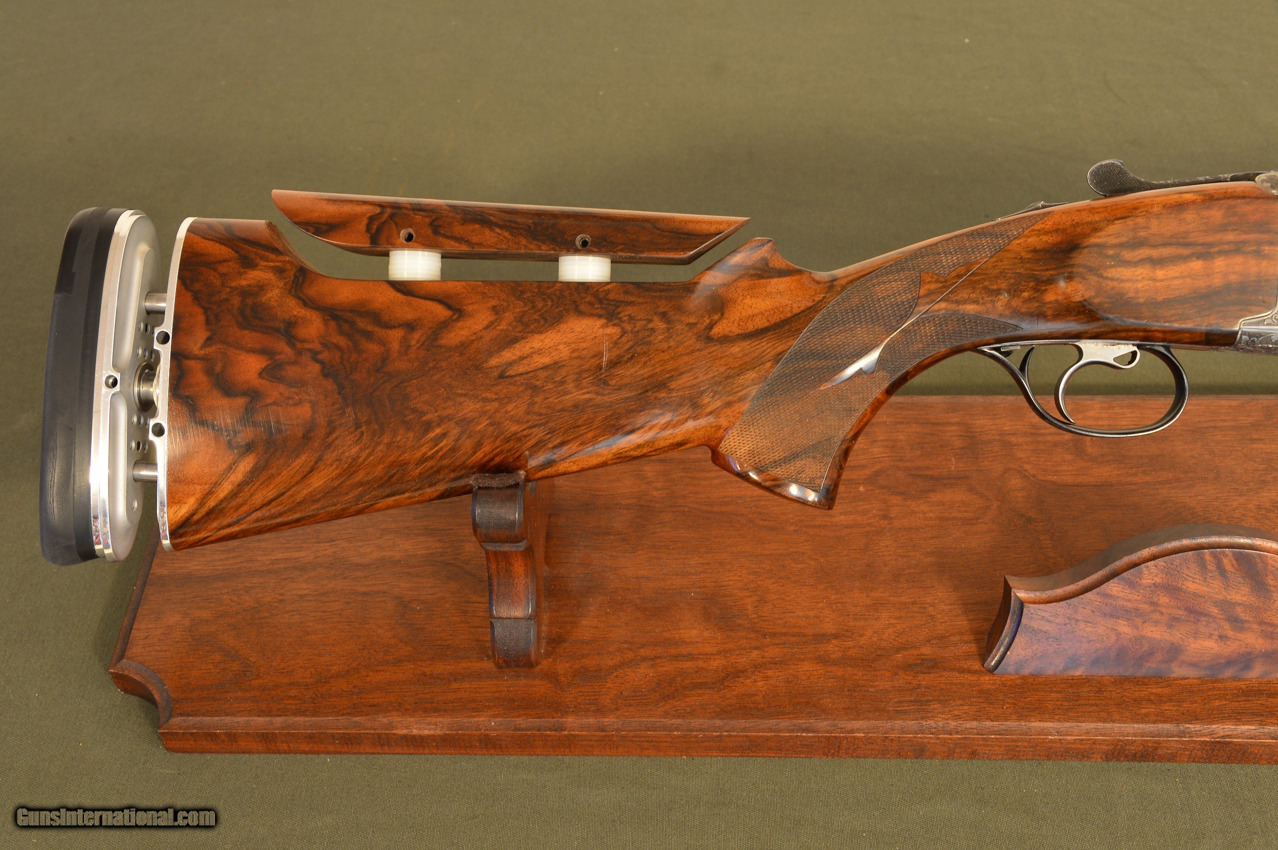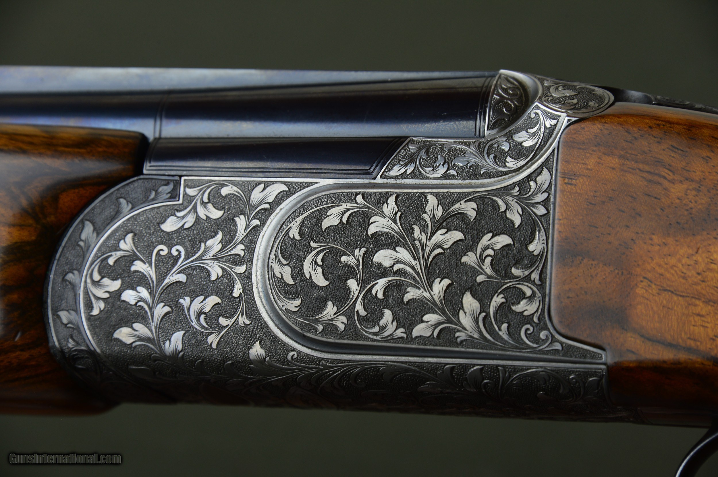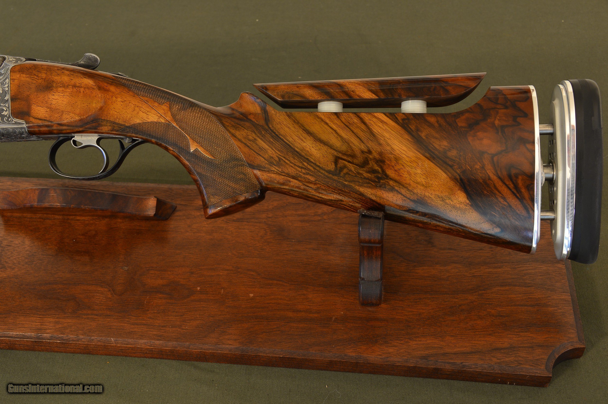 Description: *** SOLD *** Handsome and fully engraved Italian-made 12 gauge Filli. Gamba Montreal Grade 2 Sporting / Trap / Skeet Competition shotgun cased with 3 sets of barrels and two sets of hand detachable trigger groups. Made in 1980 this great gun comes with 30"(76cm) and 28"(71cm) barrels both of which were added later and are Briley choked. The gun originally came with 26-3/4”(68cm) Boehler Steel barrels with the famed “Tula” style skeet chokes to commemorate Gamba’s win in International Skeet in the 1972 Olympics. The gun was beautifully engraved and signed by Corti e Narcisi and has a highly figured European walnut stock. It is interesting to note that both Danielle Perazzi and Ivo Fabbri learned the guntrade at the benches of Gamba! *** The Briley choke tubes include the following: Skeet 1, 2-IC, LMod, 2-Mod, and 2-IMod along with a Briley choke wrench. *** The highly figured European walnut stock has an adjustable comb and an adjustable Graco recoil pad. The length of pull is 14-5/8” as pictured. The comb is adjustable so the shooter can set his/her preferred drop at comb and heel. *** The gun is cased in a nice trunk case. It shows little wear on the outside but the inside lining needs some minor repair work. Come with washers for the adjustable comb and the tools to adjust the Graco recoil pad. *** This is a beautifully engraved high quality over/under ready for game or clays. It is a unique competition gun with its three sets of barrels and meets the needs of the contemporary shooter with its adjustable comb and recoil pad. You will be proud to uncase this beauty at the range. *** I am an FFL and will need a signed copy of your dealer’s FFL. Buyer is responsible for all shipping, insurance, and any other related charges. I give a 3-day non-firing inspection period and will only accept returns at buyer’s expense. SOLD |