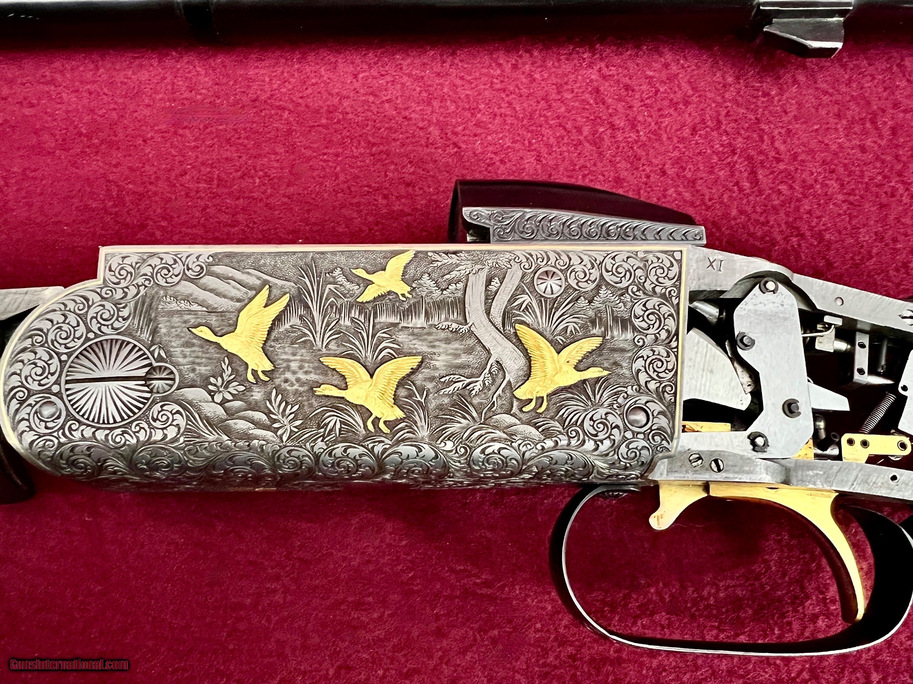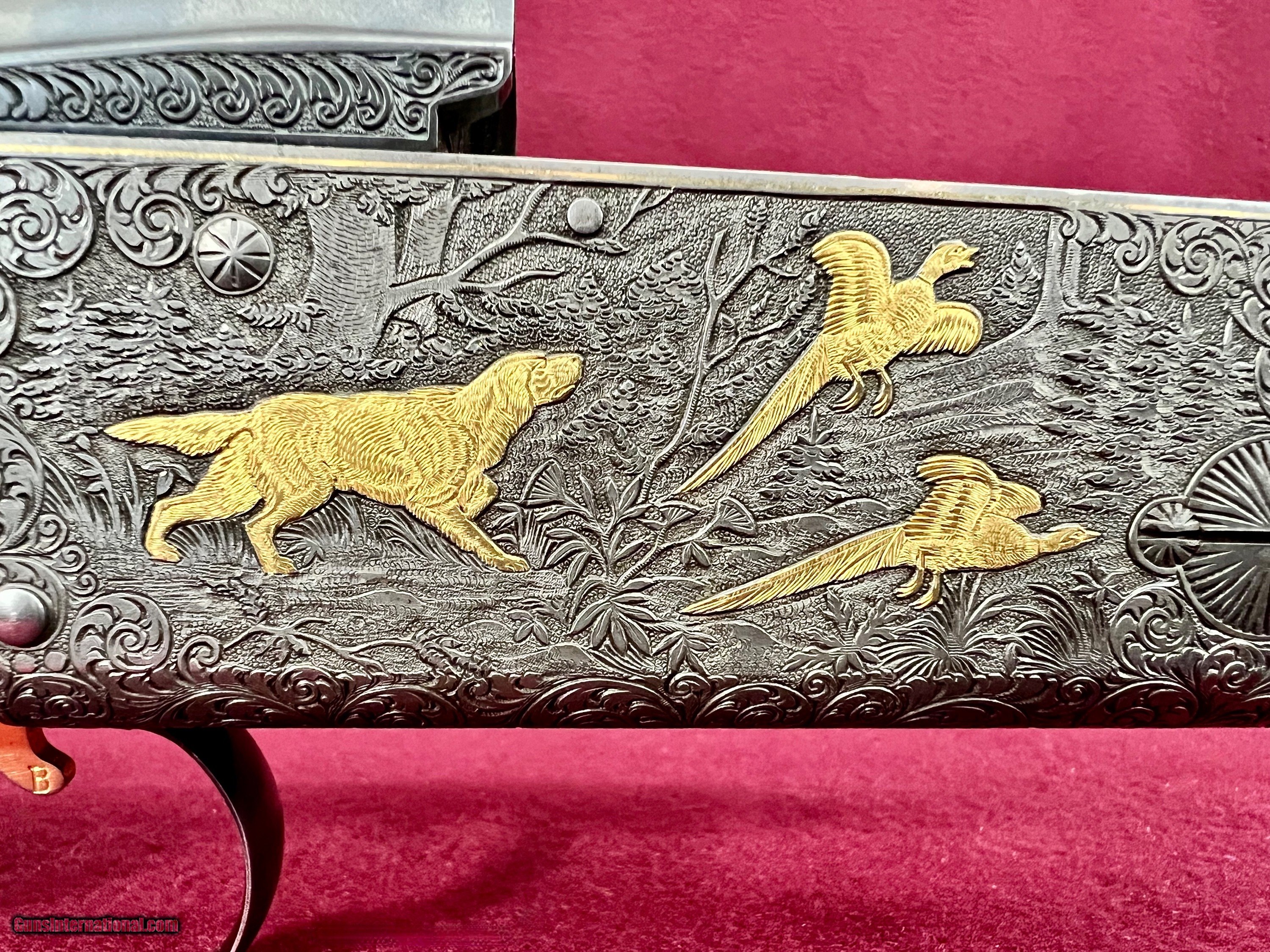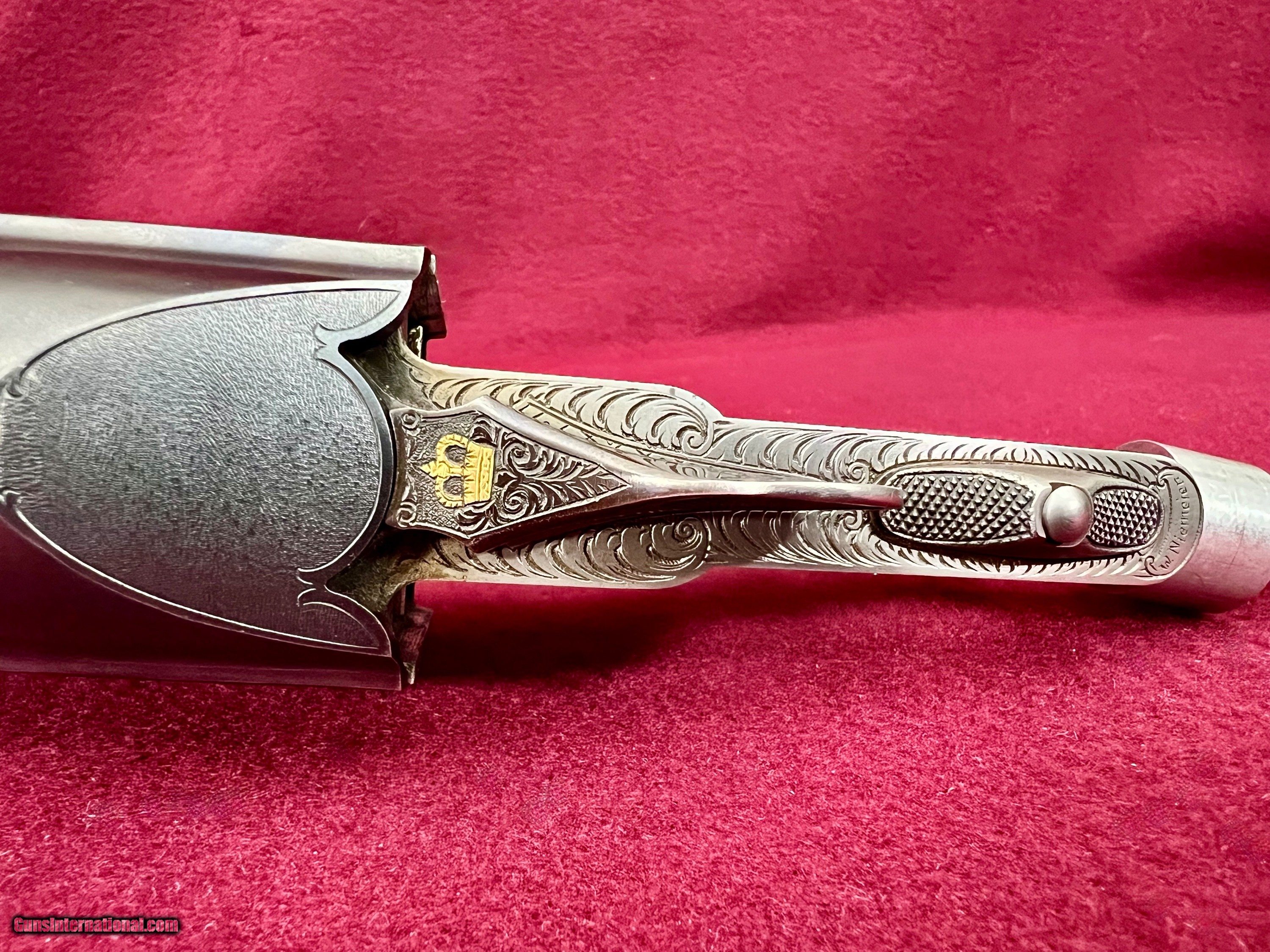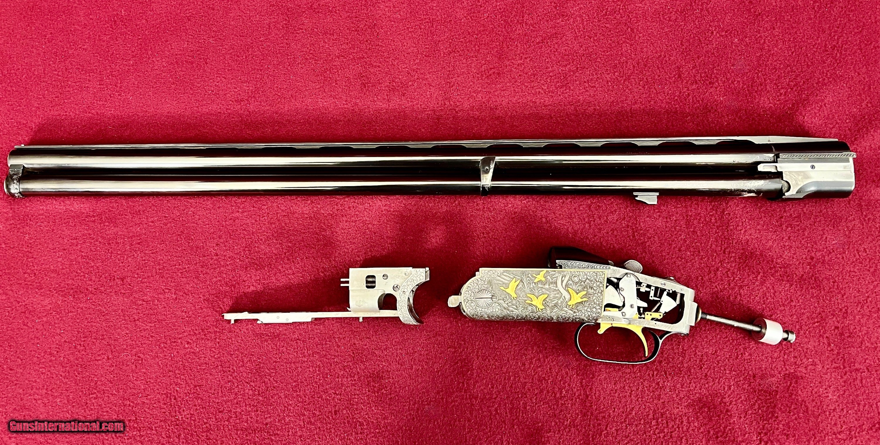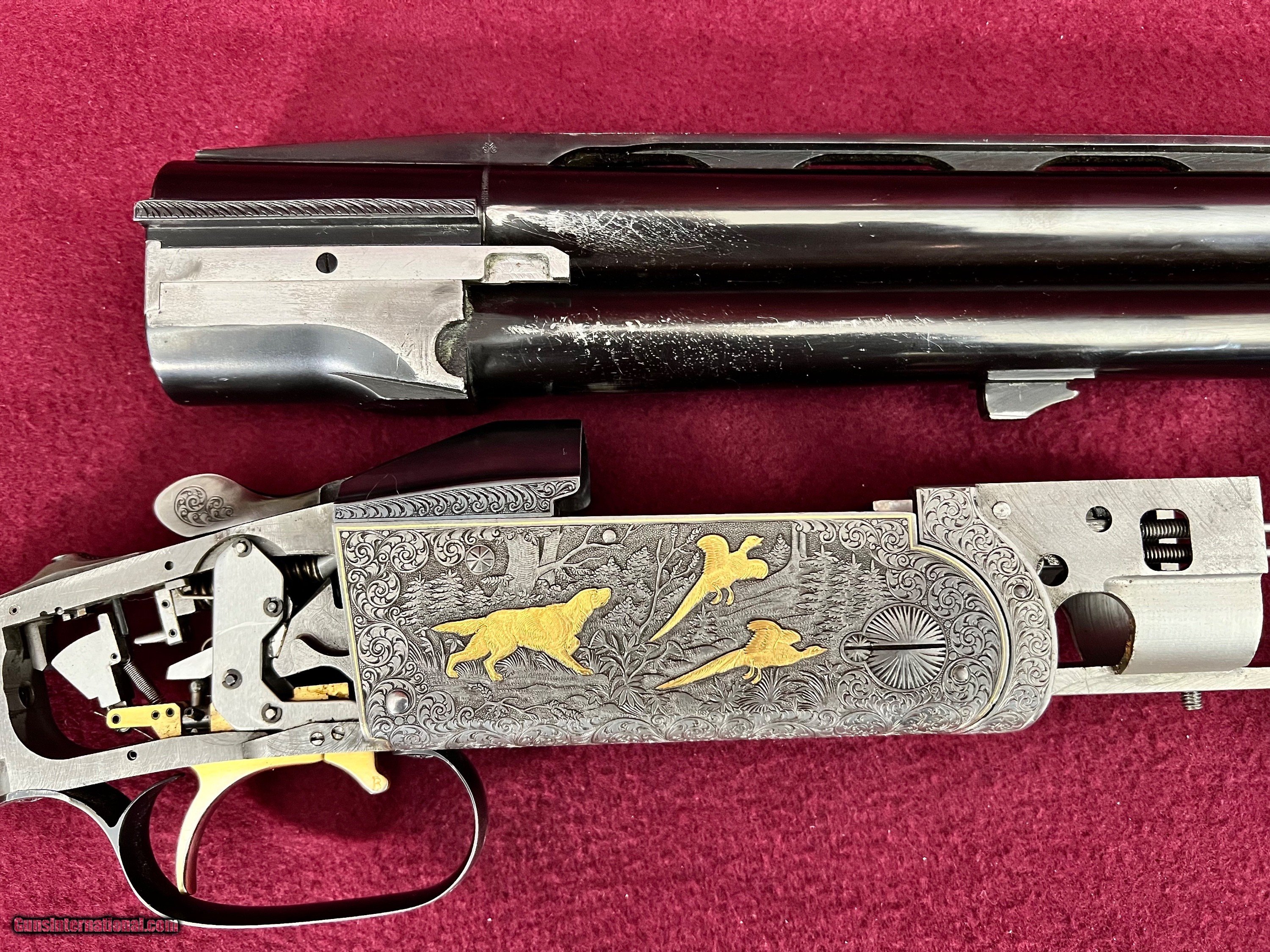Description: I have for sale a beautiful Krieghoff K32 Crown Grade set serial number 10900. The set includes the receiver with gold ducks on the left side, an English Setter and Pheasants in gold on the right, and the gold crown on the bottom of the receiver. The set also includes the forend Iron and 30 inch barrels all with matching numbers and all with matching engraving. On the 30 inch barrels the bottom barrel has had Briley thin wall chokes installed, and comes with one flush tube with .015 constriction. The top barrel is fixed choke at .034 constriction. The vent rib is straight 10mm. All you need to do is add your K32 wood and you are ready for a day on the trap field or for sporting clays. Price of this beautiful set up is $14,000 plus $75 shipping to your FFL. Take a look at the attached photos and I think you will agree this is a very special set. Shotgun Gauge: 12 Gauge Manufacturer: Krieghoff Model: K32 Crown Grade Serial Number: 10900 Barrel Length: 30 Inches Chambers: 2 3/4 inches Ejectors: Selective Well Timed Stock: None Chokes: IC Briley and Full Fixed Engraving: Crown Grade Price: $14,000.00 Contact Seller |