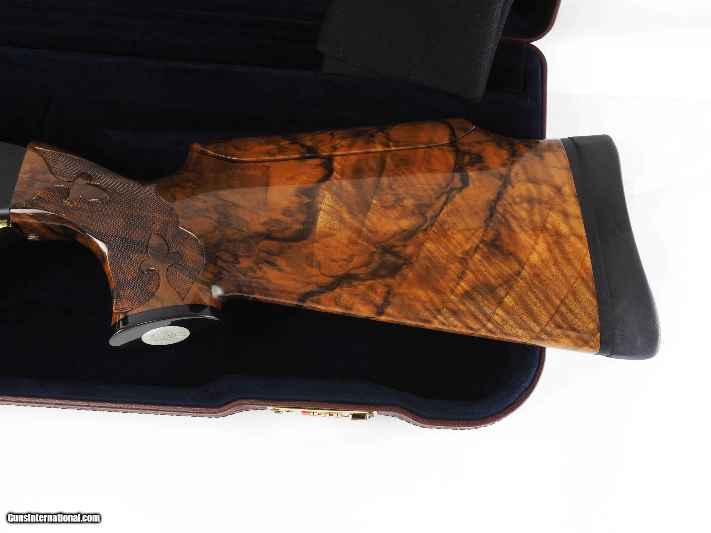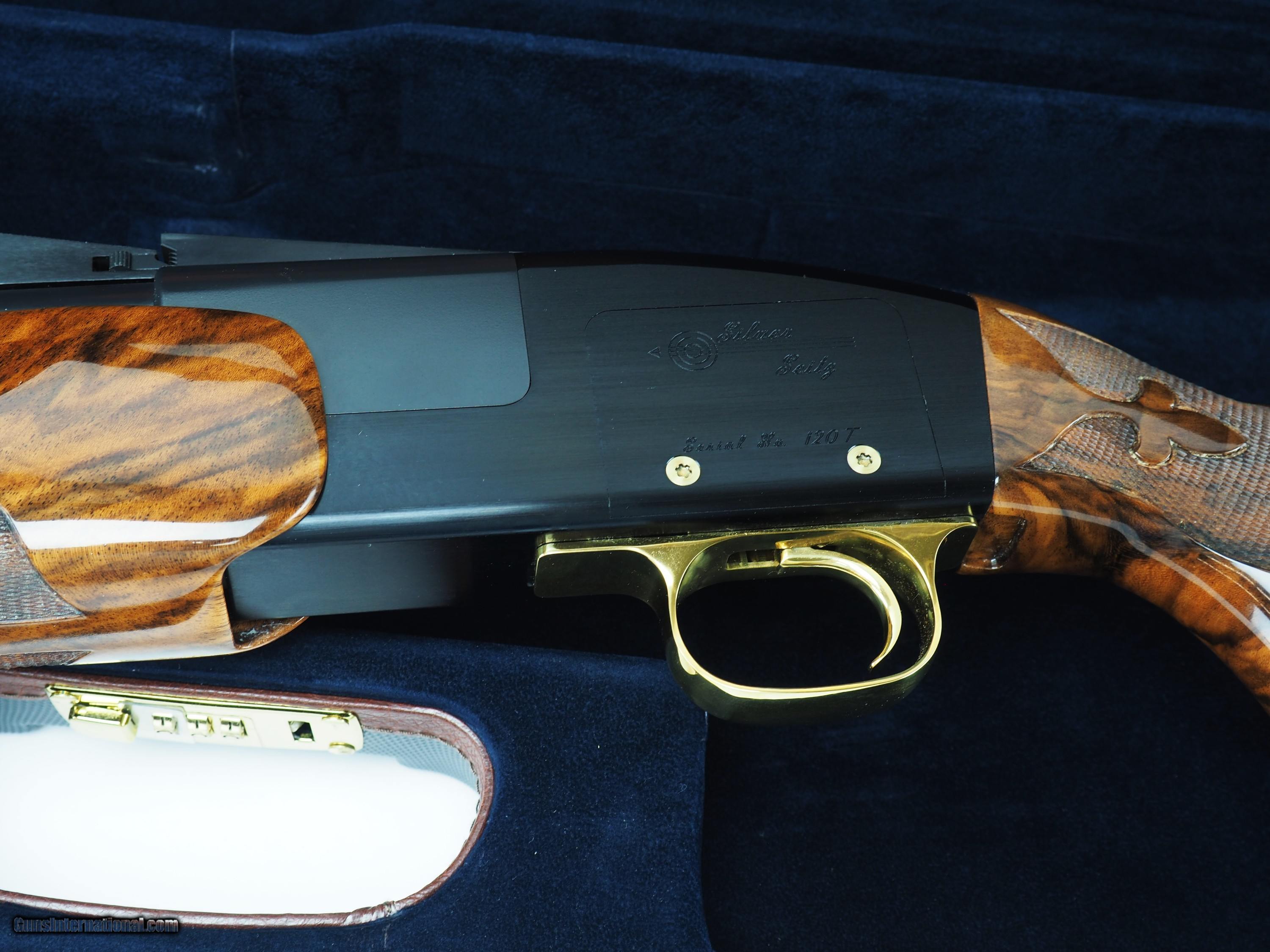 Description: This high grade example of the Silver Seitz over and under has a lot of desirable options. 32" barrels chokes .018" bottom and .029" top. Bores are .740". Receiver is solid Titanium and has the black Nitride coating. The trigger guard and trigger are gold nitride. The wood is Turkish walnut with exceptional figure as well as strength. It currently has double release triggers and can be switched to pull/pull. The gun comes with a Negrini travel case and appropriate tools. The gun is new and unfired. Comes with 2 Ribs a #1 60/40-90/10 and a #2 80/20-about 120% Price: $24,950.00 Contact Seller |