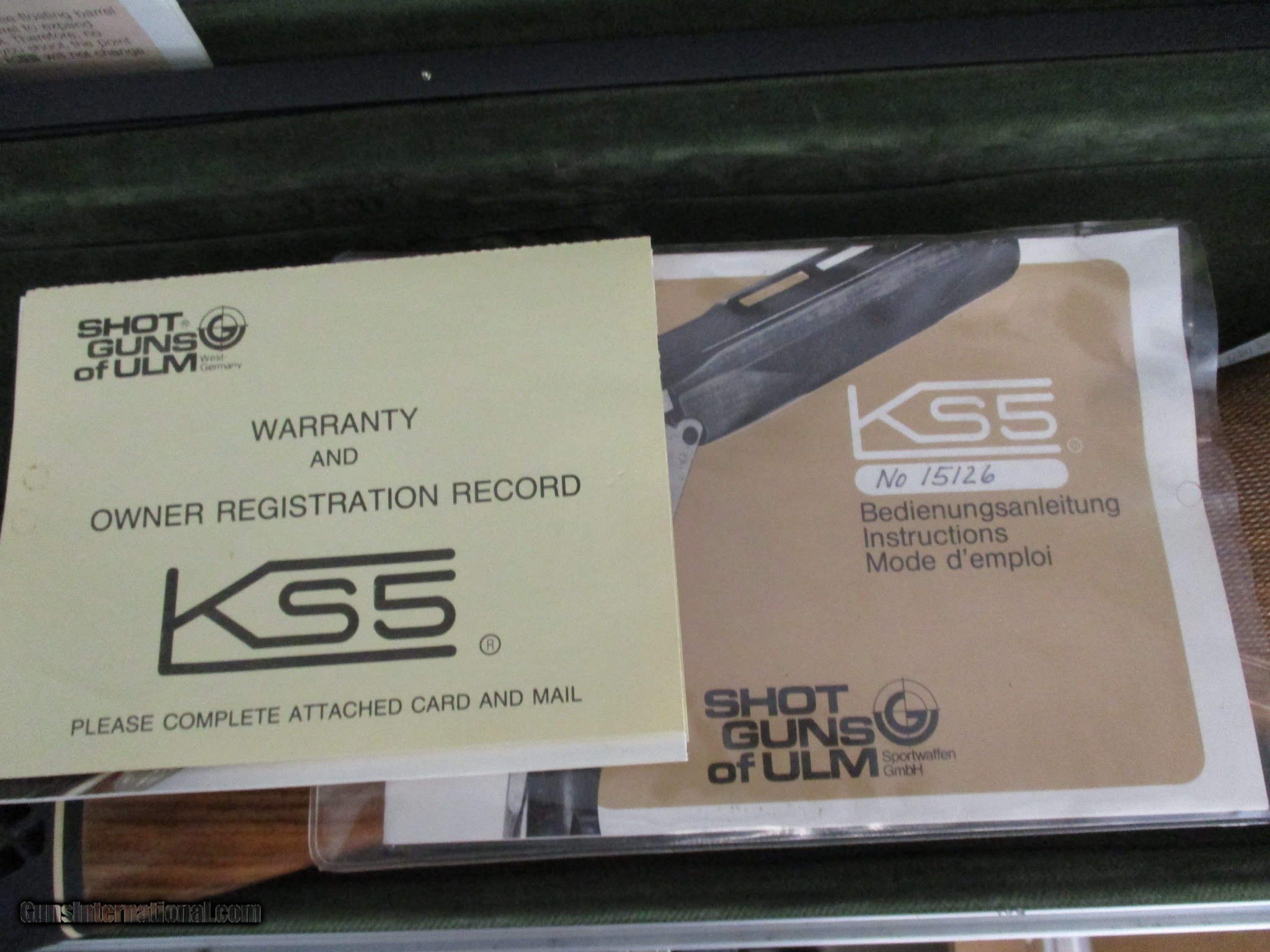 Description: Kreighoff KS5 34' 12 gauge, excellent condition, includes 3 Kreighoff chokes, manuals, tools and hard aluminum case w/keys LOP is 14 3/8, Pull trigger, wood is excellent as in metal, no scratches, cracks, both wood and barrel are in like new condition. One of the nicest I've seen shipping is $35 SOLD Shotgun Gauge: 12 Gauge Manufacturer: Kreighoff Model: KS5 Barrel Length: 34 |