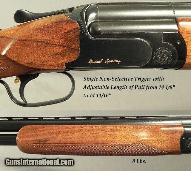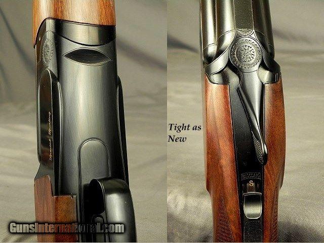 Description: #79837, Perazzi Mirage-S Special Sporting 12 Bore O/U Made 1990 with 28" Flat 11 x 7 mm Vent Rib barrels that remain in excellent plus condition with 2 each Briley Extended Screw Chokes at .727" .005 & .032" (Skt.I & Full), 2 3/4" chambers, KG 1,460 weight barrels, Vented side ribs, Single non-selective trigger with the adjustable LOP feature from 14 11/16" to 14 1/8", Detachable trigger group with leaf springs, Type 4 forend, Pistol grip stock at 14 11/16 x 1 3/8 x 2" over the factory 1" pad, Slight cast-off for the right hand, 8 lbs., Very nice wood with very nice color and contrast, It has 96% factory blue on the barrels but has surface blemishes on the top barrel (See Photo), The frame has 98% original blue, The breech face retains 90% blue, The wood is still at 98%, The checkering at 100%, The bores are absolutely like new, It remains as tight as new with all the bite left, The forend iron has the Perazzi serial #81203 but the wood has the gun number, The trigger group has the Perazzi serial #81203 as well and appears just like a brand new trigger, A Perazzi U.S.A. imported gun. This is a very nice Perazzi Sporting Gun with nice wood and it still has 97-98% mechanical life left in the piece. The gun was shot but I can assure you it wasn't much. SOLD |