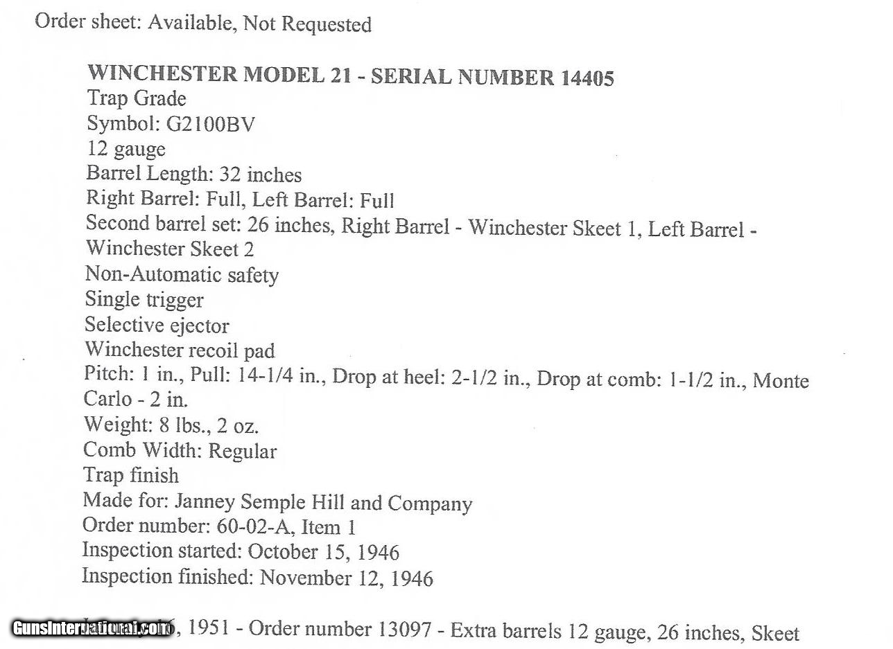 Description: "Vent Ribs\n\nFactory sheet included SOLD Manufacturer: Winchester Model: 21 Trap Grade 2bbl set Serial Number: 144xx Ejectors: Yes Barrels: 32/26 Vent Ribs Action: Box lock Triggers: Single selective Gauge Info: 12GA Stock Comb: 1 1/2 Stock Heel: 2 1/2 2 at the mont Fore End: Beavertail Butt Pad: 1 LOP: 14 1/4 Weight: 8lbs 2 oz |