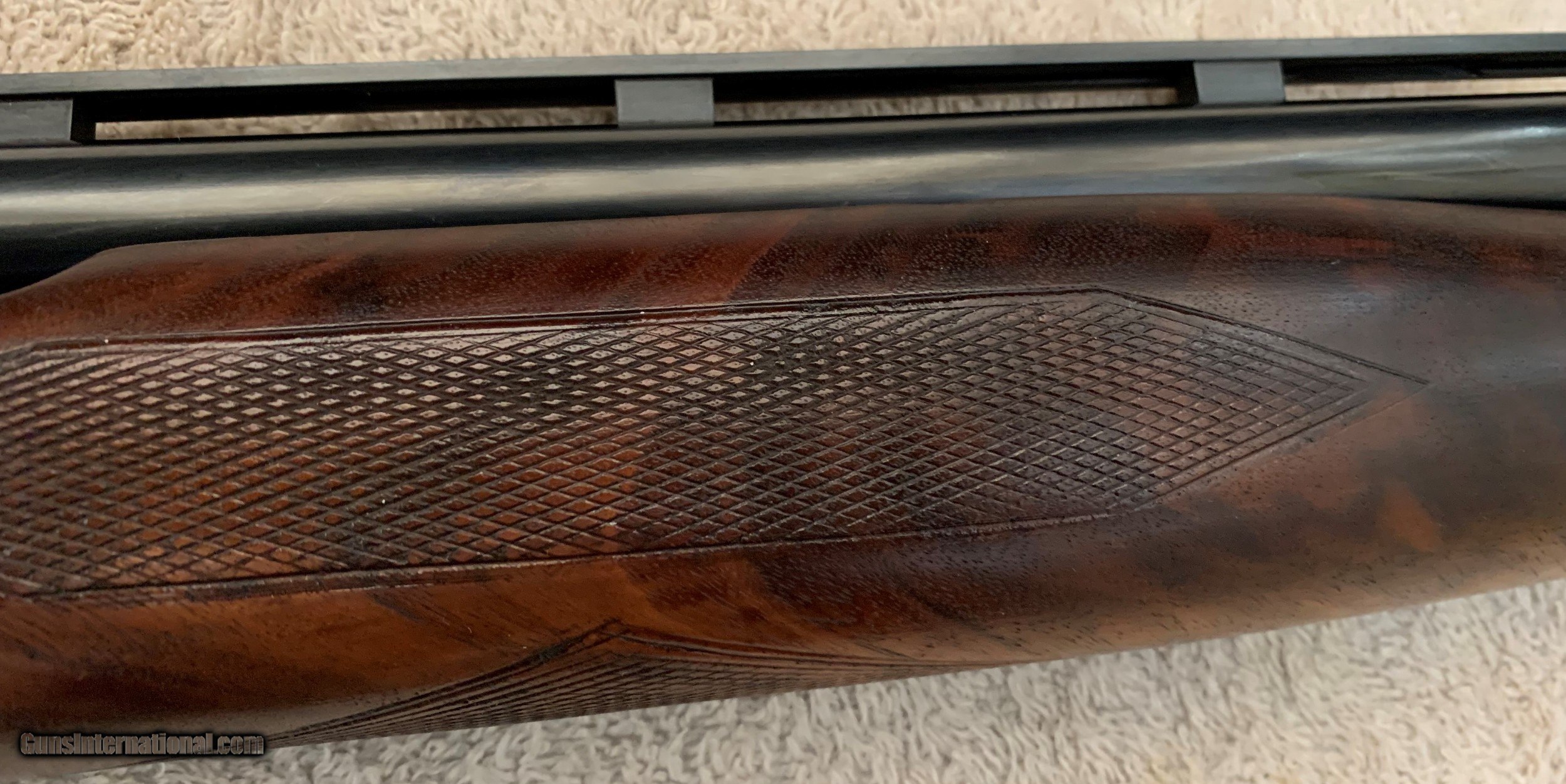 Description: Winchester Model 12 Late production (1962) 12 Gauge Trap configuration with a 30" Barrel, a Full Choke, and square bolt. Factory 3 Pin Duck Bill Vent Rib with 2 steel sighting beads. The original finish on the metal shows only very minimal wear, mostly contained to the magazine tube and slide bars. The wood shows a great deal of figure in both the forearm and in the Monte Carlo stock. More so on the left side of the butt than on the right side. The LOP is 14 1/4" to the end of the 7/8" KICK-EEZ pad. Approx.1 3/4" drop at the comb, 1 3/8" top of Monte Carlo, and 2 1/4" at the heel. The gun appears to be all original except that a previous owner, for some reason, applied additional finish to the wood. Unfortunatlely, it covered the checkering which took away from the sharpness and the appeal. But it is a very nice trap gun that has seen little use, (none from me unfortunately). Buyer pays actual shipping charge. Payment needs to be made by Postal Money Order or Certified Check. SOLD Curio/Relic: Yes Shotgun Gauge: 12 Gauge Manufacturer: Winchester Model: 12 Serial Number: 1948281 Barrel Length: 30 Condition: Very Good Metal Condition: 95% ? Wood Condition: 90% ? Bore Condition: Mint Action: Pump Stock Comb: 1 3/4 Stock Heel: 2 1/4 LOP: 14 1/4 Rib: Factory Vent Finish: Blue Sights: Two steel beads Manufacture Date: 1962 Chokes: Full Item Location: CO |