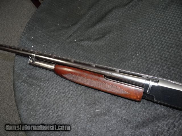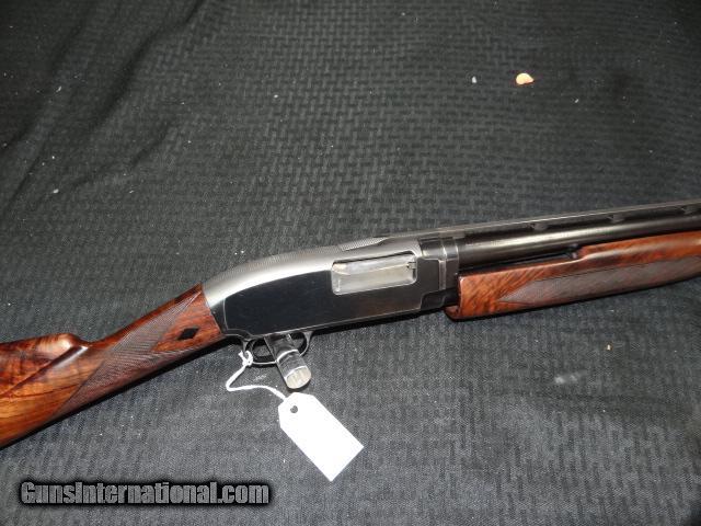 Description: Winchester Model 12 Black Diamond Trap in 12 gauge with 30" barrel choked full and 2 pin milled vent rib. Straight grip stock with burl walnut figure and original red pad. Also has a brass oval for intials . Large, over size checkered forend . Gun apprears all original ( except for oval ? ) Nice old model 12 in about 92-94% condition SOLD |