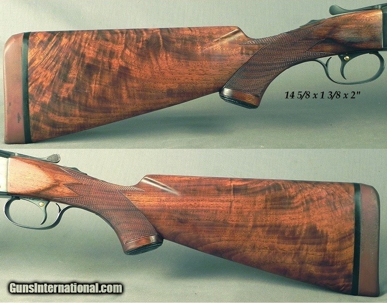Description: #26081, Winchester Model 21 Trap Grade in 12 Bore, Marked Trap, Winchester finished the gun April 18, 1950 for Ohio Valley Hardware, 30" Vent Rib Barrels at .730 .018 & .033" (Mod & Full), Factory marked Imp.Mod. & Full, 2 3/4" chambers, Forcing cones professionally opened, Single selective trigger, Beavertail forend, Pistol grip stock at 14 5/8 x 1 3/8 x 2" over a 1" KickEez pad, 8 lbs. 1 oz., "TRAP" stamped on the floorplate, Correct trap forend that is 11" in length, Correct Kidney pattern checkering, Nice wood with feather crotch and nice color and contrast, The original barrel blue is 93%, The original receiver blue is 97%, The floorplate with 97% blue, The wood finish is at 95%, The checkering remains at 98%, The bores are excellent plus. SOLD Curio/Relic: Yes Shotgun Gauge: 12 Gauge |