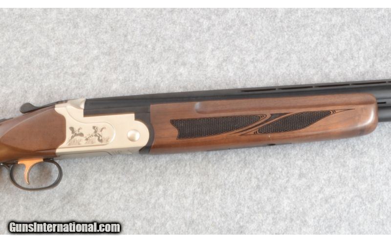 Description: New of the box shotgun. SOLD Caliber Info: 20 Gauge. Chambers: Two shot - over and under. Metal Condition: Like new. Wood Condition: Like new. Bore Condition: Like new. Barrels: 28 inches. Triggers: Gold colored, Stock: Wood with checked pistol grip. Fore End: Wood with checked grip. Butt Pad: Rubber. Weight: 7 lbs. 6 oz. Sights: Vented rib with light gathering tube front. Chokes: Five screw in chokes. Extras: New in box with 5 screw in chokes. Item Location: Lone Tree, CO |
