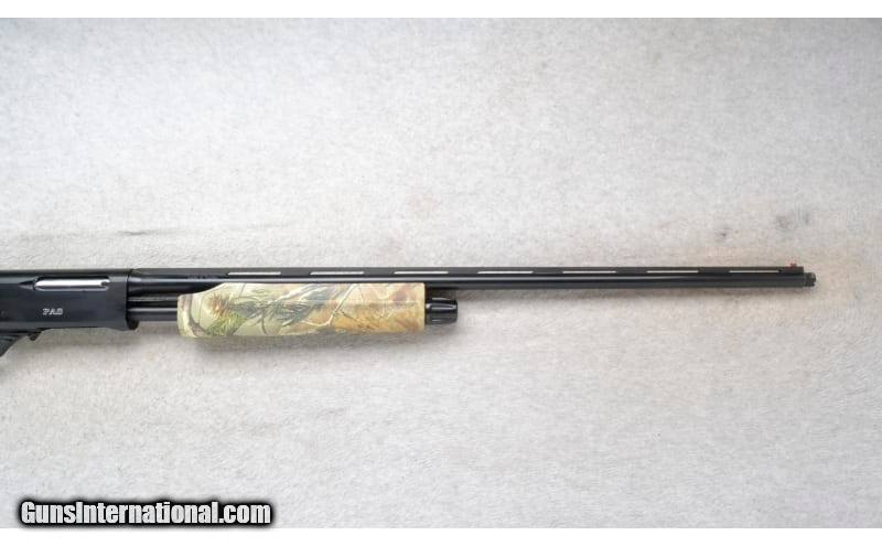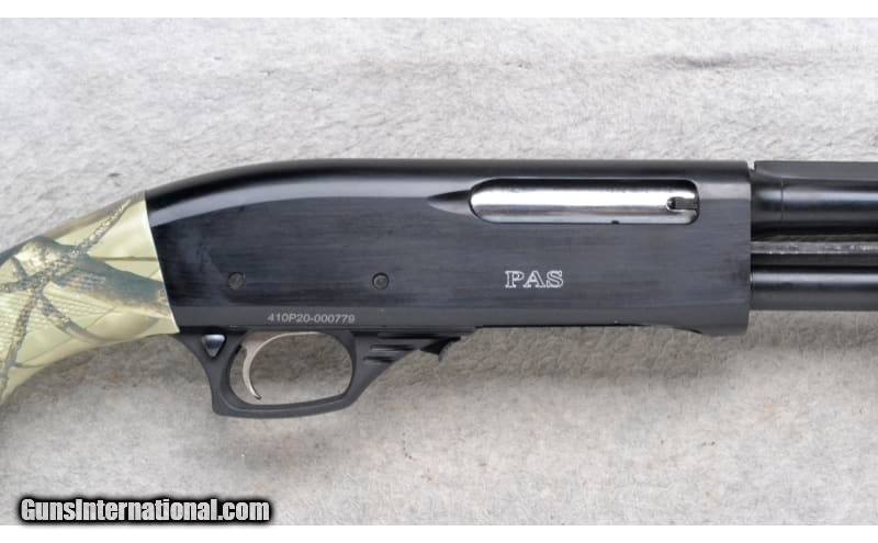 Description: This ArmsCo Model PAS is a right hand pump action shotgun in .410 Bore. It has a 26 inch barrel with a ventilated rib. A red high visibility front sight. The butt stock is a checkered grip polymer pistol grip. The forearm is a checkered grip polymer with finger grooves. Comes in woods camo. .410 Bore SOLD Chambers: 3 inch. Metal Condition: Very Good. Bore Condition: Shiny. Barrels: 26 inch barrel with a ventilated rib. Stock Dimensions: LOP 13 7/8 inches. Fore End: Checkered grip polymer with finger grooves. Butt Pad: Black rubber pad. Weight: 5 lb. 14 oz. Sights: Red high visibility front. Chokes: Comes with a XF choke tube in the gun. Item Location: Richfield, WI |