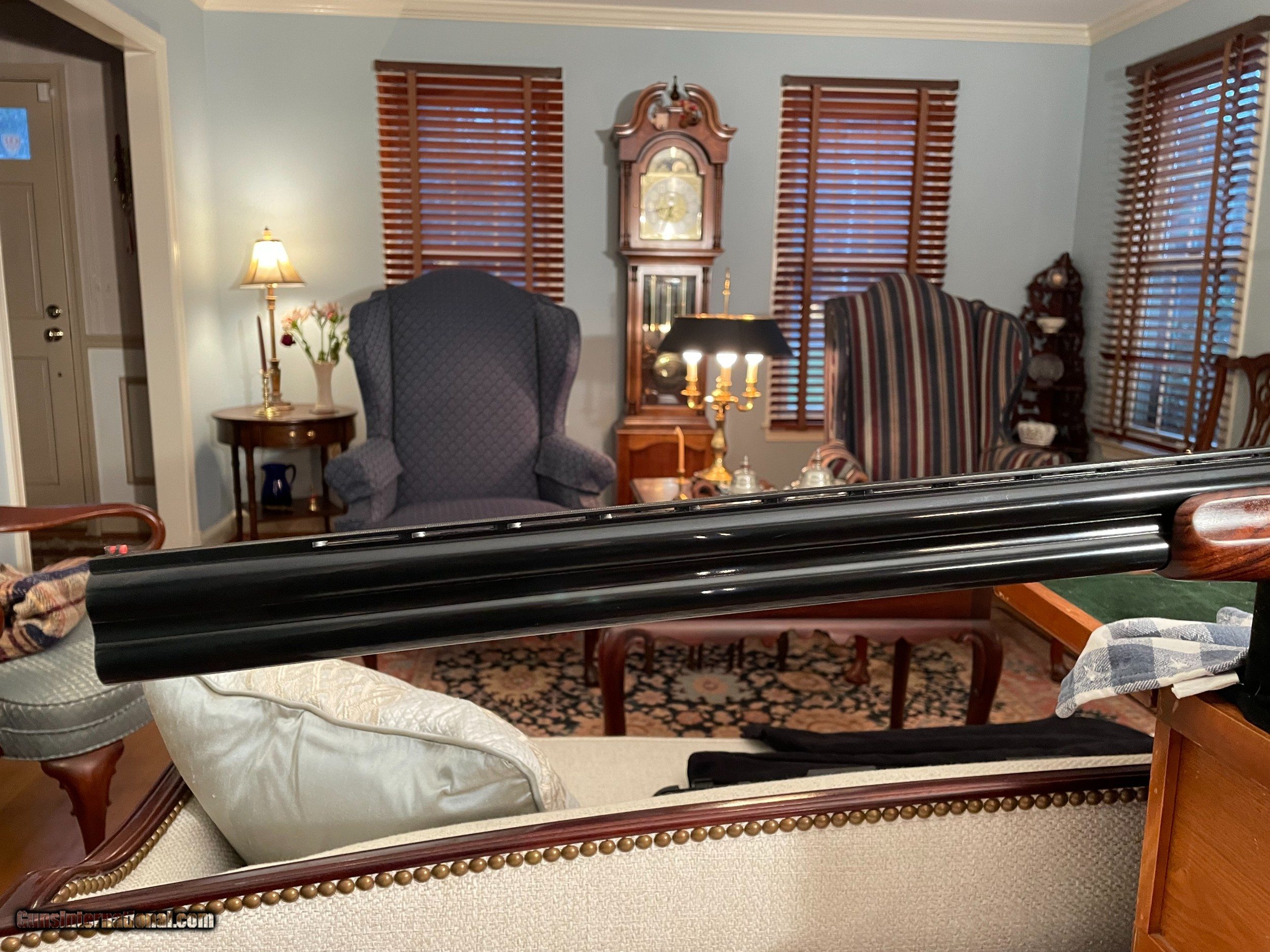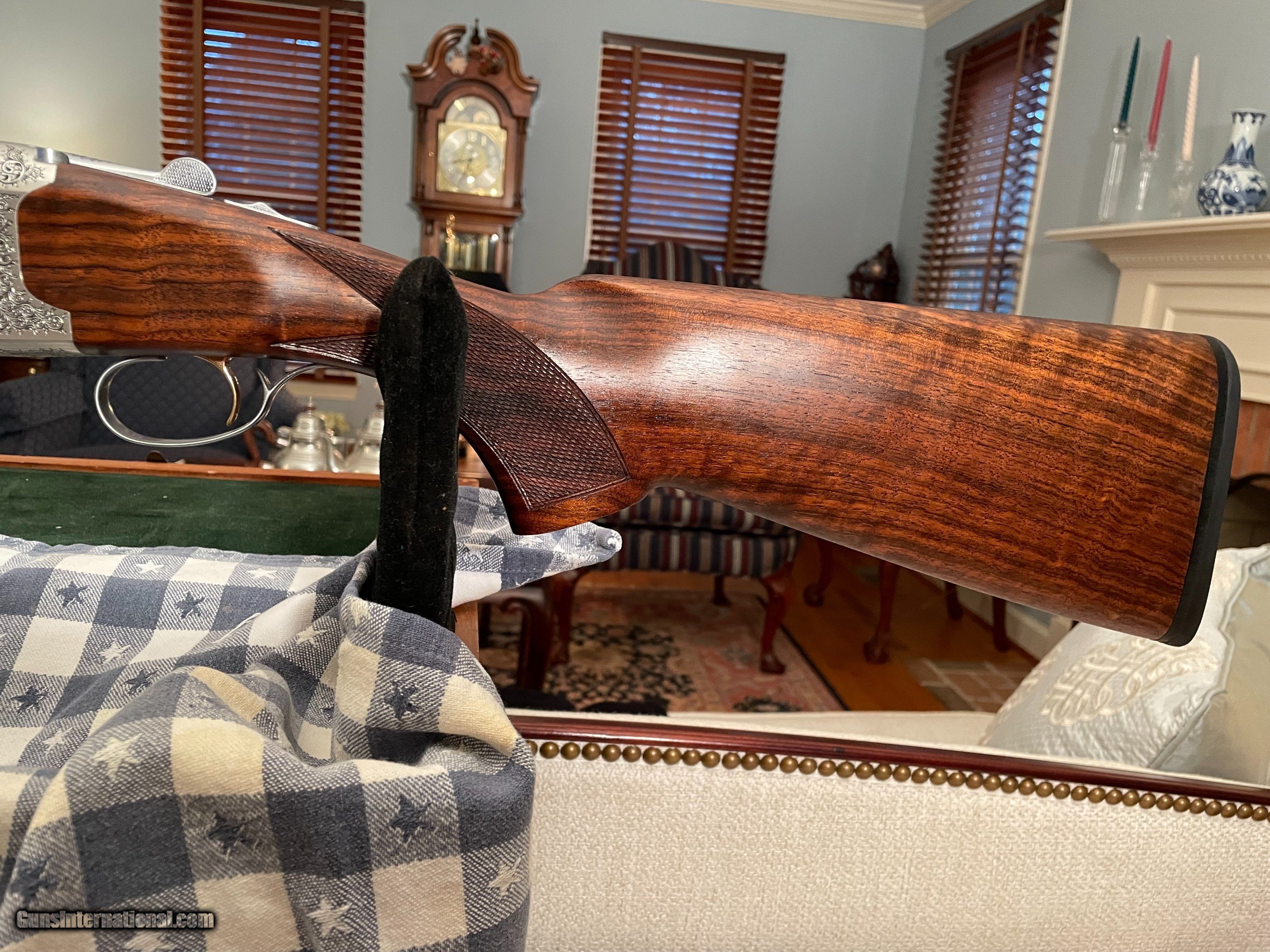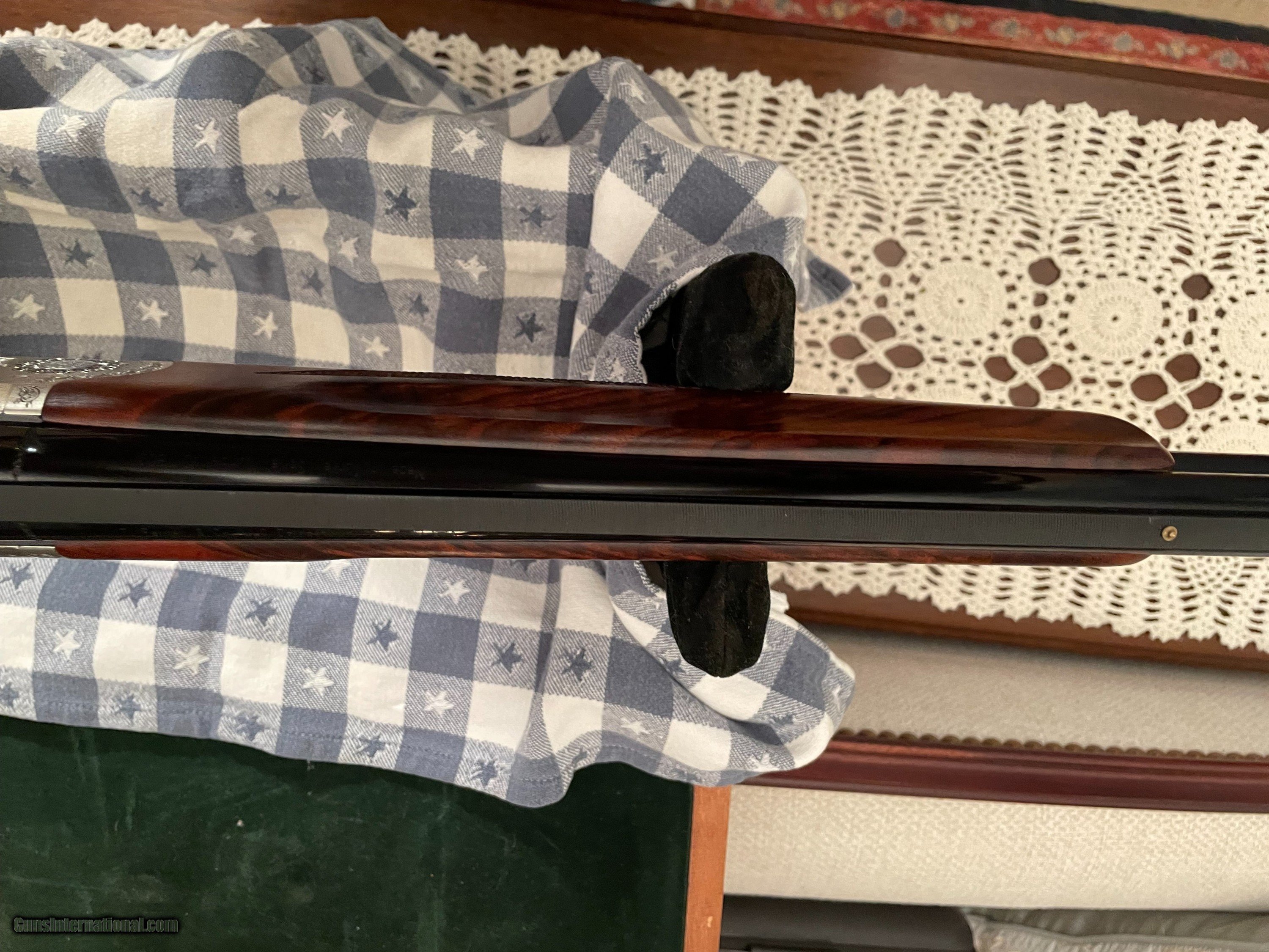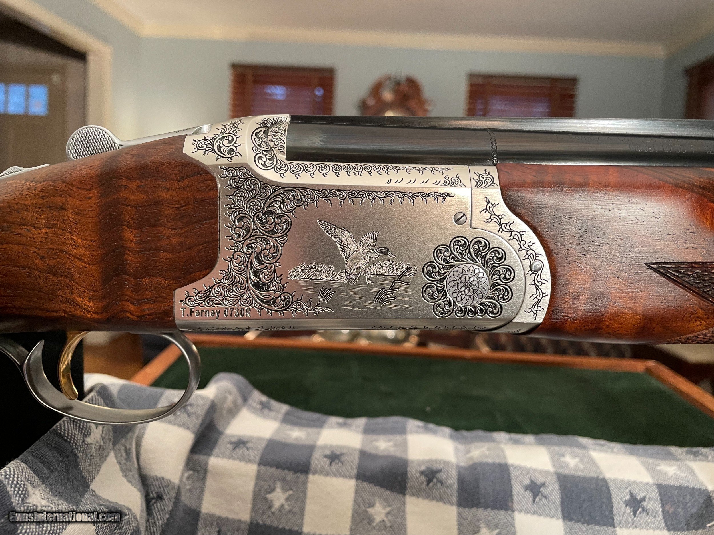 Description: “As New”. 100% metal and wood – not a mark on it. 30” Chrome lined barrels w/3” chambers and 7mm vent rib and selective ejectors, fiberoptic front and brass mid rib beads. SST inertia trigger. Non-auto safety. A total of 10 Briley Choke Tubes w/wrench (5 flush mounted - F-IM-M-IC-Cyl, 5 extended vented F-IM-M-IC-Cyl ). Game scene engraved alloy receiver. Attractive figured oil finish and checkered Turkish walnut wood (drop at comb 1 5/8”, at heel 2 5/8”). Weight 6 lbs, 13 oz. Made in Turkey w/some parts from Spain and other European suppliers. Molded Thomas Ferney Factory case, includes receiver and barrel socks. SOLD Shotgun Gauge: 12 Gauge |