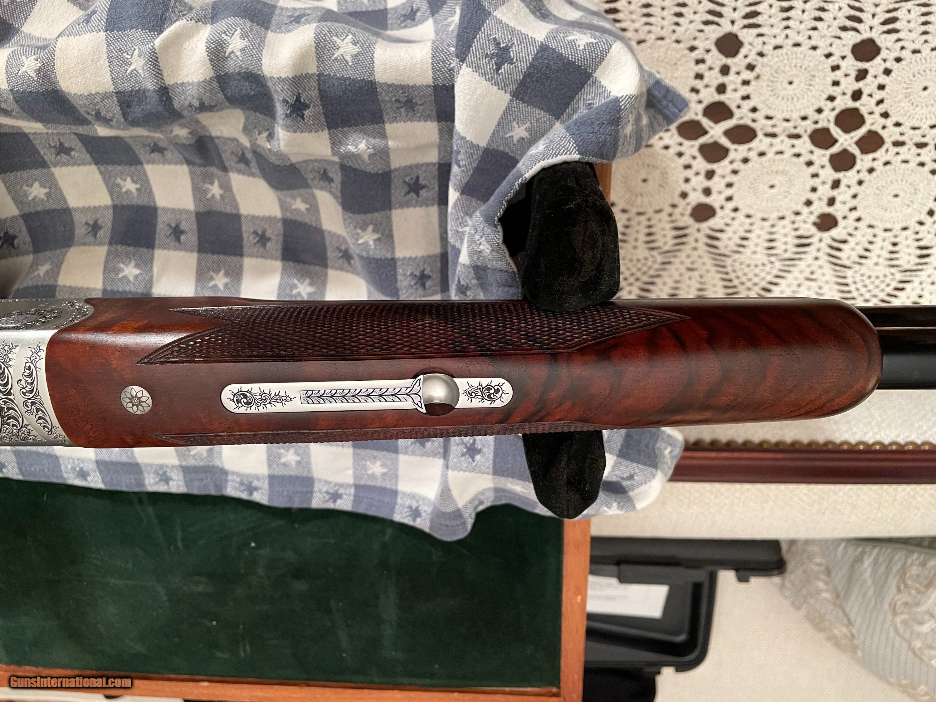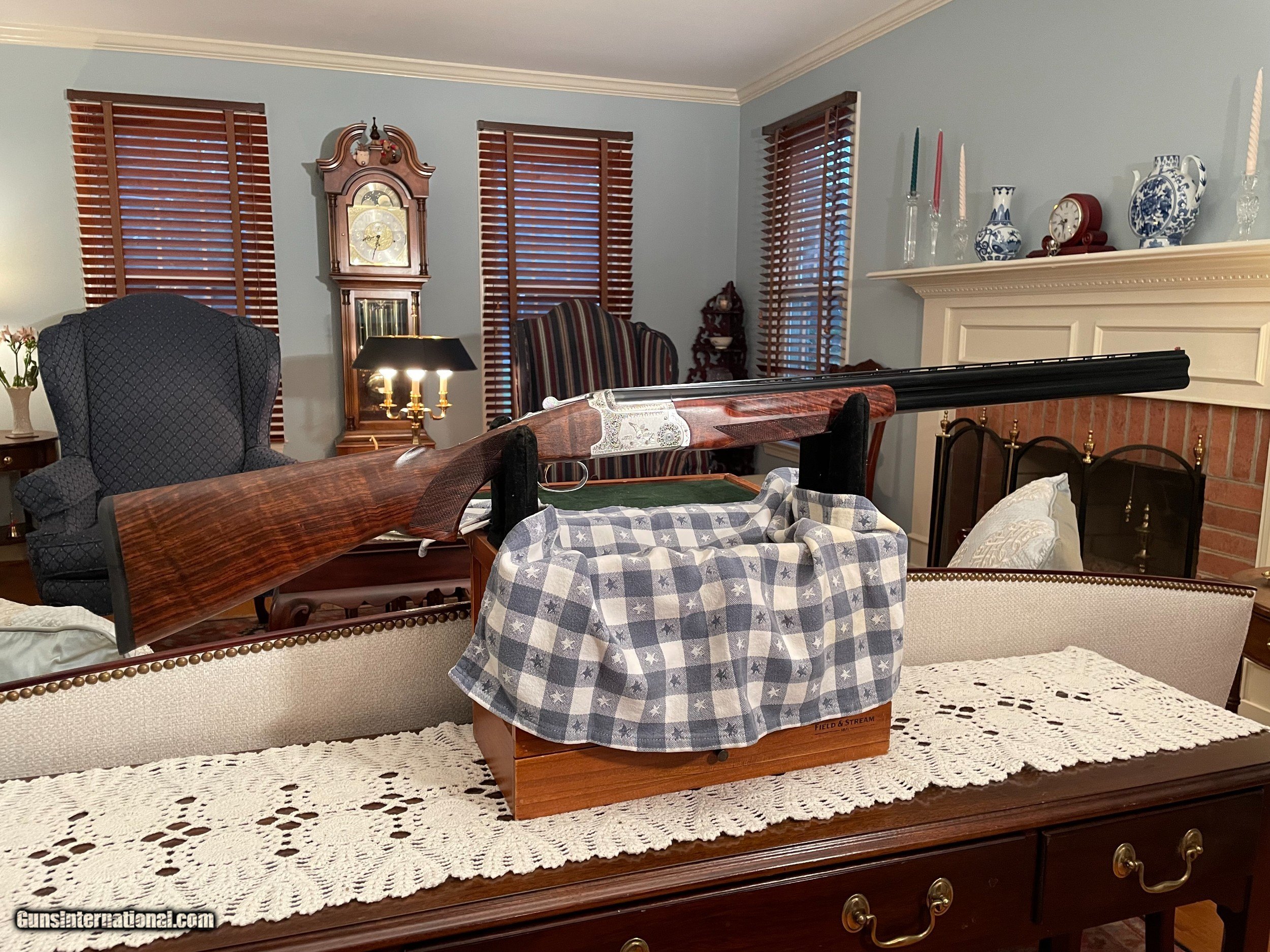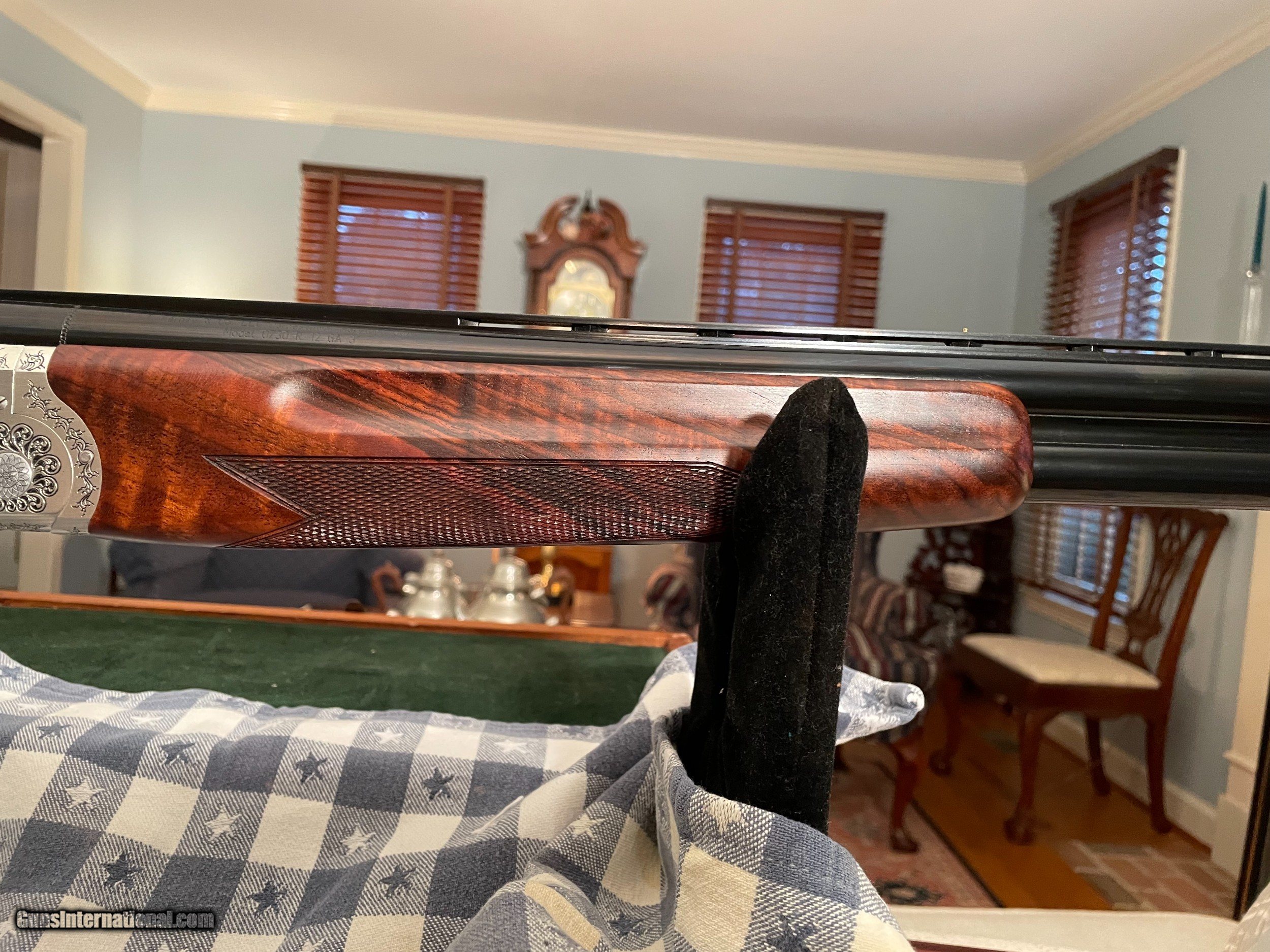 Description: “As New”. 100% metal and wood – not a mark on it. 30” Chrome lined barrels w/3” chambers and 7mm vent rib and selective ejectors, fiberoptic front and brass mid rib beads. SST inertia trigger. Non-auto safety. A total of 10 Briley Choke Tubes w/wrench (5 flush mounted - F-IM-M-IC-Cyl, 5 extended vented F-IM-M-IC-Cyl ). Game scene engraved alloy receiver. Attractive figured oil finish and checkered Turkish walnut wood (drop at comb 1 5/8”, at heel 2 5/8”). Weight 6 lbs, 13 oz. Made in Turkey w/some parts from Spain and other European suppliers. Molded Thomas Ferney Factory case, includes receiver and barrel socks. SOLD Shotgun Gauge: 12 Gauge |