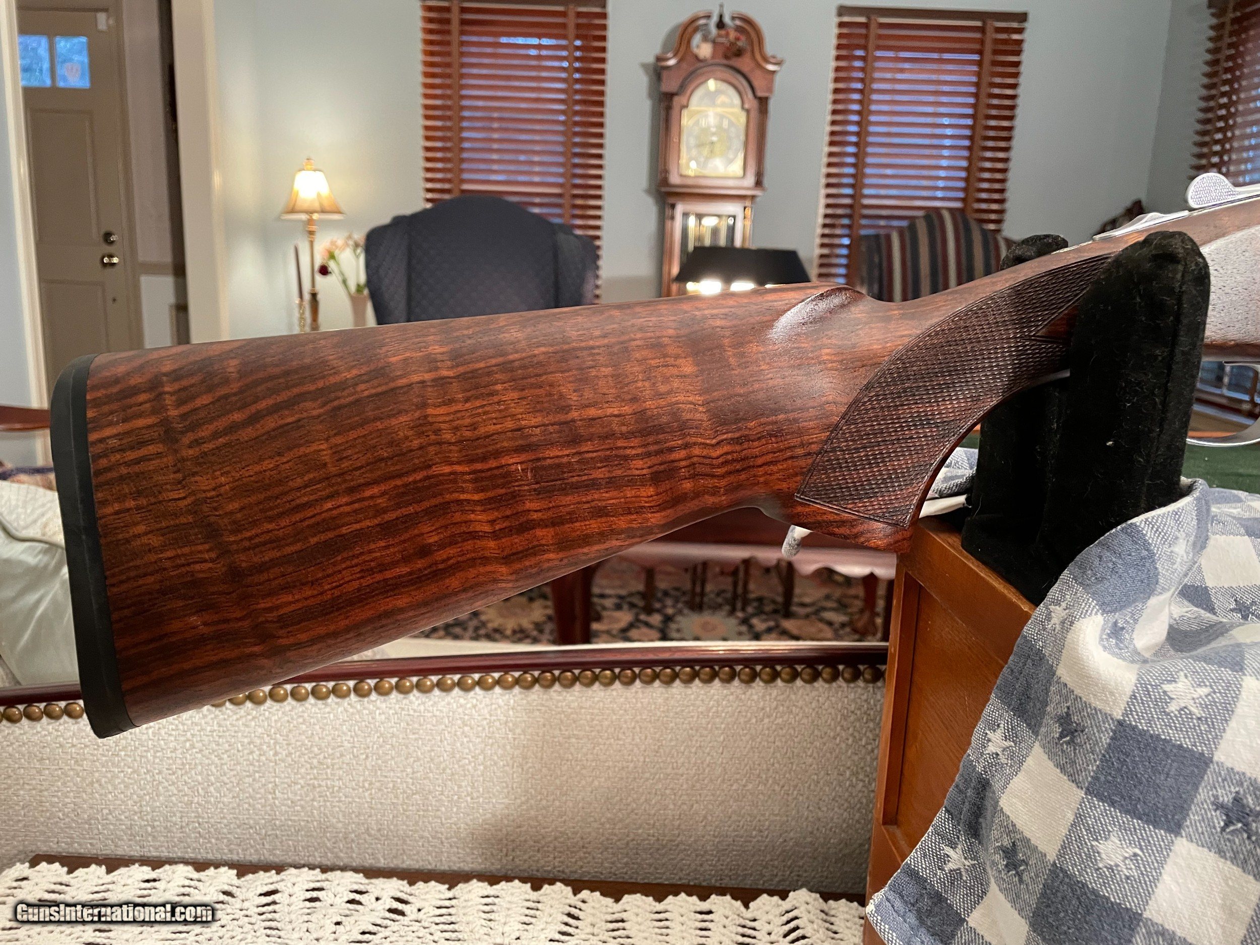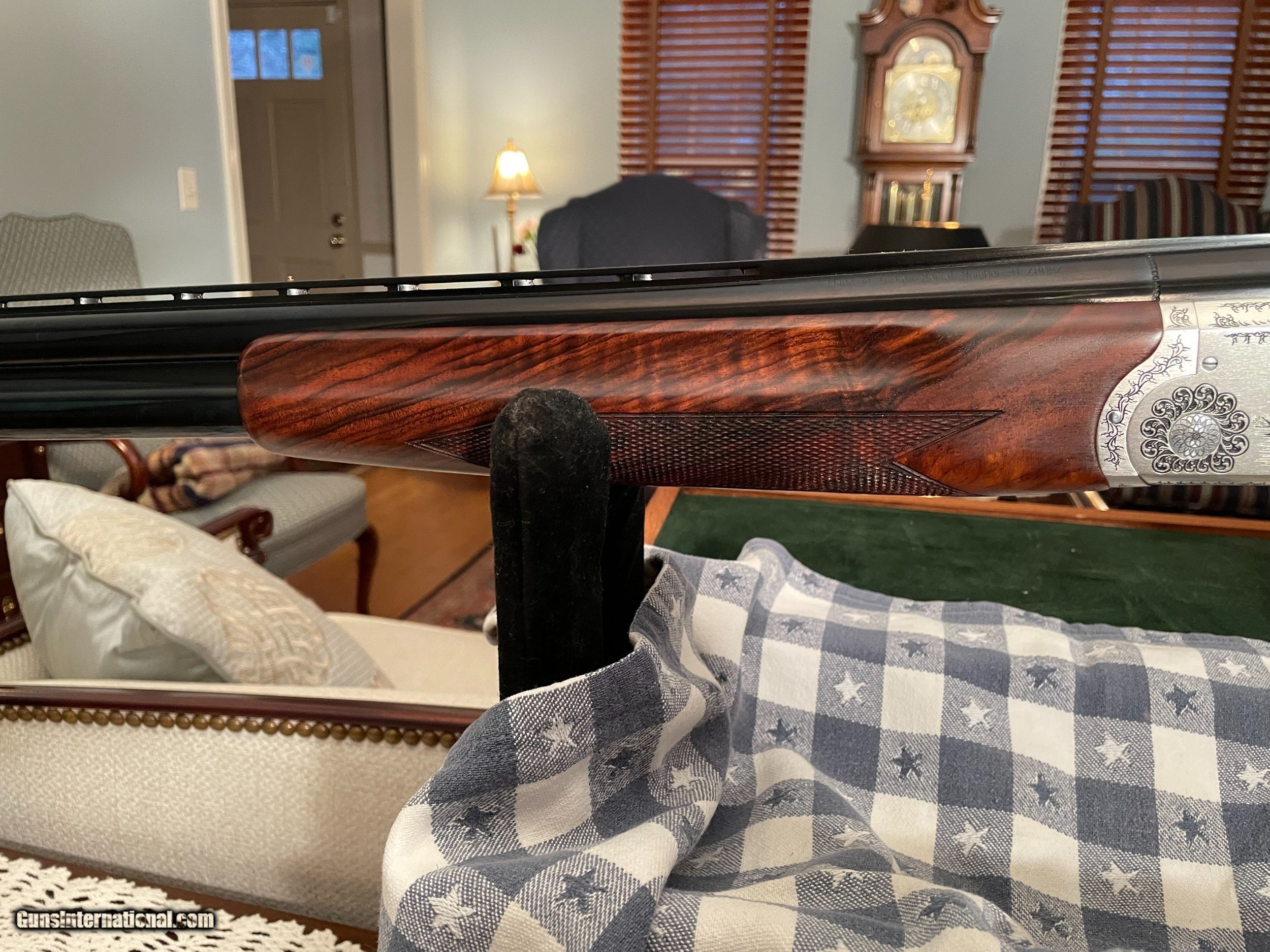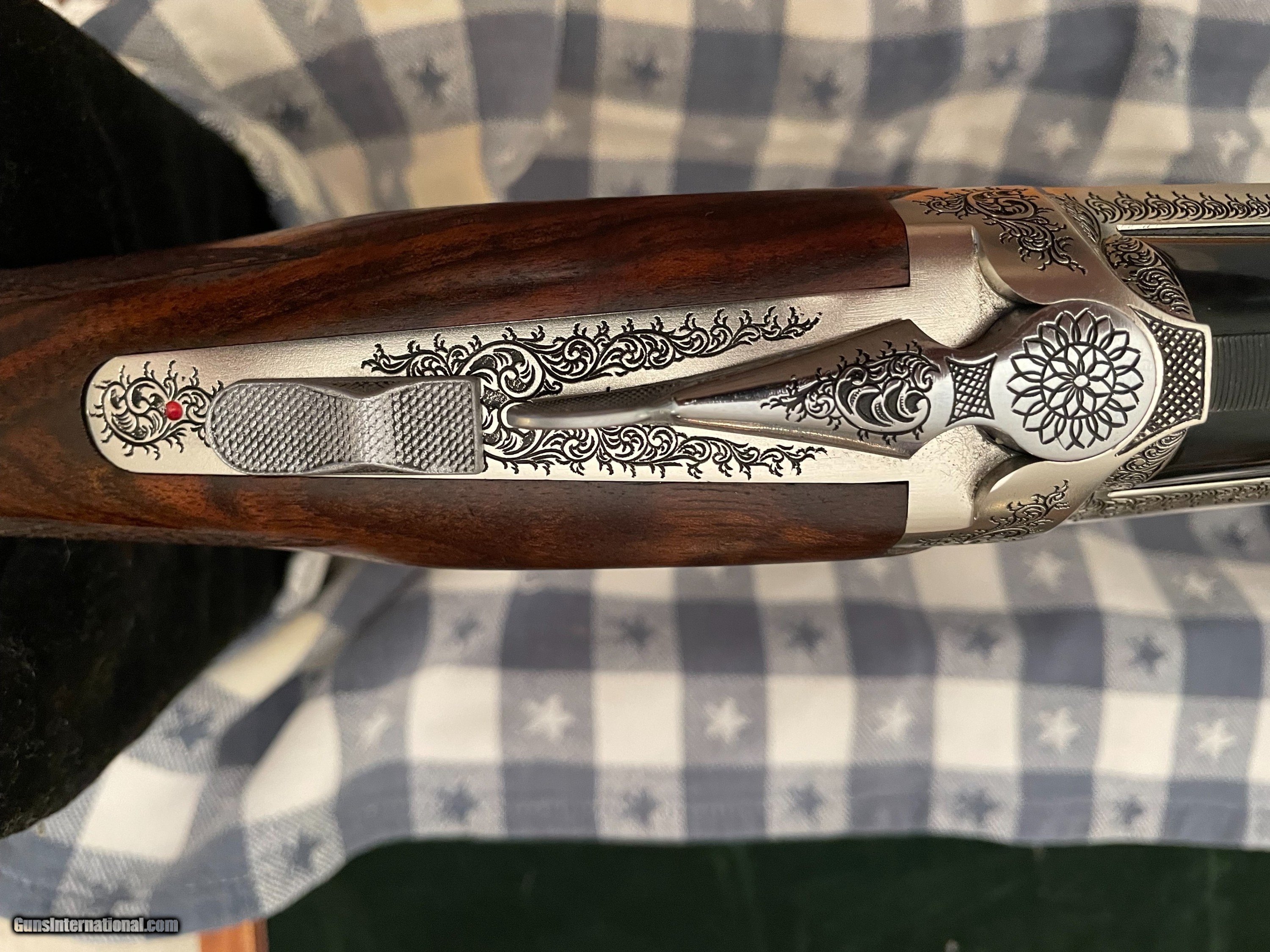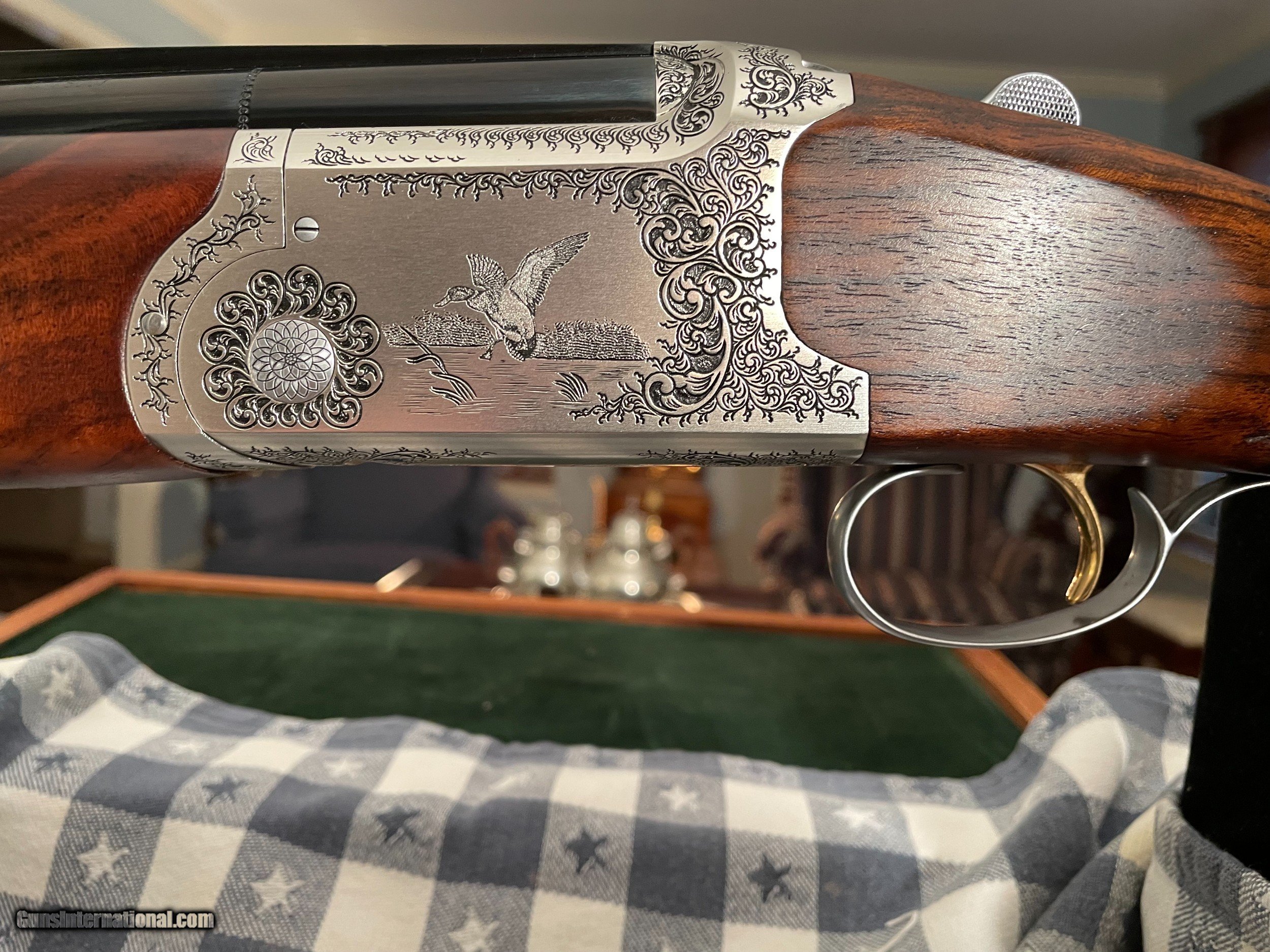 Description: “As New”. 100% metal and wood – not a mark on it. 30” Chrome lined barrels w/3” chambers and 7mm vent rib and selective ejectors, fiberoptic front and brass mid rib beads. SST inertia trigger. Non-auto safety. A total of 10 Briley Choke Tubes w/wrench (5 flush mounted - F-IM-M-IC-Cyl, 5 extended vented F-IM-M-IC-Cyl ). Game scene engraved alloy receiver. Attractive figured oil finish and checkered Turkish walnut wood (drop at comb 1 5/8”, at heel 2 5/8”). Weight 6 lbs, 13 oz. Made in Turkey w/some parts from Spain and other European suppliers. Molded Thomas Ferney Factory case, includes receiver and barrel socks. SOLD Shotgun Gauge: 12 Gauge |
