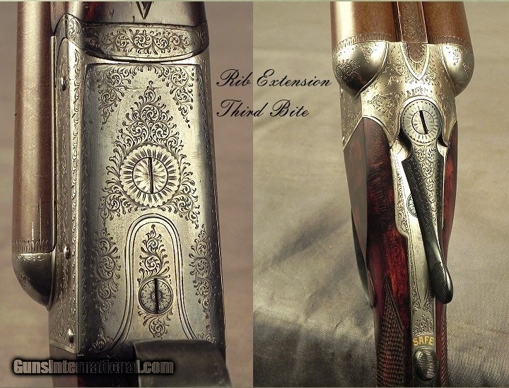 Description: #10911, G. E. (George Edward) Lewis, A 20 Bore Made in 1903 with Nitro Proved Damascus Barrels, The Barrels were Original Nitro Proof in 1903 and then Modern Nitro Proved in London in 2001 to 2 3/4" at 950 BAR, 28" Ejector Damascus Barrels at .673 .018 & .027" (Imp.Mod. & Full), 2 3/4" chambers, Wall Thickness on the Right barrel at .026" and the Left barrel at .030", The 28" barrels have Ejectors with a rib extension plus a third bite (Treble Grip), They are Dovetail Lump Barrels, The versatile Anson & Deeley action, Double triggers, Splinter forend with a Deeley & Edge bottom forend, Straight hand stock at 15 1/4 x 1 5/8 x 2 5/16" over a 1" leather pad with plugs for removal, Cast-Off for the right hand, Excellent Game Gun weight of 5 lbs. 14 oz., Very nice piece of wood, 55% engraving coverage, This piece was completely redone in London, most likely by Ron Solari and then imported to the U. S. by Cyril Adams in Houston. They worked closely together and Cyril brought a lot of English guns to our shores, No case colors remain, Barrel brown at 100%, The wood remains at 98-99%, The checkering is at 100%, The bores have been opened and now remain in absolute excellent condition, The barrels outside are excellent plus, It is tight on the face with excellent bite left. The whole is cased in a leather cornered Canvas trunk with cleaning gear and a trade label. This is an honest and nice handling early Pre-War British boxlock that now is in excellent condition. This piece has a lot of life left in it. The rib is engraved " The Gun Of The Period G. E. Lewis 32 & 33 Lower Loveday St. Birmingham". G. E. Lewis was started in 1850 and was still operating as the G. E. Lewis firm until April of 1996. They had a trademark gun called the "Gun of the Period". Mr. Lewis had 2 sons that later ran the business. They in turn had sons and another George Lewis was appointed a Guardian of the Birmingham Proof House in 1951. In 1988 John Harris, an expert stocker, acquired the business and in 2003 Holts sold the business as a going concern. The firm was again sold at in 2009. From about 1880 to 1914 Lewis made guns were imported into the United States by Von Lengerke & Detmold of New York City. Curio/Relic: Yes Antique: Yes Shotgun Gauge: 20 Gauge Price: $3,950.00 Contact Seller |