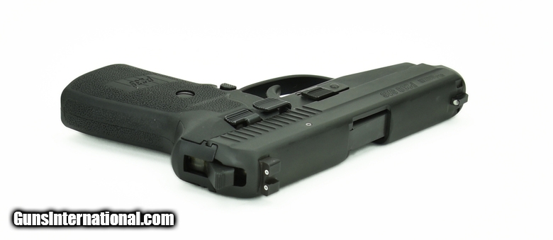 Sig Sauer P239 SAS 9mm caliber pistol. This is a compact model with rounded edges and night sights. It is in excellent condition.