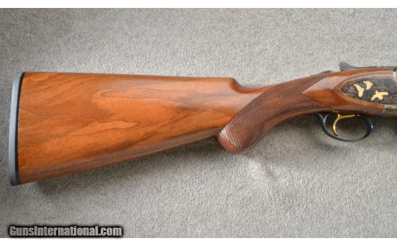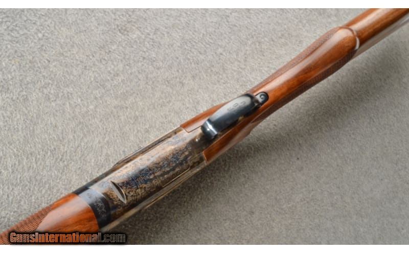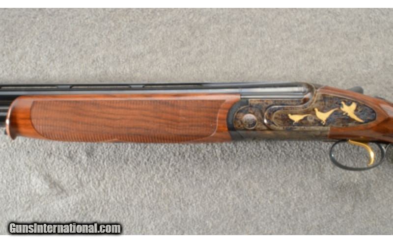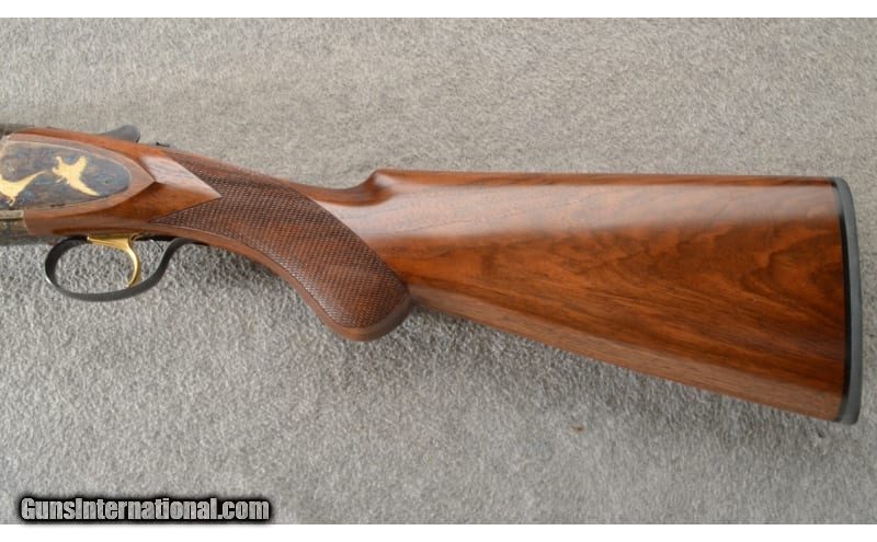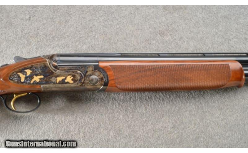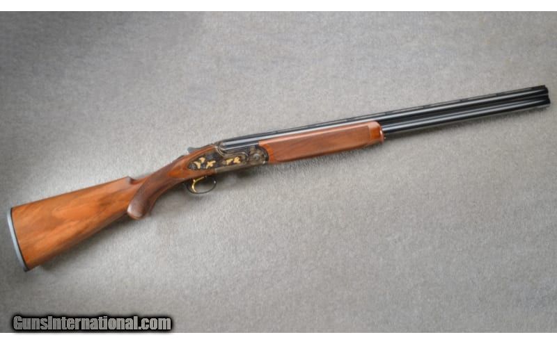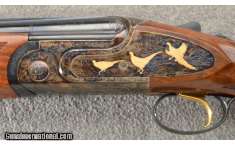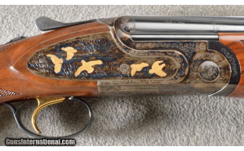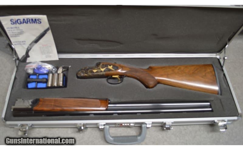 Description: SIG ARMS Aurora TR40 chambered in 12 Gauge Features 26.5" vent rib barrels with screw in chokes, S/N EX04138. Blue/case colored finish with gold pheasants on left receiver flat and gold grouse on right receiver flat, engraving on this gun is signed by Bottega C. Giovanelli, walnut checkered stocks, single selective trigger, manual tang safety and barrel selector. Comes with factory Sig aluminum carrying case, safety lock, case lock, choke wrench, chokes "F, IC, M, IM, CL", original manual. This gun remains in 99% condition. 12 Gauge SOLD Chambers: 3" chamber. Metal Condition: 99%. Wood Condition: 99%. Bore Condition: Bright smooth bores. Barrels: 26.5" barrels. Triggers: Single trigger. Stock Dimensions: LOP 14 5/8". Fore End: Schnabel. Butt Pad: Rubber. Weight: 7 lbs Sights: Bead. Chokes: Removable. Item Location: Owatonna, MN |