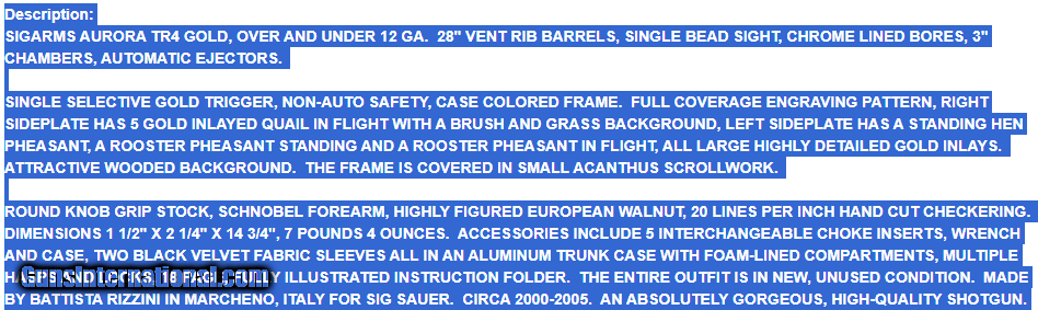 Description: Up for your consideration is a Sig Arms 12GA Shotgun made in the famous Rizzini factory in Italy. This one doesn't appear to have had 2 boxes of shells go through it. Please see the high quality photos to determine condition for yourself. Please ask any questions before purchasing. Let me know if you require additional photos. See Additional Info On THe Last Photo. I will consider trades on high end rimfires (Cooper, Kimber or Anschutz). Sold only where legal to own and you are expected to know your local laws. Price listed represents a 3 1/2% discount for cash. Credit cards are available, but you must call me to use. Shipping will be $65 to the lower 47 (no shipping to CA). Insurance is not included but is highly recommended. The gun is available for sale locally and if there are no offers, I reserve the right to end the sale early. Thanks for looking. Shotgun Gauge: 12 Gauge Manufacturer: Rizinni Model: TR40 Barrel Length: 28 Bore Info: Excellent Ejectors: Yes Condition: Excellent Metal Condition: Excellent Wood Condition: Excellent Bore Condition: Excellent Barrels: Blued Barrel Type: O/U Action: O/U Triggers: Single Selective Stock: Walnut Price: $3,850.00 Contact Seller |