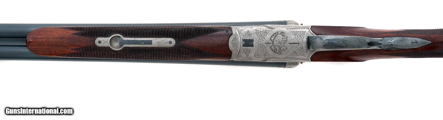 Description: Simpson - BLE - 16 ga - Item Number: SIM170005 Shotgun type: SxS Action: Boxlock Ejectors: Yes Trigger: Double Grip: Pistol Grip Forend: Checkered Lop: 14 3/8 " Pad thickness: " Type of butt: Factory Drop comb: 1 1/2 " Drop heel: 2 3/8 " Cast amount: 1/8 " Cast: Off Weight: 6 lbs, 8 oz Manufactured in: Germany Manufacture Year: Finish: Coin Overall condition: Very Good Stock condition: Very Good Metal condition: Very Good Stock: Original finish Metal: Original finish Type of Case: none Extra barrels: 0 Barrel info: Gauge: 12 ga Chamber: 2 3/4 " Length: 28 " Chokes: F/IM Rib type: Concave File Cut Comments : Gun is in overall good condition, stock has a crack at the ear on left side. SG-26 SOLD |