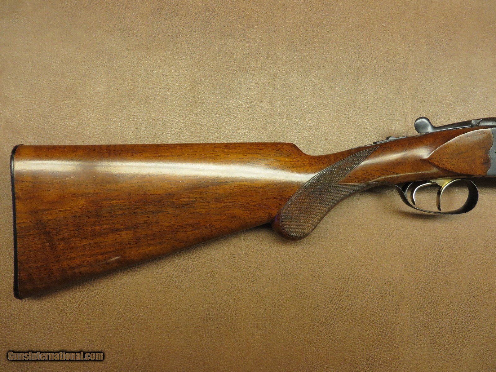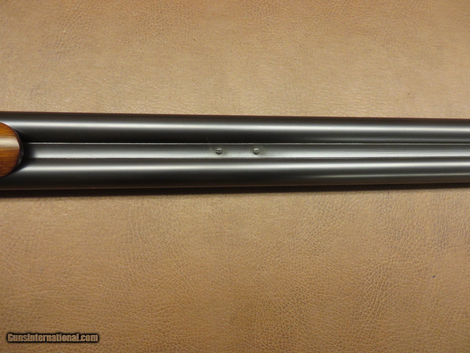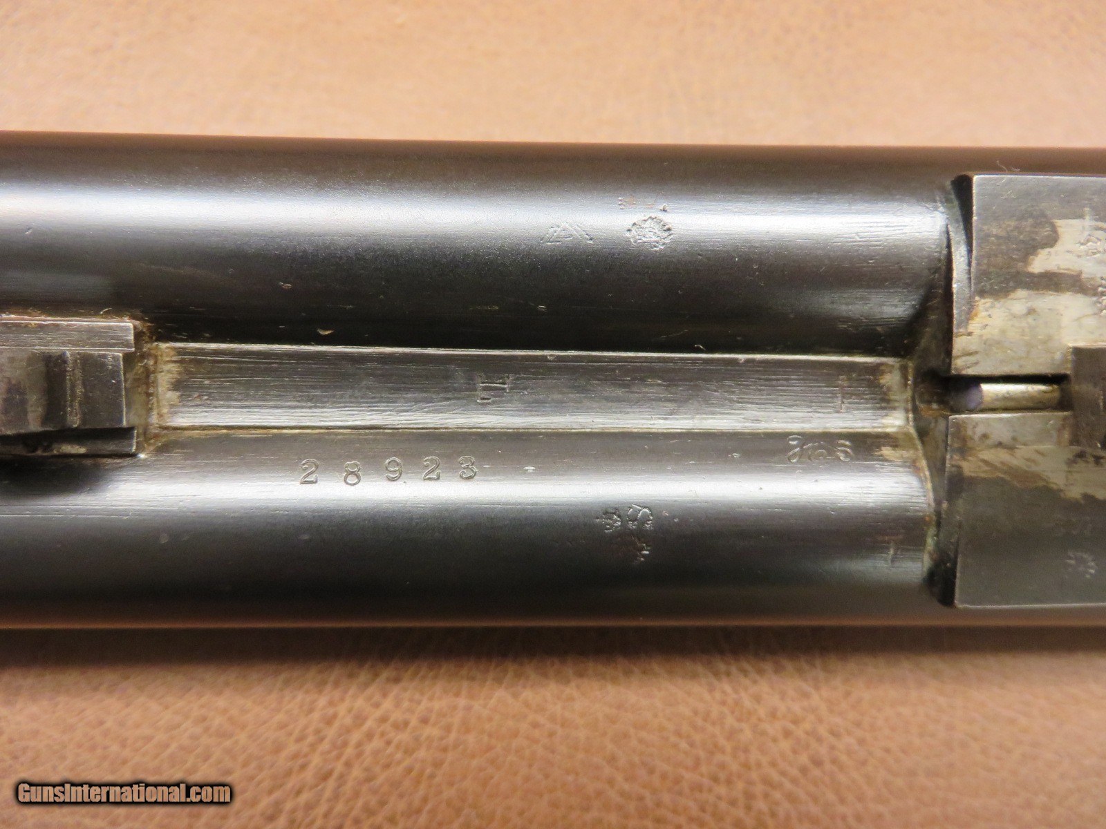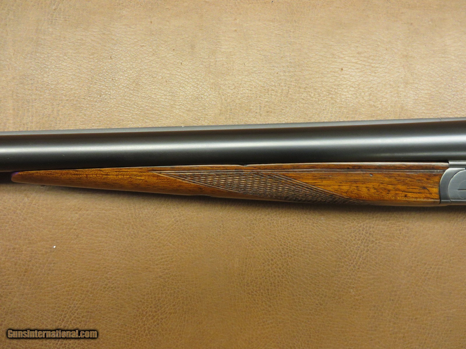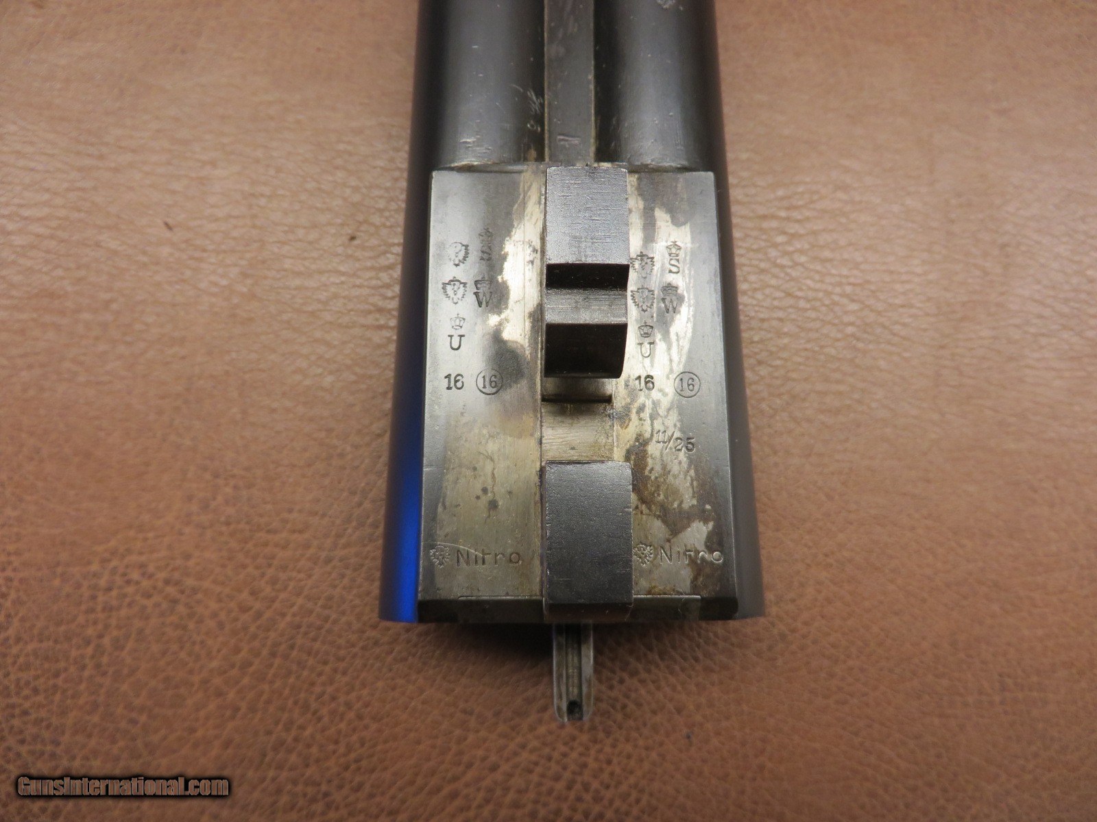 Description: 16 ga. side by side 2 9/16 inch chambers in 28 1/4 inch Krupp Steel barrels choked full and modified. Extractor and double triggers. Checkered walnut splinter forend and round knob stock with butt plate. 14 inch length of pull to front trigger. Sling swivels removed and holes filled. Complete professional refinish. SOLD Shotgun Gauge: 16 Gauge |