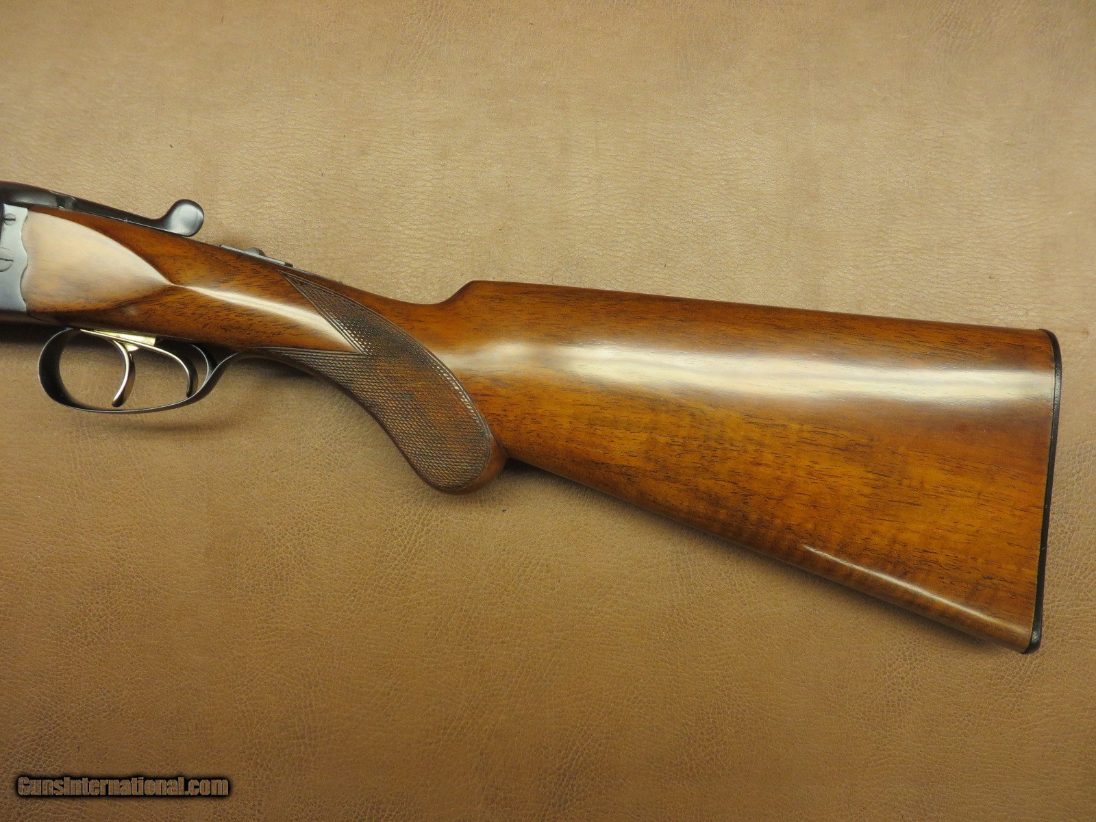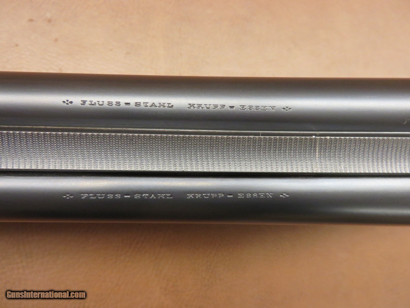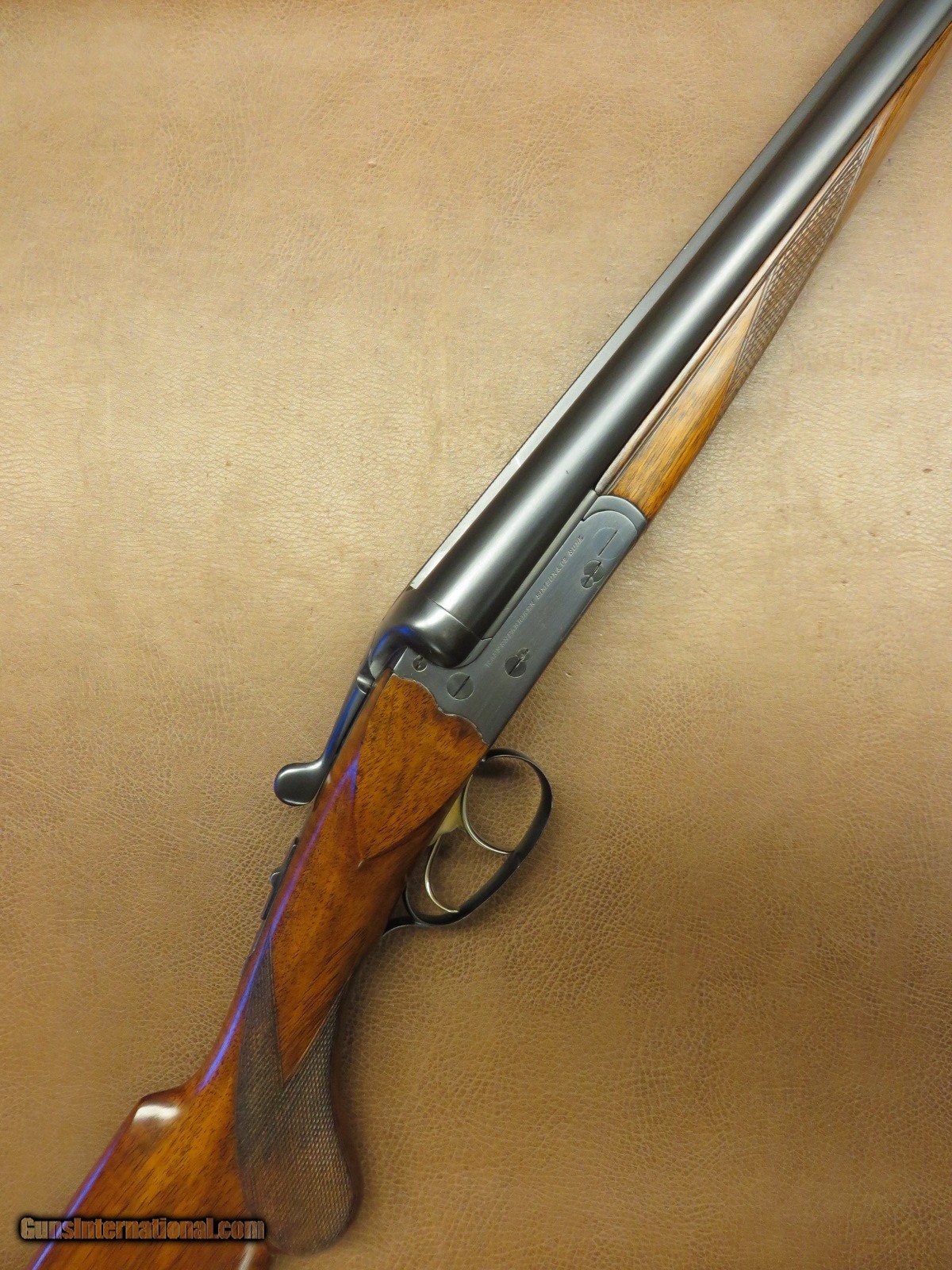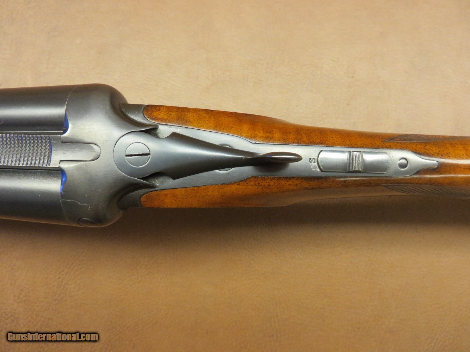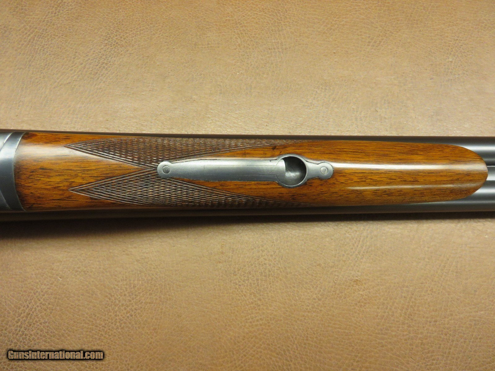 Description: 16 ga. side by side 2 9/16 inch chambers in 28 1/4 inch Krupp Steel barrels choked full and modified. Extractor and double triggers. Checkered walnut splinter forend and round knob stock with butt plate. 14 inch length of pull to front trigger. Sling swivels removed and holes filled. Complete professional refinish. SOLD Shotgun Gauge: 16 Gauge |