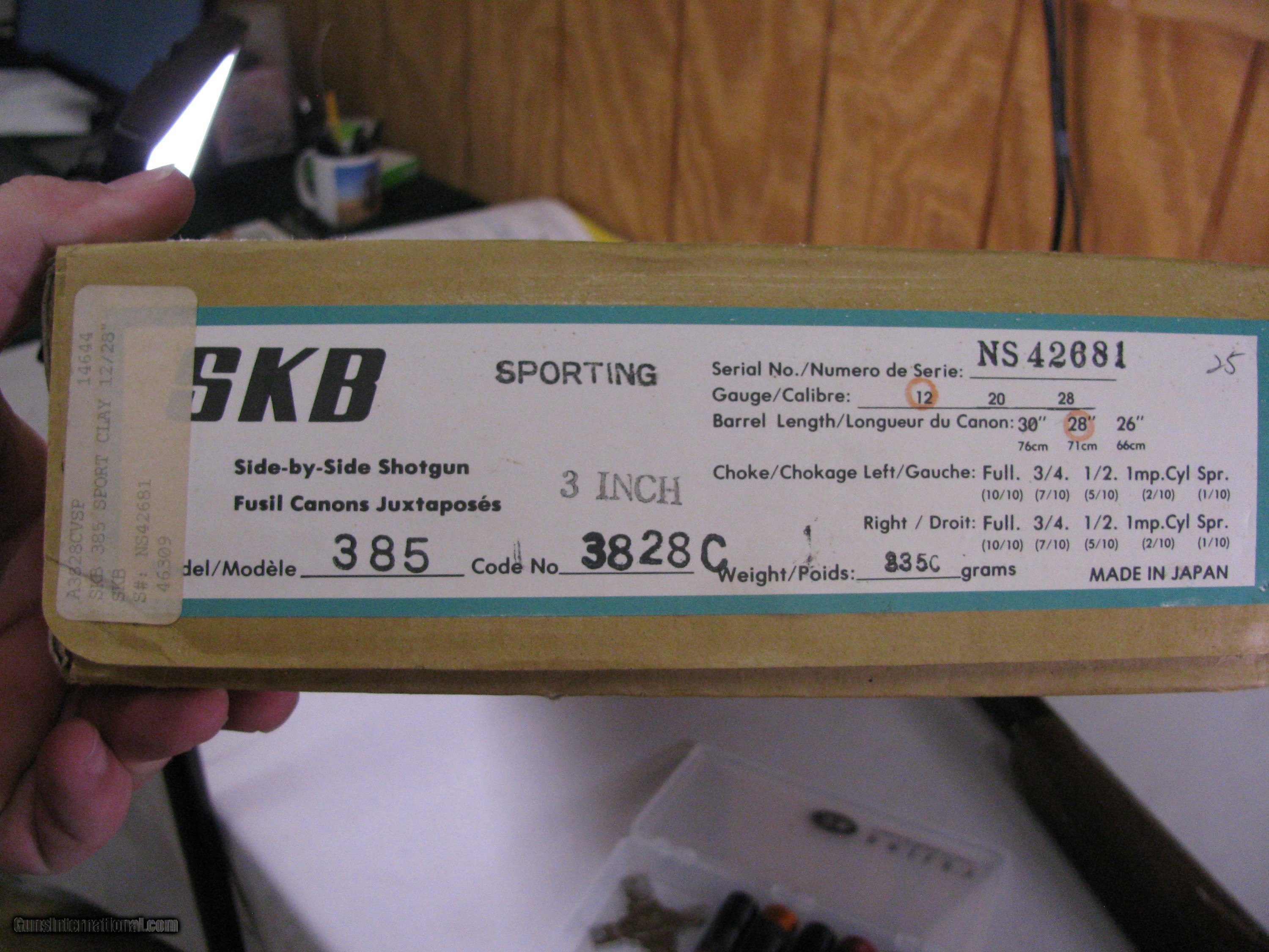 Description: 8009 SKB 385 Sporting 12 GA, 3”, 28” Barrels, 14 ¼ LOP, Vent rib, Pistol Grip, Silver receiver, Butt Pad, It comes with 2 SK, 2 IC extended chokes, also has 2 SK and 2 IC Flush chokes in a case with choke tool. Has the original box as well! SOLD Shotgun Gauge: 12 Gauge |