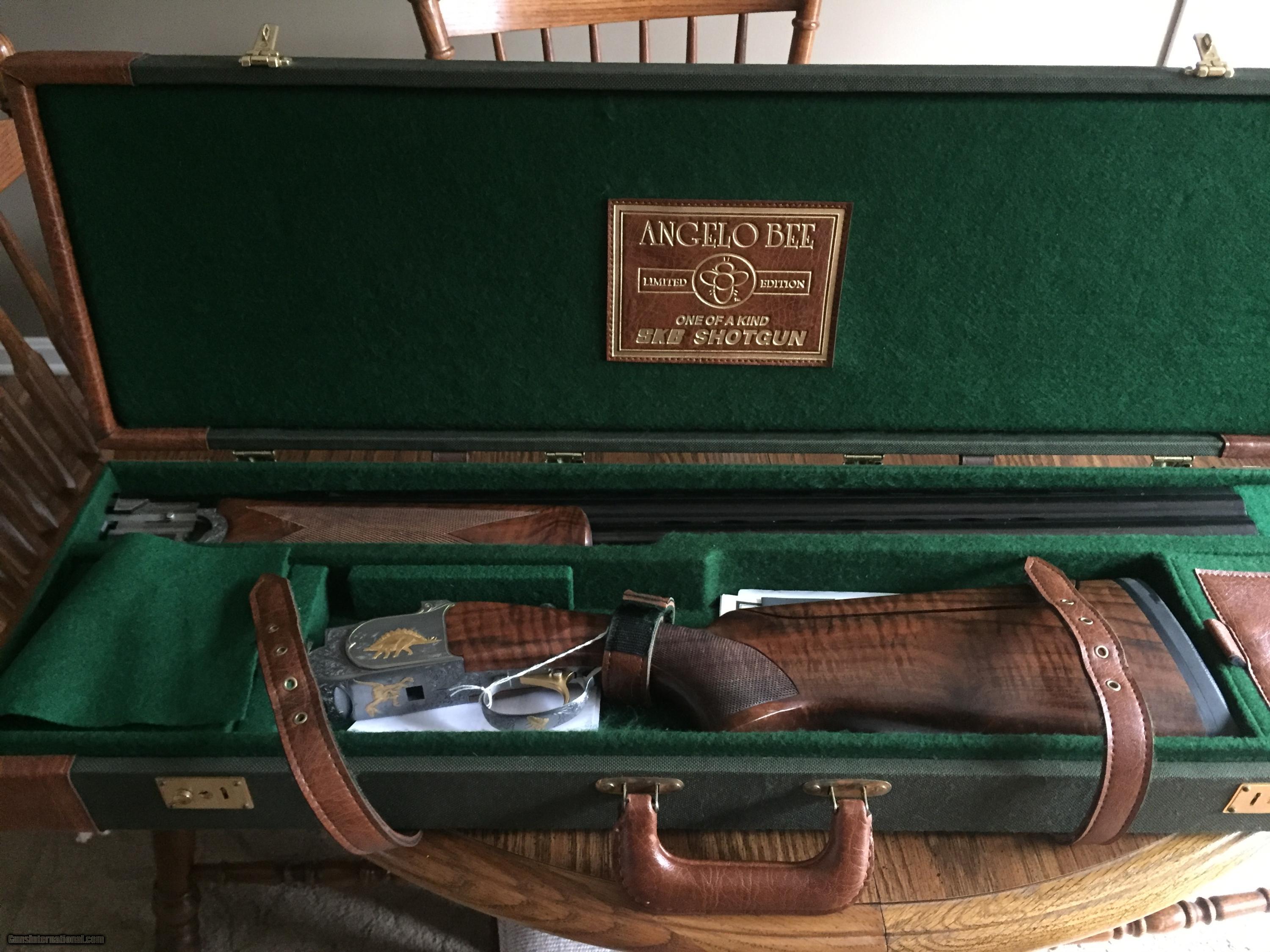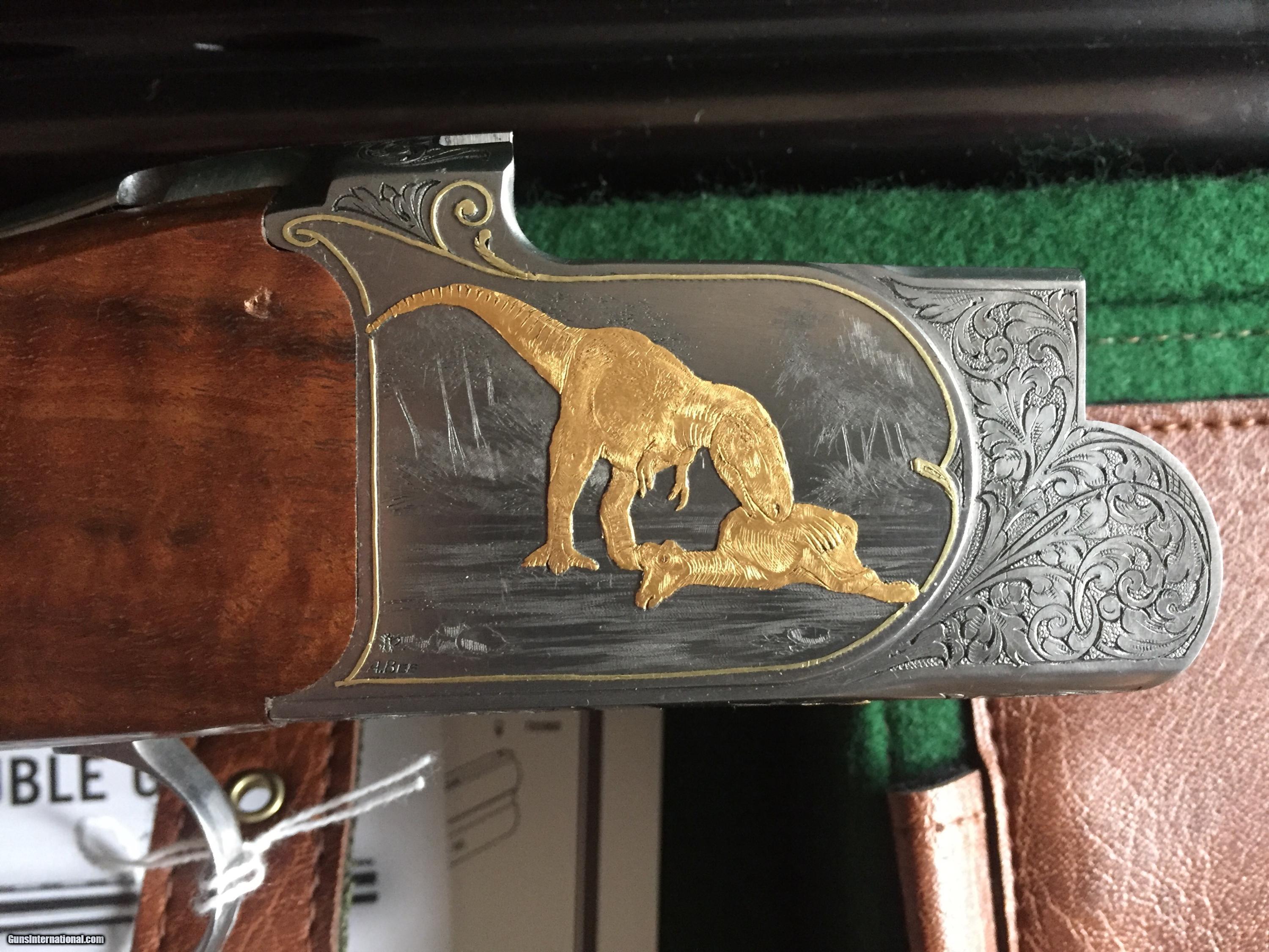 Description: This is 1 of a kind custom, SKB model 785 30 inch Sporting Clay shotgun, engraved by Anglo Bee, with a custom case. This shotgun is a one of a kind. Comes with extra choke tubes. And papers. Metal is 99%. Wood is 97%+. It has two very small marks in the wood. As you can see in the pictures, it has four solid gold inlays on the gun on four different dinosaurs. These are NOT gold filled inlays but the real gold wire filled inlays with gold wire boarders. It is quite a conversation piece that shoots like a dream. $5495.00 shipped to your FFL. (New it had a $7500 price tag) SOLD |