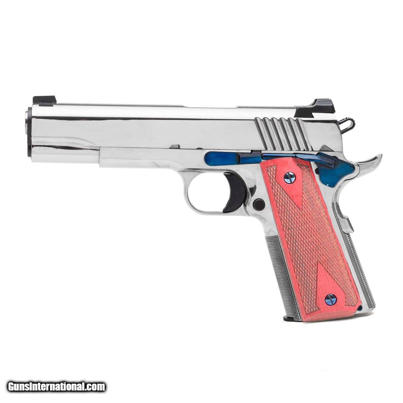 Description: Specifications and Features: 4140 Carbon steel fame and slide CNC machined from forgings 5 inch stainless steel match grade barrel with match bushing Lowered and flared ejection port and rear slide serrations High profile low-mount tactical sights Enhanced slide to frame fit High polished Nickel flats with bead blasted contours Upswept beavertail grip safety and extended magazine release Checkered front frame strap and flat mainspring housing Fully machined extended tactical thumb safety and slide stop Medium solid match grade trigger and enhanced machined hammer with 4.5 trigger pull SOLD |