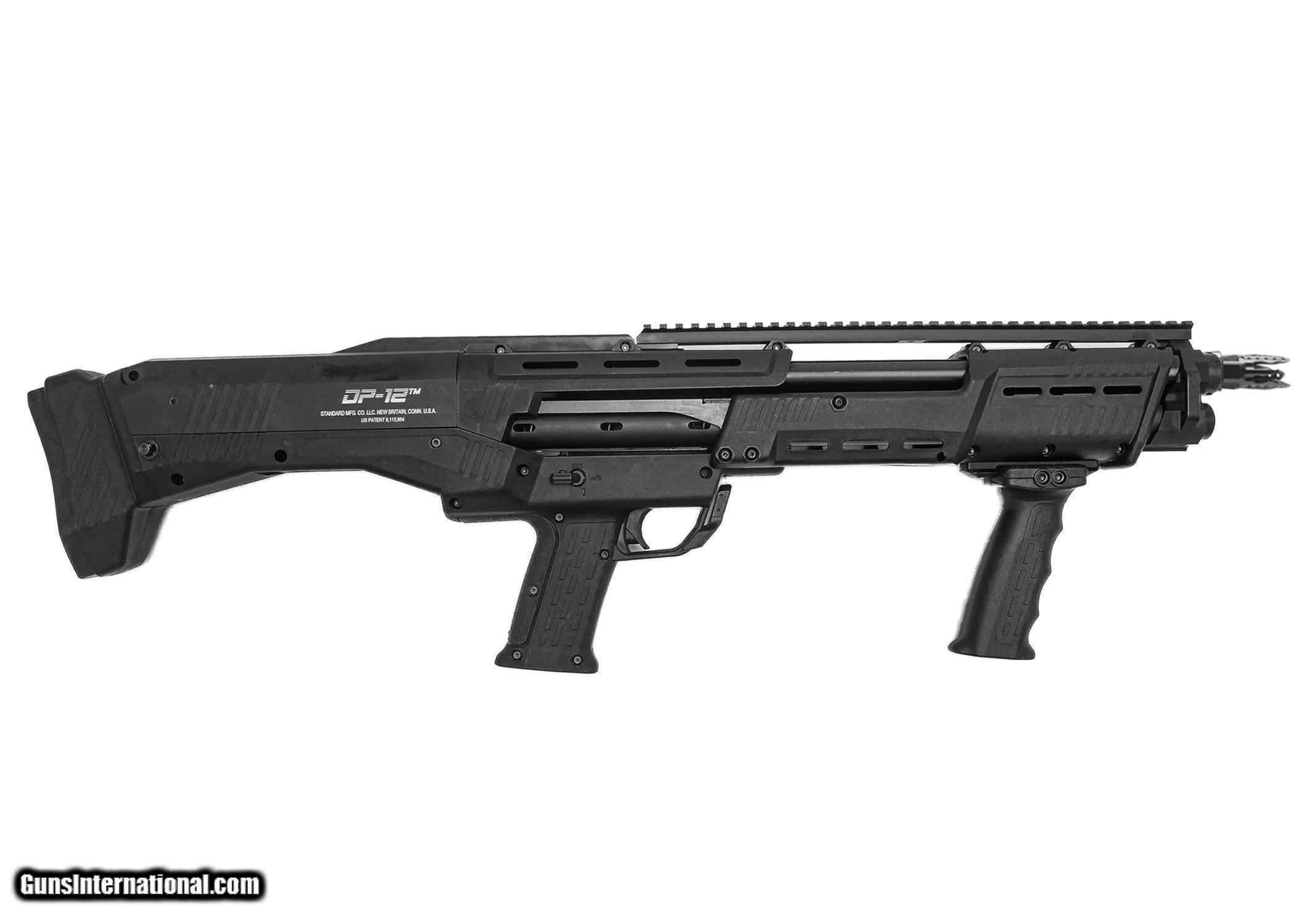 Description: ONE PUMP, TWO SHOTS: Standard Manufacturing Company has raised the bar with this extraordinary shotgun that truly is one of kind that was manufactured in a state of the art facility. The innovative design and guaranteed functionality is well ahead of its time. Extreme detail has been a priority from conception through production of these double barrel repeater shotguns. The first of its kind, a premium defense, double barreled, pump, 12 gauge shotgun that quickly fires 16 rounds. Designed for the most discerning shooters who demand extreme firepower and require consistent reliability. The stock has a QR code you can scan with your smart phone or tablet to down load the manual and other information. Please be sure and fill out the warranty card and send it to Standard Manufacturing. The spreader choke tubes are designed to shoot a devastating pattern at 25 yards. The choke tubes have Tru-Choke thread patterns. Some pictures show door breachers, these are sold separately. The DP-12 provides accessory rails and slots that allow you to customize it with your own accessories. Ergonomically designed to balance the weight of a loaded gun for quick and efficient handling with minimal recoil. **PLEASE NOTE: This item MUST be shipped to Licensed Firearms Dealer. We will contact you for a copy of the FFL that you would like to use to transfer this firearm. ** Specs: Caliber: 12 Gauge Overall Length: 29.5" Weight (unloaded): 9 pounds 12 ounces Barrels: 2 x 18 7/8”, chambered for 2 ¾” or 3" shells Chokes: Both barrels include spreader choke tubes with Tru-Choke thread pattern Capacity: 14 rounds in magazine tubes + 2 in chambers - 16 total with indicator windows Action: pump action with two shots from single trigger, inline shell feeding Material: Machined from aircraft grade 7075 aluminum, Thermal coated receiver Controls: Ambidextrous safety, ambidextrous pump slide release Grip: Co-Molded non-slip rubber pistol grip, composite front vertical grip Stock: Synthetic stock Forend: Composite material with slots for MOE Rails Recoil Pad: Rubber with dual spring shock absorbing recoil mechanism Sling Points: Front sling attachment, sling swivel attachment on stock Includes: Two Picatinny rails for accessories; seven slot rail on the bottom by the foregrip and a 13.75" 34 slot rail on top Choke tube wrench Heavy duty lock Instruction booklet and warranty card $50.00 Shipping SOLD |