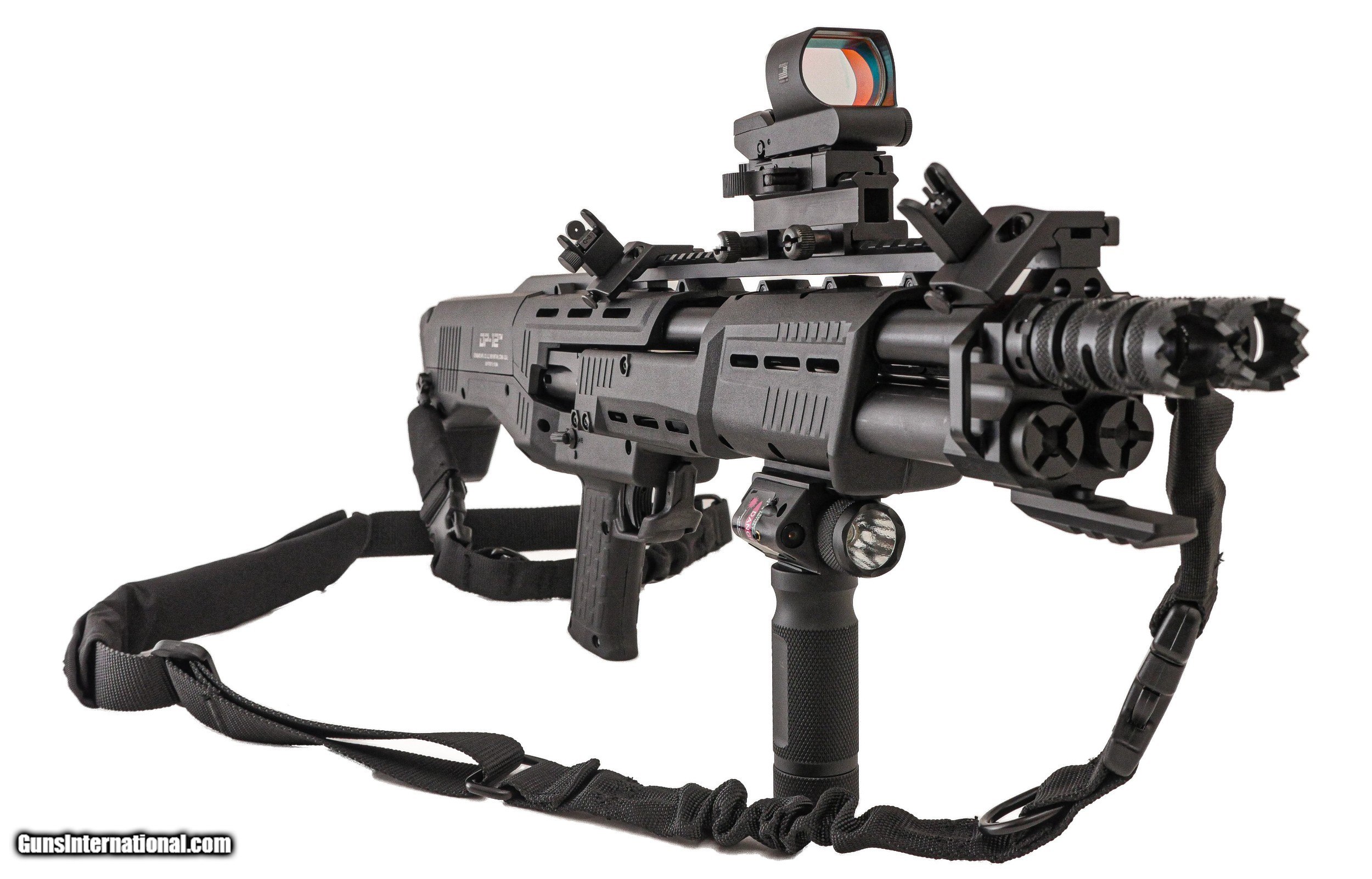 Description: Standard Manufacturing Company has raised the bar with this extraordinary shotgun that truly is one of kind that was manufactured in a state of the art facility. The innovative design and guaranteed functionality is well ahead of its time. Extreme detail has been a priority from conception through production of these double barrel repeater shotguns. The first of its kind, a premium defense, double barreled, pump, 12 gauge shotgun that quickly fires 16 rounds. Designed for the most discerning shooters who demand extreme firepower and require consistent reliability. The stock has a QR code you can scan with your smart phone or tablet to down load the manual and other information. Please be sure and fill out the warranty card and send it to Standard Manufacturing. The spreader choke tubes are designed to shoot a devastating pattern at 25 yards. The choke tubes have Tru-Choke thread patterns. Some pictures show door breachers, these are sold separately. The DP-12 provides accessory rails and slots that allow you to customize it with your own accessories. Ergonomically designed to balance the weight of a loaded gun for quick and efficient handling with minimal recoil. **PLEASE NOTE: This item MUST be shipped to Licensed Firearms Dealer. We will contact you for a copy of the FFL that you would like to use to transfer this firearm. ** Specs: Caliber: 12 Gauge Overall Length: 29.5" Weight (unloaded): 9 pounds 12 ounces Barrels: 2 x 18 7/8”, chambered for 2 ¾” or 3" shells Chokes: Both barrels include spreader choke tubes with Tru-Choke thread pattern Capacity: 14 rounds in magazine tubes + 2 in chambers - 16 total with indicator windows Action: pump action with two shots from single trigger, inline shell feeding Material: Machined from aircraft grade 7075 aluminum, Thermal coated receiver Controls: Ambidextrous safety, ambidextrous pump slide release Grip: Co-Molded non-slip rubber pistol grip, composite front vertical grip Stock: Synthetic stock Forend: Composite material with slots for MOE Rails Recoil Pad: Rubber with dual spring shock absorbing recoil mechanism Sling Points: Front sling attachment, sling swivel attachment on stock The Works Package #1 Includes: DP2000: Red Dot Reflex Sight DP2004: Aluminum Tactical Grip with Red Laser & Flashlight DP2010: 45° Offset Flip Up Sights DP2013: 1” High 8 Slot Riser DP2014: 4 piece MOE Rail Set DP2020: 2 Point Black Tactical Sling DP2024: 1” Swivel Set DP0209: Front Mounting Rail with Screw DP1999: Door Buster Door Breaching Chokes (DP1990 Stiletto Chokes available for an additional $75) Two Picatinny rails for accessories; seven slot rail on the bottom by the foregrip and a 13.75" 34 slot rail on top Assembly of the accessories is required Choke tube wrench Heavy duty lock Instruction booklet and warranty card $50.00 Shipping SOLD |