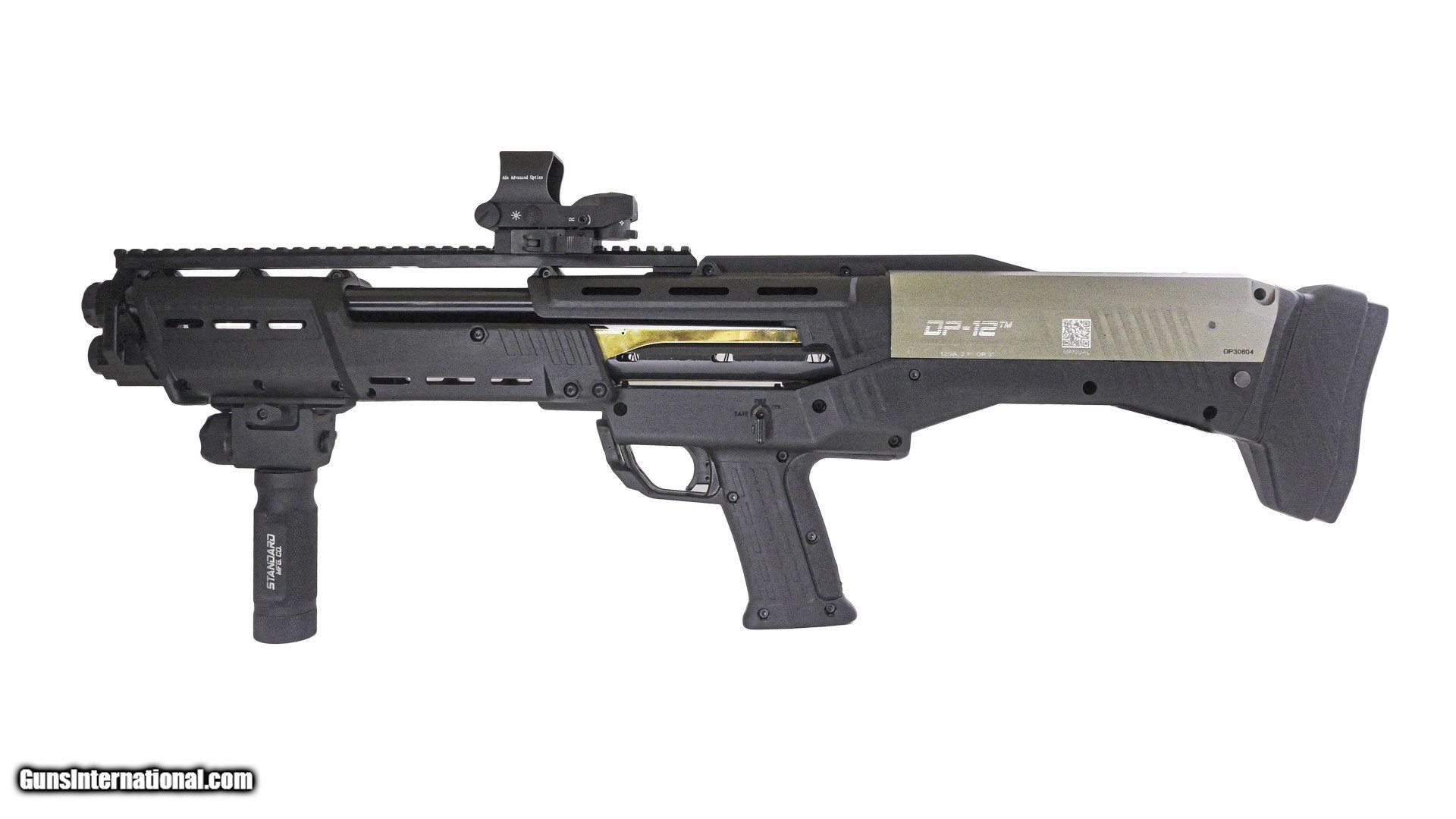 Description: THE DP12 PROFESSIONAL IS DESIGNED TO MEET THE MOST DEMANDING MILITARY AND LAW ENFORCEMENT REQUIREMENTS, THE EXTREME RELIABILTY OF THE DP-12 HAS BEEN FURTHER ENHANCED WITH THESE KEY FEATURES FOUND ONLY ON THE DP-12 PROFESSIONAL: AIRCRAFT GRADE ALUMINUM FRAME WITH MIL SPEC HARD ANODIZED FINISH ALL WEAR SURFACES PVD COATED FOR SMOOTH OPERATION AND CORROSION PROTECTION REFLEX SIGHT FEATURING MULTIPLE LEVELS OF BRIGTNESS HEAVY DUTY ALUMINUM FRONT GRIP WITH INTEGRAL LASER AND FLASH LIGHT MOUNTED TO RUGGED ALUMINUM PICATINNY RAIL HEAVY DUTY ALUMINUM MAGAZINE FOLLOWERS WITH A HARD COAT ANODIZED FINISH PRECISION HONED AND HAND LAPPED BORES AND CHAMBERS COMPLETELY HAND BUILT BY MASTER GUNSMITHS LIFETIME WARRANTY SOLD |