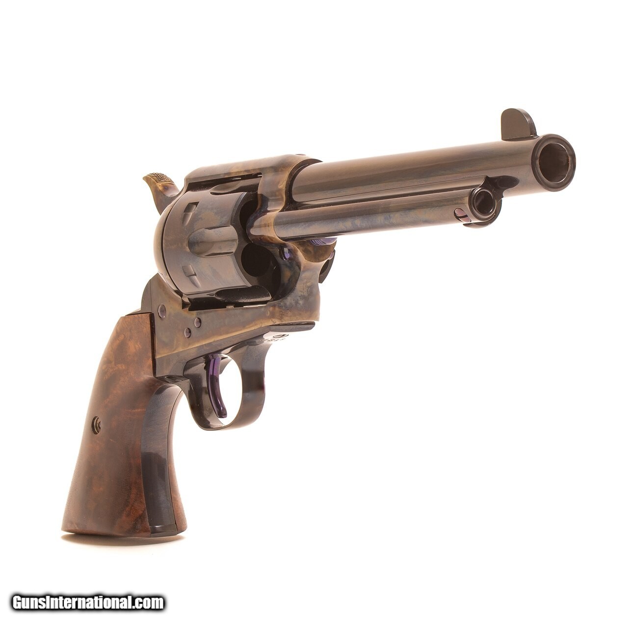 Description: Never before in history has an effort been put forth to produce the finest single action revolver. To start, this entire gun is made of solid 4140 steel; there are no inferior cast or metal injection molded parts used. No other maker of this type of gun can make such a claim. Additionally, the precision machining equipment used in the manufacture of our guns is the absolute finest in the industry and because the machining is done in-house, quality is carefully controlled. Even the very best parts are of little value without the hands and minds of experienced gunsmiths. The master gunsmiths here at Standard Manufacturing are versed in making iconic guns that include the Ansley H. Fox, Parker, and Model 21 double shotguns. Upon close inspection of our Single Action Revolver, you will immediately recognize that this gun is something very special. With its perfect fit between all of the parts to the hand polishing and stoning. From the deep blued finishes to the traditional bone and charcoal color case hardening on all of the metal surfaces.Even all of the screws are perfectly timed from north to south. Our Single Action Revolver is true to form, which is to say the man who designed this gun originally would immediately recognize it as his own, as would the legends of the Wild West. These guns are available for immediate delivery starting at $1,895, plus $35 shipping and handling to your local FFL dealer. As a special introductory and limited time offer, we are providing a lifetime warranty on these Single Action Revolvers. **NOW OFFERING 2 PIECE CHECKERED GRIPS AND FANCY WOOD ONE PIECE GRIPS.** Click here for Frequently Asked Questions Specifications and Features Action Type:Single Action, with cone shaped firing pin and no transfer bar Caliber:.45 LC Capacity:6 Barrel Length:4 ¾”, 5 ½”, 7 ½” Hammer Type:Spurred and bone and charcoal color case hardened Grips:Two Piece Walnut Engraving:None Sights:Fixed Weight:40 oz. (approx.) Finish:Frame is bone and charcoal color case hardened Barrel, cylinder, and metal parts are deep blued All screws and pins are fire blued. SOLD |
