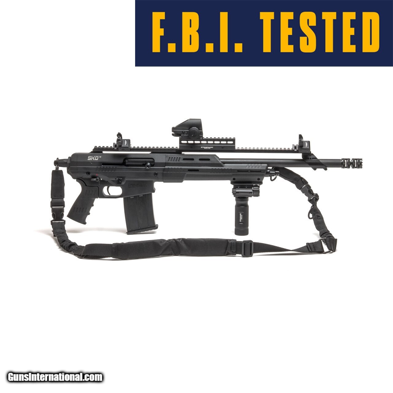 Description: THE ONLY SEMI-AUTOMATIC SHOTGUN USED BY THE FBI. Standard Manufacturing’s SKO Shorty, proudly made in the USA, offers superior firepower due to its fast semi-auto action and quick interchange magazines. It possesses the most reliable gas operated system available with smooth and flawless operation across a variety of loads. And even has bolt hold open after last round. Machined from 7075 aircraft grade aluminum with the latest technology in CNC machining, then Mil-Spec hard anodized, the SKO Shorty is both lightweight and durable. Internal components are salt bath nitride coated for optimum lubricity. Notable features include an ambidextrous safety, familiar AR-style controls for an easy transition to this platform, and a threaded muzzle to accept a variety of choke tubes, door breachers, and accessories. The length is over 28 3/4” and has an 18 5/8” barrel made from 4140 steel that accepts both 2 ¾” and 3” shot shells; which can be loaded in the included 5 round magazine with optional 2, 5, or 10 round magazines available. **PLEASE NOTE: This item MUST be shipped to Licensed Firearms Dealer. We will contact you for a copy of the FFL that you would like to use to transfer this firearm. ** Specs: Caliber: 12 Gauge Overall Length: 28 ¾” Weight (w/out mag): 7.14 lbs. Barrel: 18 7/8”, chambered for 2 ¾” and 3” shells Chokes: Tru-Choke thread pattern Capacity: 5 round magazine; optional 2, 5, 10 round mags available Action: Gas operated semi-automatic Material: Receivers machined from aircraft grade 7075 aluminum; Mil-Spec hard anodized Controls: Ambidextrous Safety, AR-style mag and bolt release Grip: Polymer; accepts most AR-style grips Forend: Composite material with slots for MOE and bolt on rails; INCLUDES forward vertical grip The Works Package includes: Reflex Sight Aluminum Tactical Grip with Red Laser & Flashlight Flip up Iron AR-15 Style Backup Sights 1” High 13 Slot Riser 45° Offset Sight Mounts(2) 2 Point Black Tactical Sling 1” Swivel Set Top Rail Set Door Buster Door Breaching Chokes (DP1990 Stiletto Chokes available for an additional $75) THE SKO SHORTY IS UNAVAILABLE TO PURCHASE IN THE STATES OF NEW YORK AND CALIFORNIA. SOLD |