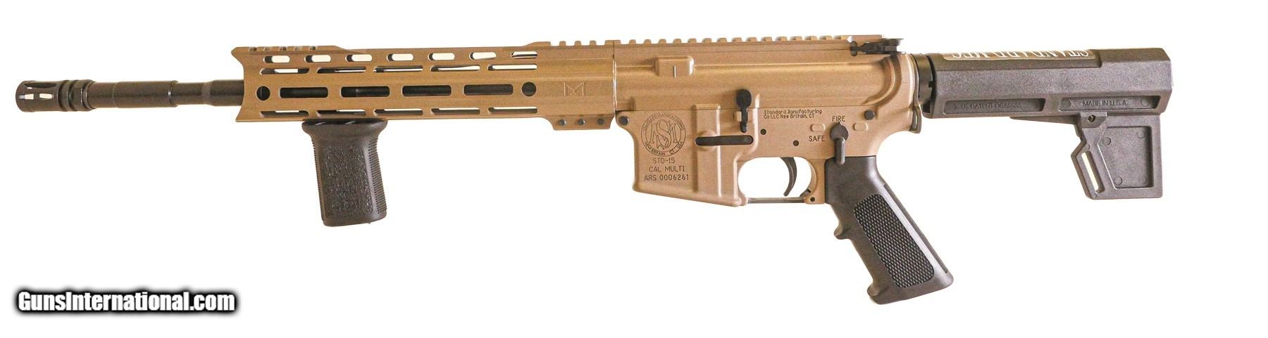Description: The STD Model 15 CTA 5.56 NATO Version features a 14.5 1/8" twist barrel with Nickel Boron extension and an adjustable Shockwave Industries Blade 2.0 Stabalizer. This model also has a BCM Keymod Grip, which is one of the lightest Keymod handguards on the market, weighing only 11 ounces. **PLEASE NOTE: This item MUST be shipped to Licensed Firearms Dealer. We will contact you for a copy of the FFL that you would like to use to transfer this firearm. This product is available for purchase in Connecticut as a "CT Other" Firearm** Specs: Weight: 5 lbs. 14 oz. Length: 30 ¼” collapsed, 33 ½” Extended Action: Semi-Auto Direct Impingement Caliber: 5.56 NATO Twist Rate: 1/8 RH Twist Muzzle Device: A2 Flash Hider Barrel: 14.5”, 4150 CMV, QPQ Nitride Handguard: Standard Mfg. Co. 10” Keymod Super Light Rail Receiver Material: Forged, Mil-Spec 7076-T6 Aluminum with Type 3 Hard Coat Anodizing Bolt Carrier: Phosphate M16 BCG Bolt: Phosphate Bolt, MPI tested Gas System: Pistol Length with Low-Profile Gas Block Charging Handle: Standard Mil-Spec Brace: KAK Industries Shockwave 2.0 Stabilizer Receiver End Plate: Ambi-Single Point Sling Loops Buffer: Standard Weight Trigger: Stainless Steel, Mil-spec Single Stage Grip: Standard Magazine: 10 round Mission First Tactical Polymer Magazine Safety Selector: Left Hand (switchable to RH) Sights: None SOLD |